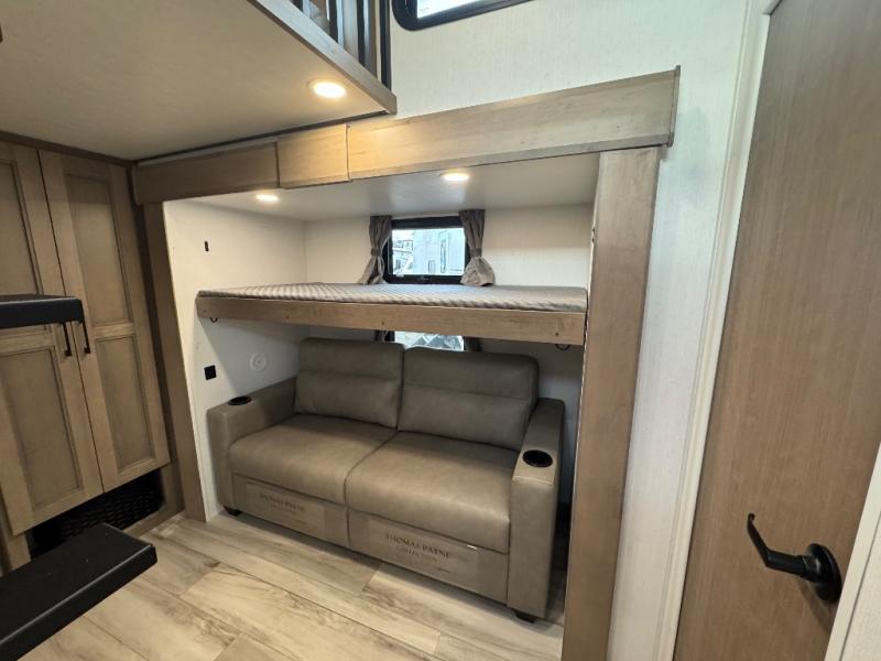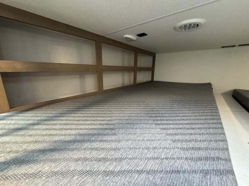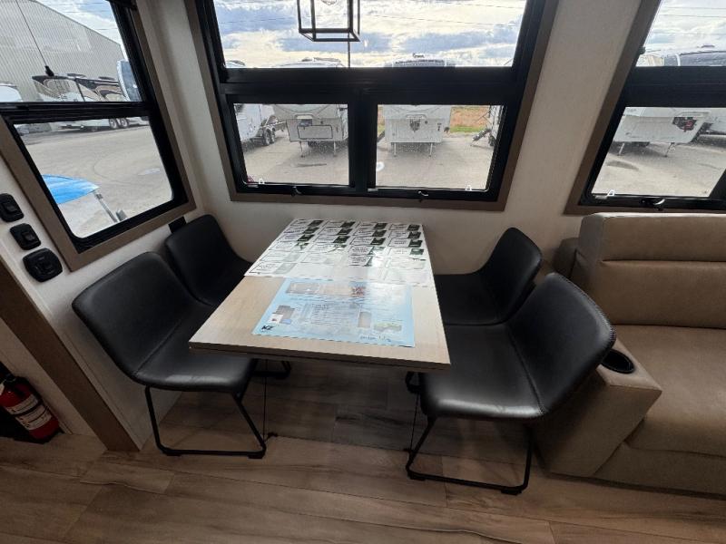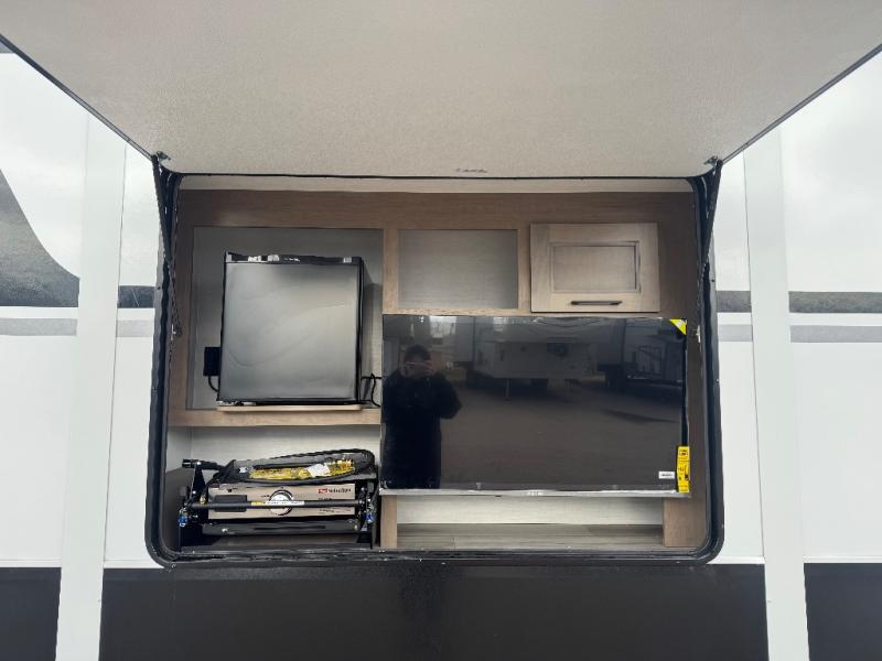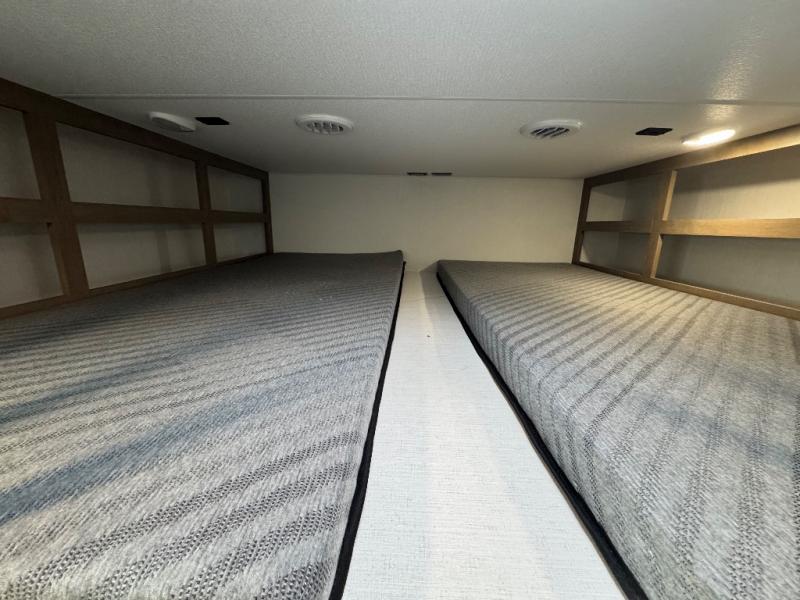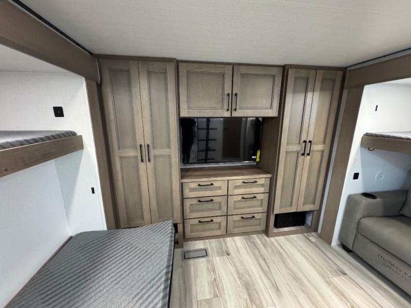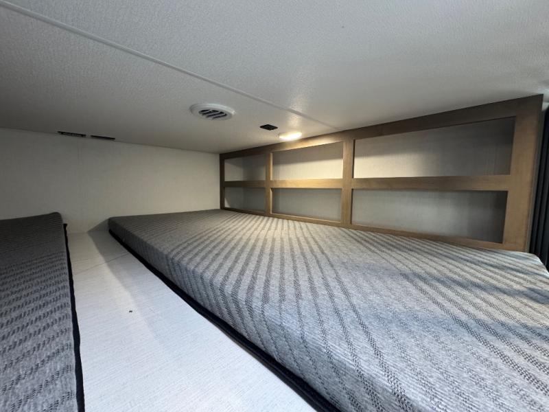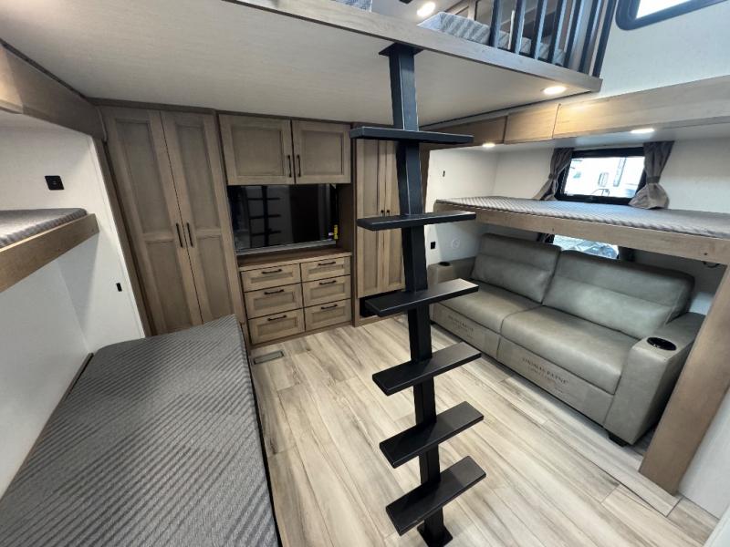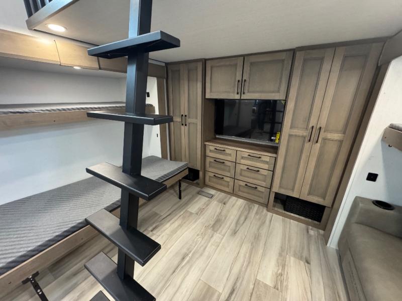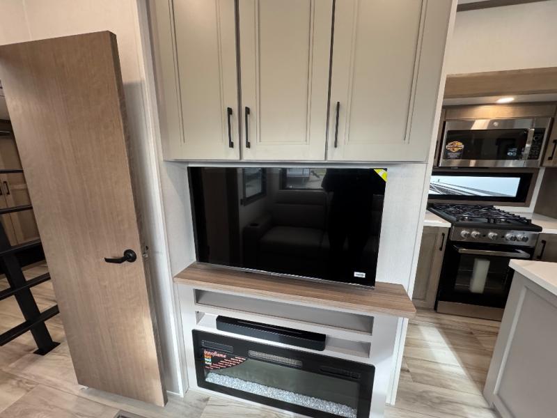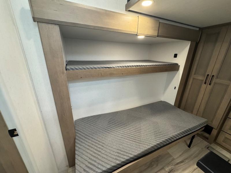 All of your friends and family can camp together in this fifth wheel! It features a rear private bunkhouse with a bunk above a hide-a-bed sofa, a full bathroom with a 30" x 36" shower, and an entertainment center with wardrobes on either side. There is also a folding bunk and a bunk over the outside kitchen. Across from the hide-a-bed sofa is an entertainment center with a 40" fireplace and a 43" smart TV to watch your favorite movies at night. The kitchen island will allow you to cook with ease and you can prepare your best meals with the four burner range with a 24" oven. The second bathroom has a residential shower with a seat and a linen closet to keep your towel close. Enjoy a good night's rest on the king bed slide in the front private bedroom which also has a dresser and a front wardrobe with washer and dryer prep!