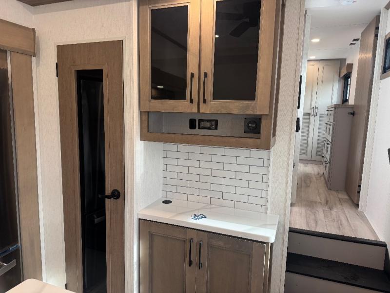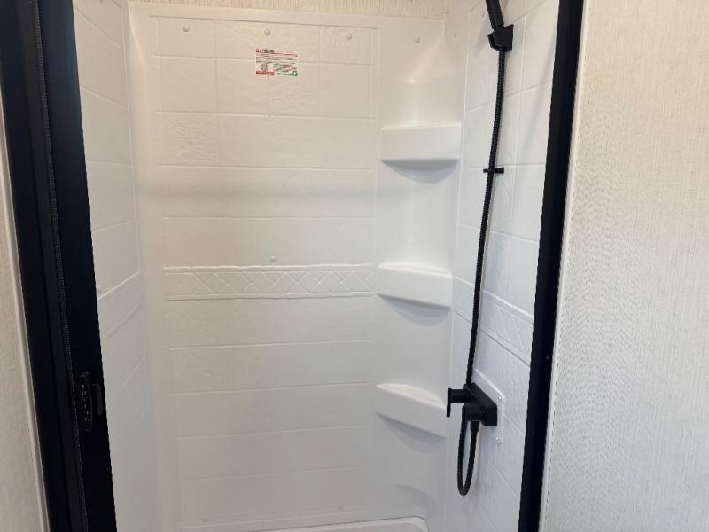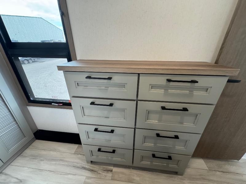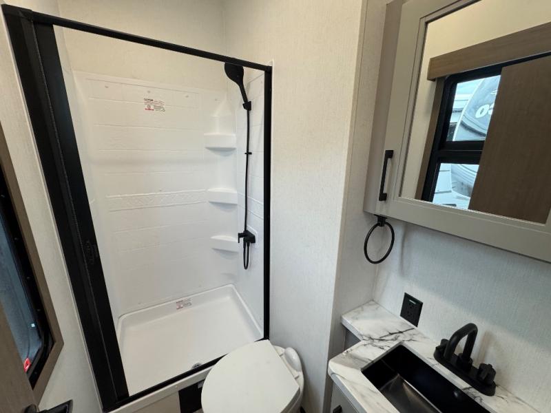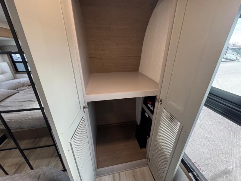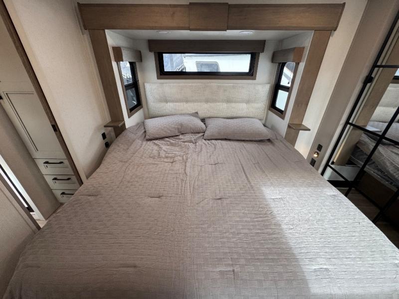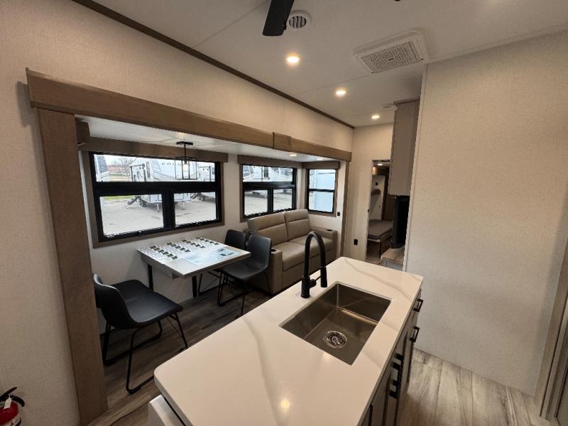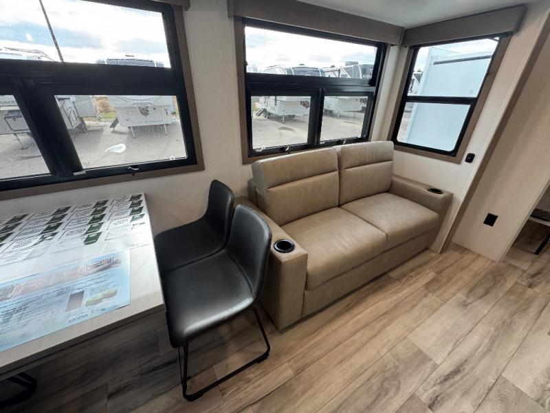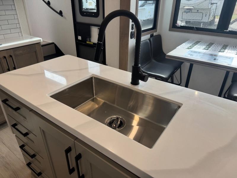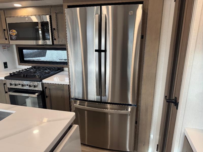 All of your friends and family can camp together in this fifth wheel! It features a rear private bunkhouse with a bunk above a hide-a-bed sofa, a full bathroom with a 30" x 36" shower, and an entertainment center with wardrobes on either side. There is also a folding bunk and a bunk over the outside kitchen. Across from the hide-a-bed sofa is an entertainment center with a 40" fireplace and a 43" smart TV to watch your favorite movies at night. The kitchen island will allow you to cook with ease and you can prepare your best meals with the four burner range with a 24" oven. The second bathroom has a residential shower with a seat and a linen closet to keep your towel close. Enjoy a good night's rest on the king bed slide in the front private bedroom which also has a dresser and a front wardrobe with washer and dryer prep!