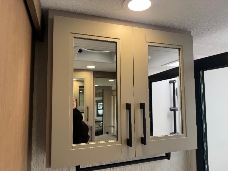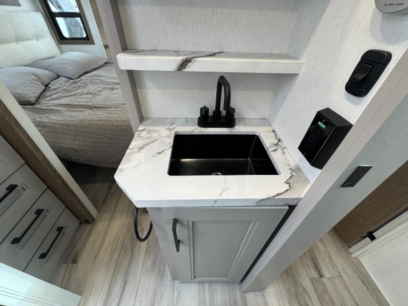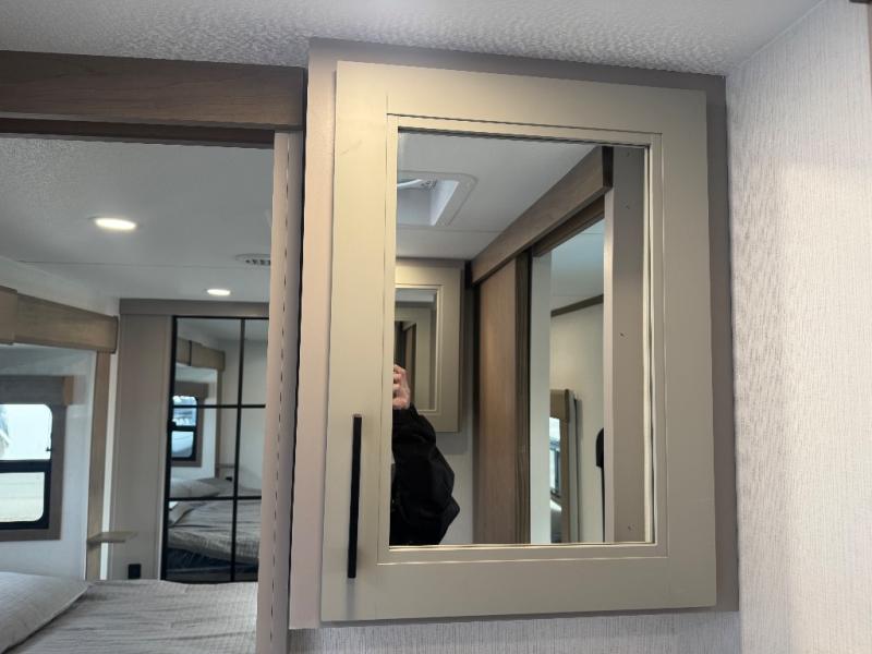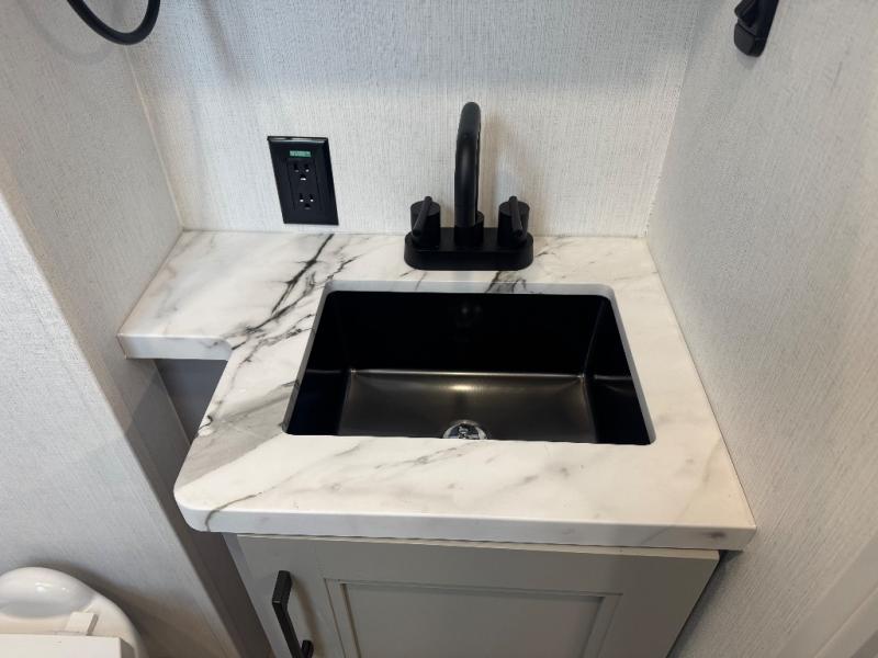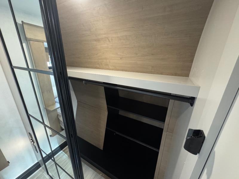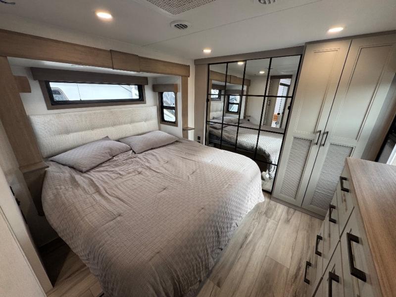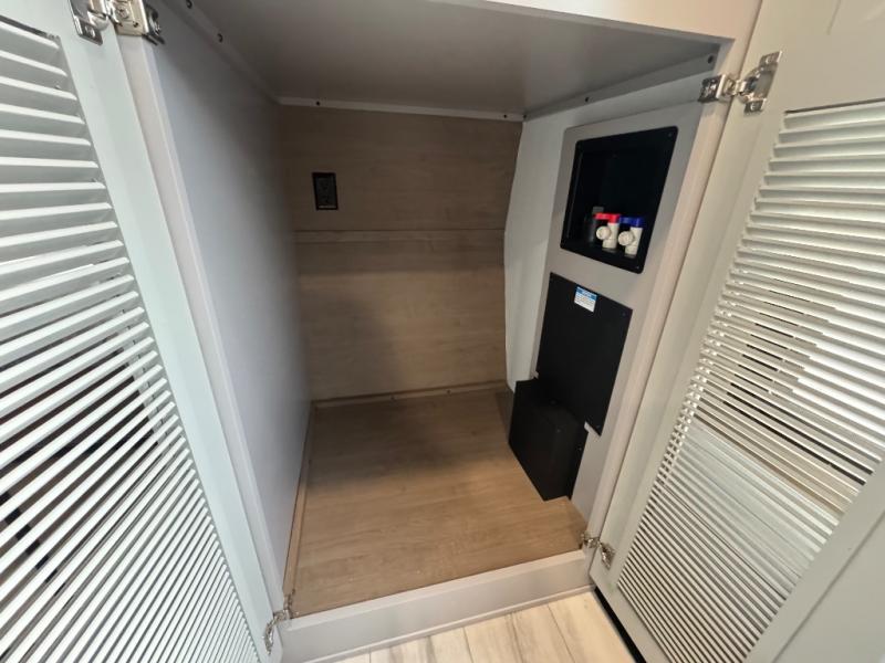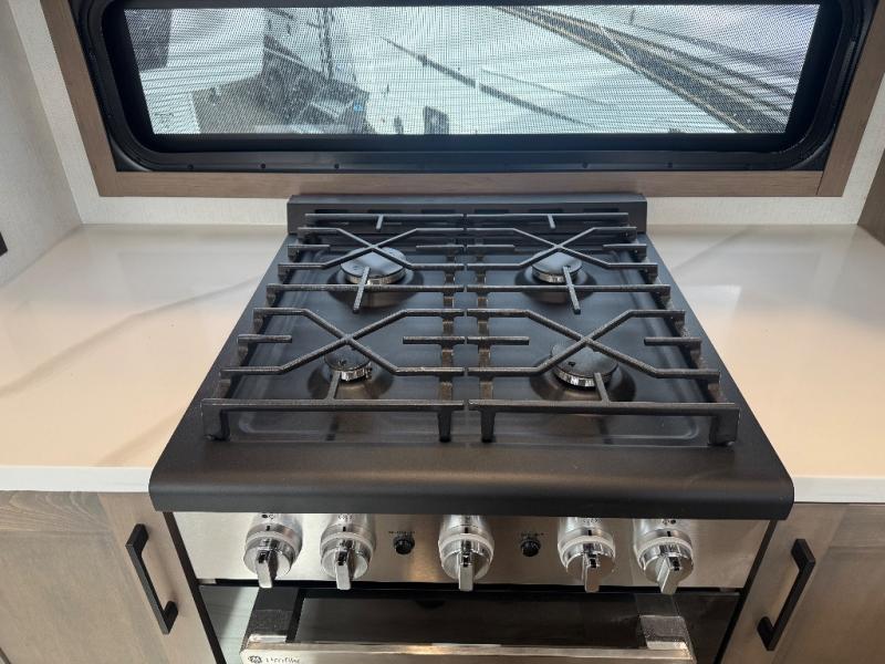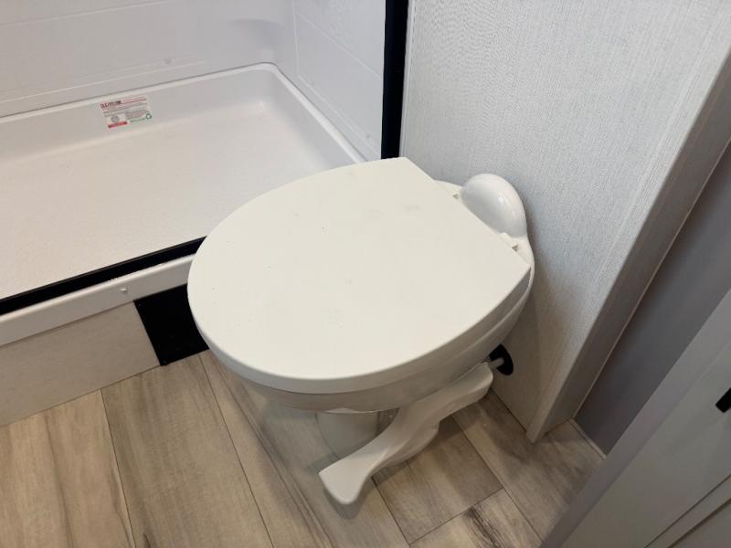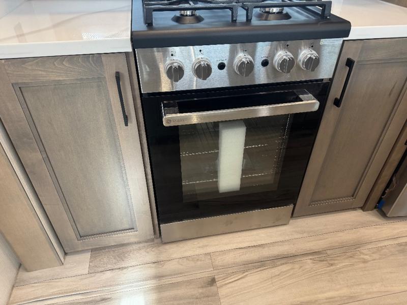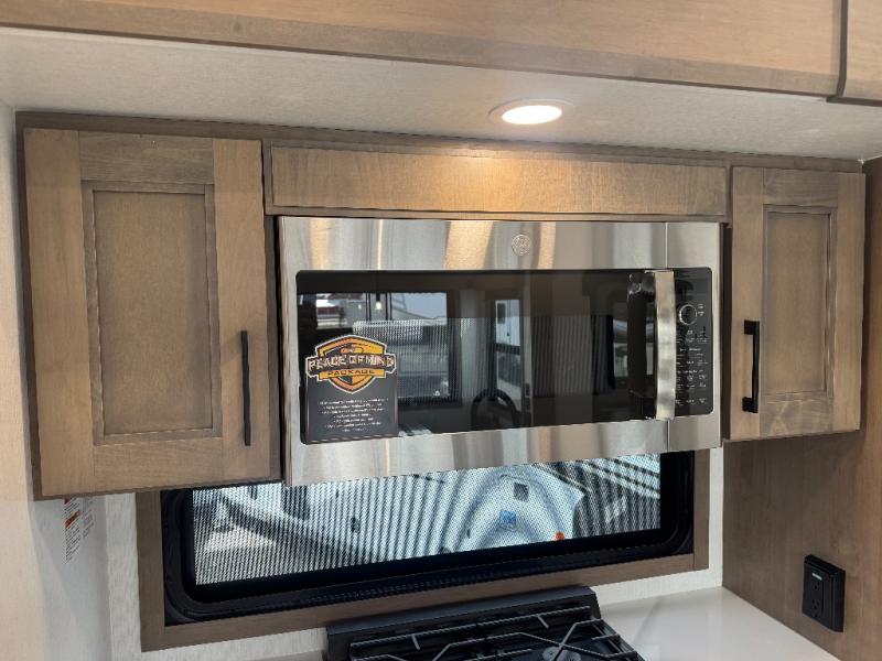 All of your friends and family can camp together in this fifth wheel! It features a rear private bunkhouse with a bunk above a hide-a-bed sofa, a full bathroom with a 30" x 36" shower, and an entertainment center with wardrobes on either side. There is also a folding bunk and a bunk over the outside kitchen. Across from the hide-a-bed sofa is an entertainment center with a 40" fireplace and a 43" smart TV to watch your favorite movies at night. The kitchen island will allow you to cook with ease and you can prepare your best meals with the four burner range with a 24" oven. The second bathroom has a residential shower with a seat and a linen closet to keep your towel close. Enjoy a good night's rest on the king bed slide in the front private bedroom which also has a dresser and a front wardrobe with washer and dryer prep!