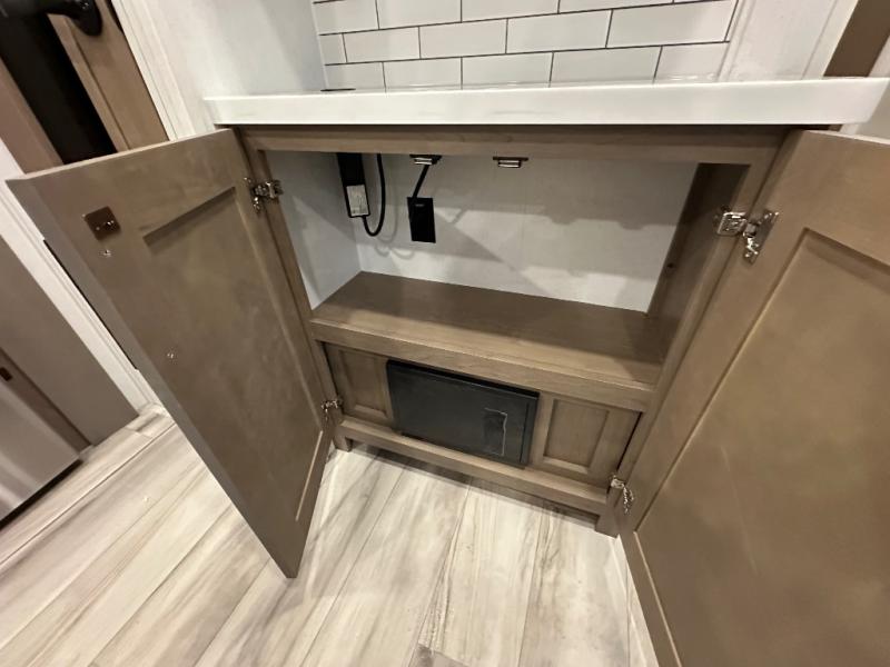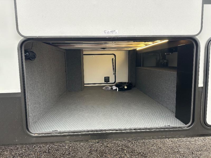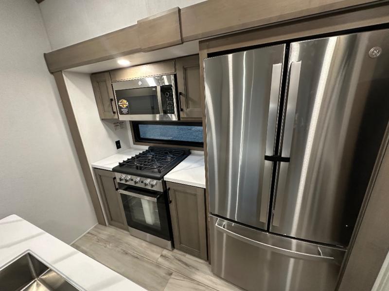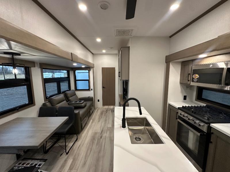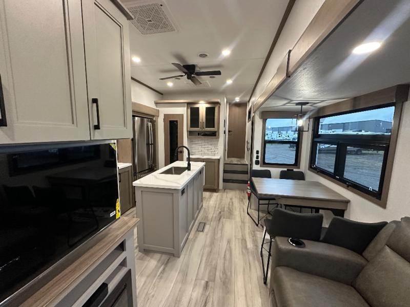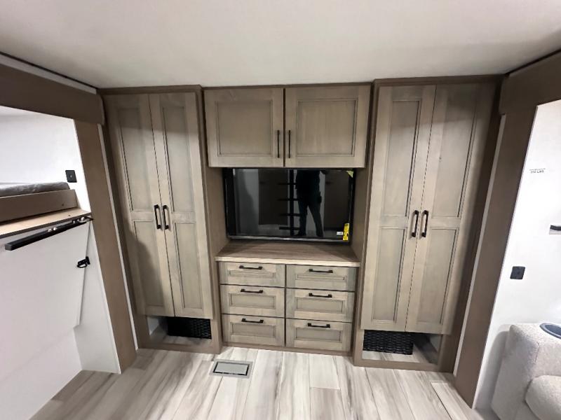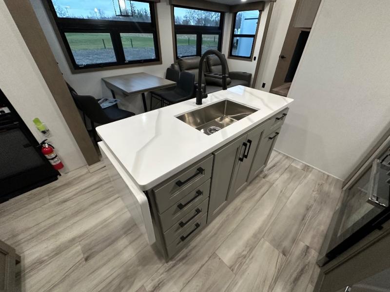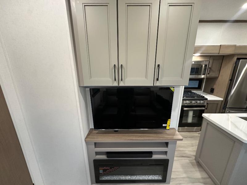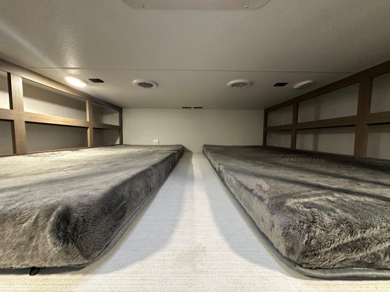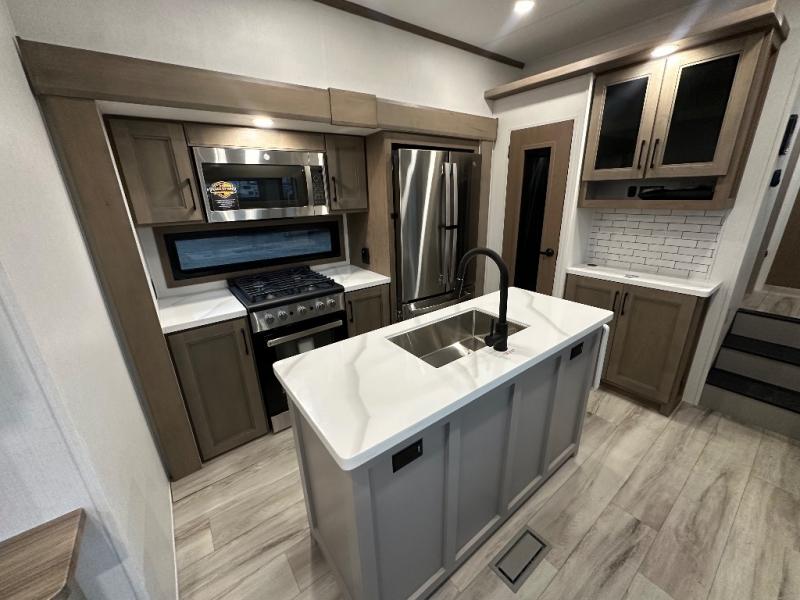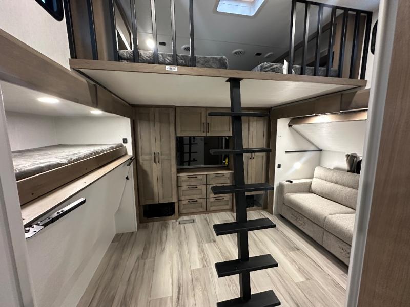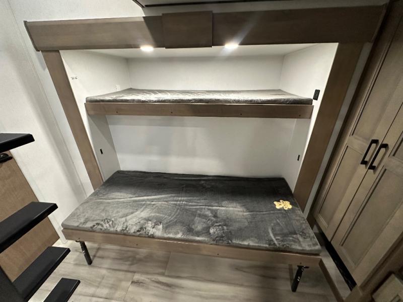 All of your friends and family can camp together in this fifth wheel! It features a rear private bunkhouse with a bunk above a hide-a-bed sofa, a full bathroom with a 30" x 36" shower, and an entertainment center with wardrobes on either side. There is also a folding bunk and a bunk over the outside kitchen. Across from the hide-a-bed sofa is an entertainment center with a 40" fireplace and a 43" smart TV to watch your favorite movies at night. The kitchen island will allow you to cook with ease and you can prepare your best meals with the four burner range with a 24" oven. The second bathroom has a residential shower with a seat and a linen closet to keep your towel close. Enjoy a good night's rest on the king bed slide in the front private bedroom which also has a dresser and a front wardrobe with washer and dryer prep!