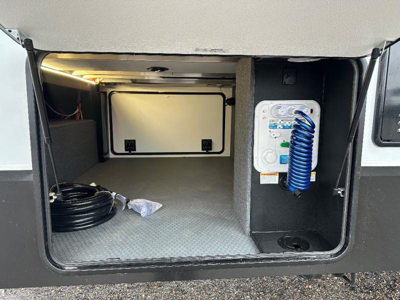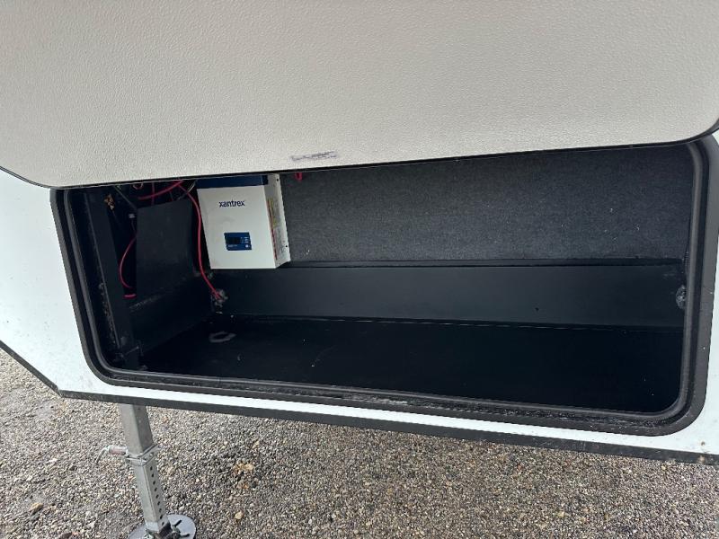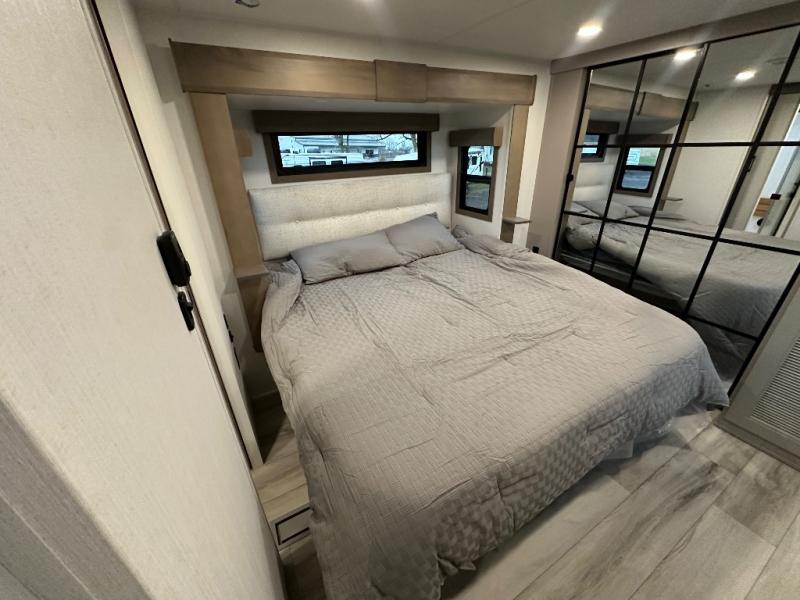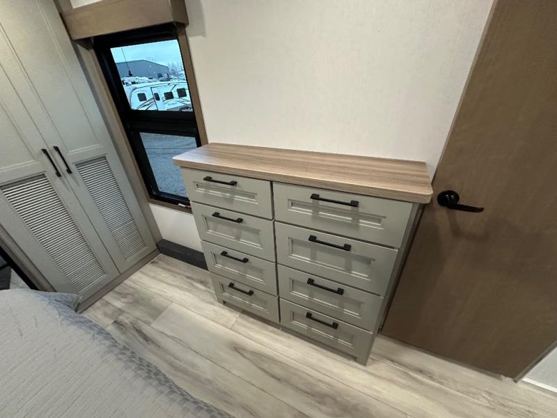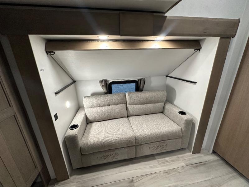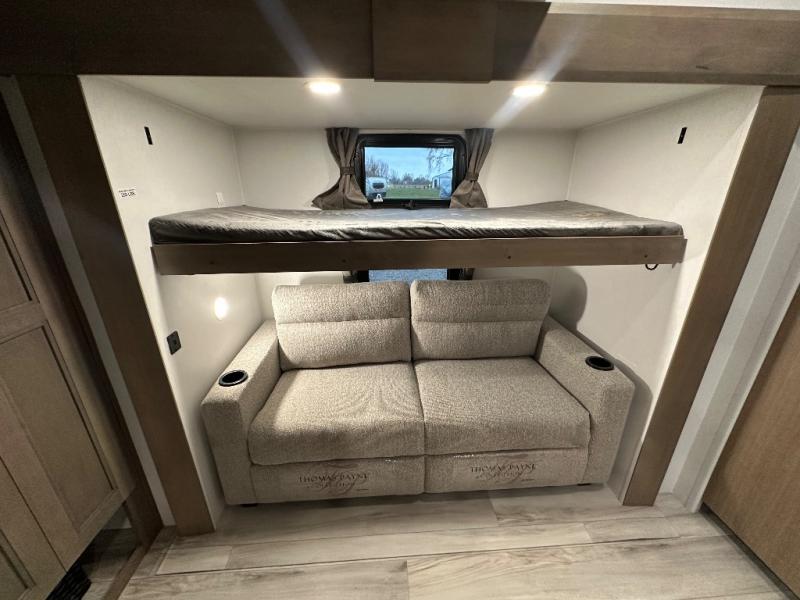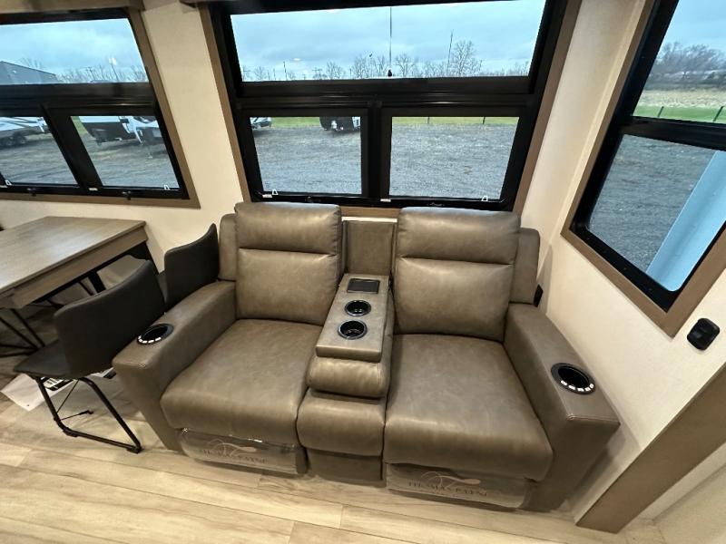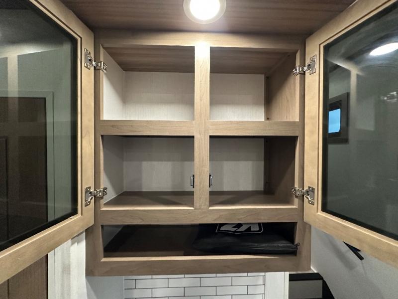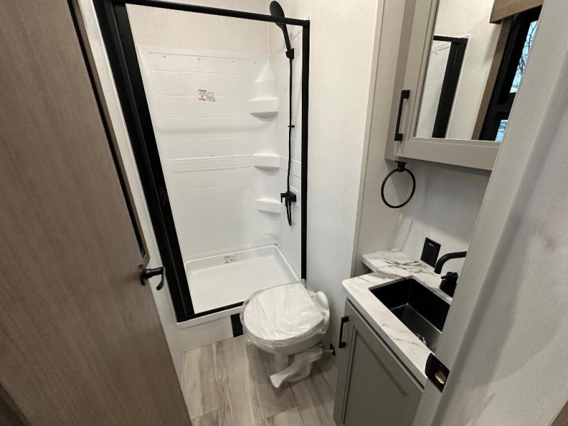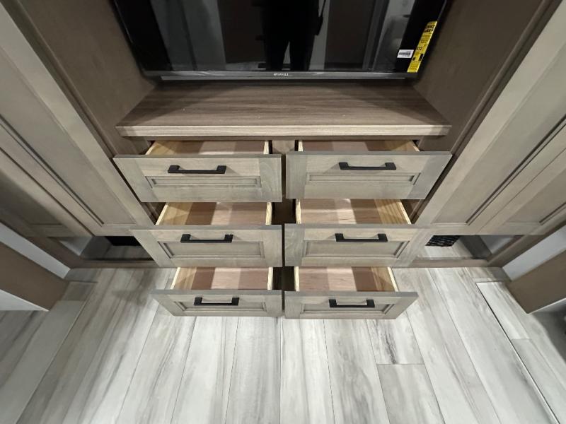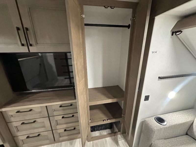 All of your friends and family can camp together in this fifth wheel! It features a rear private bunkhouse with a bunk above a hide-a-bed sofa, a full bathroom with a 30" x 36" shower, and an entertainment center with wardrobes on either side. There is also a folding bunk and a bunk over the outside kitchen. Across from the hide-a-bed sofa is an entertainment center with a 40" fireplace and a 43" smart TV to watch your favorite movies at night. The kitchen island will allow you to cook with ease and you can prepare your best meals with the four burner range with a 24" oven. The second bathroom has a residential shower with a seat and a linen closet to keep your towel close. Enjoy a good night's rest on the king bed slide in the front private bedroom which also has a dresser and a front wardrobe with washer and dryer prep!