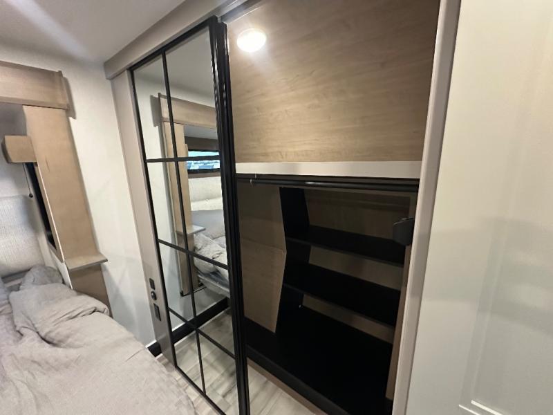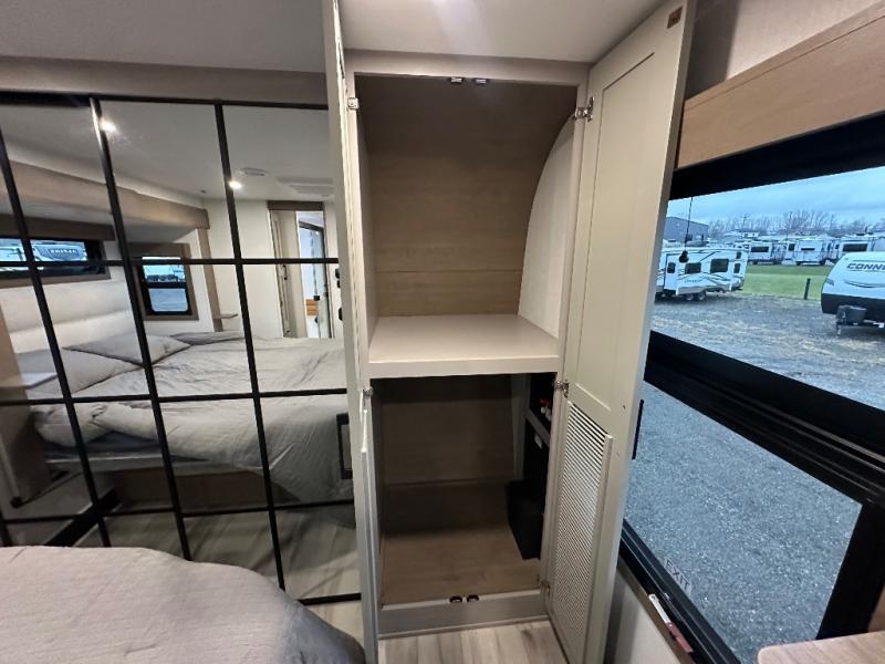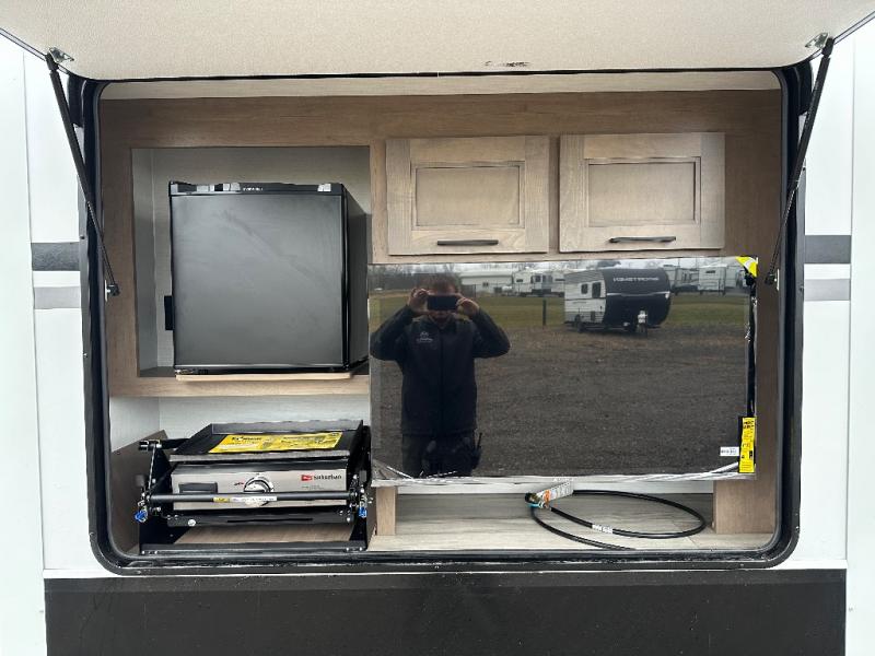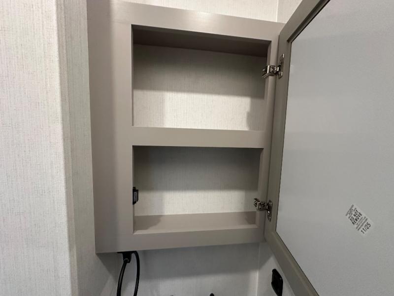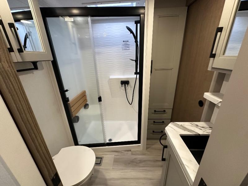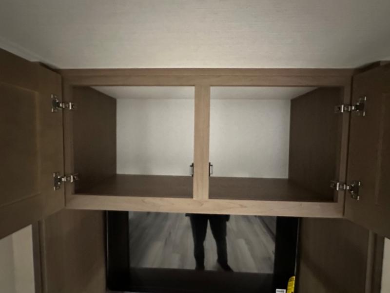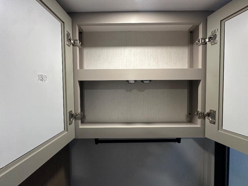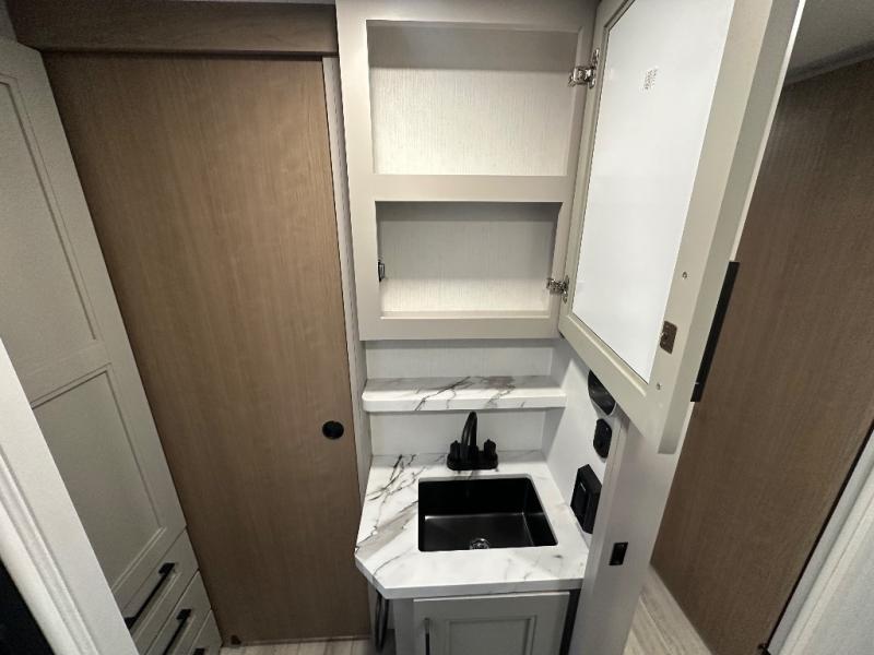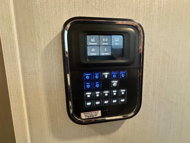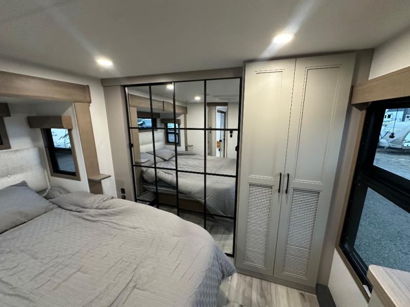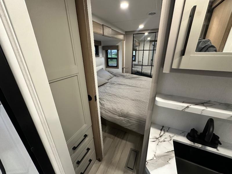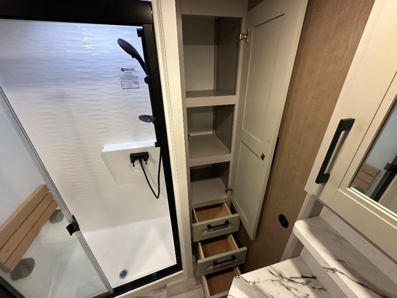 All of your friends and family can camp together in this fifth wheel! It features a rear private bunkhouse with a bunk above a hide-a-bed sofa, a full bathroom with a 30" x 36" shower, and an entertainment center with wardrobes on either side. There is also a folding bunk and a bunk over the outside kitchen. Across from the hide-a-bed sofa is an entertainment center with a 40" fireplace and a 43" smart TV to watch your favorite movies at night. The kitchen island will allow you to cook with ease and you can prepare your best meals with the four burner range with a 24" oven. The second bathroom has a residential shower with a seat and a linen closet to keep your towel close. Enjoy a good night's rest on the king bed slide in the front private bedroom which also has a dresser and a front wardrobe with washer and dryer prep!