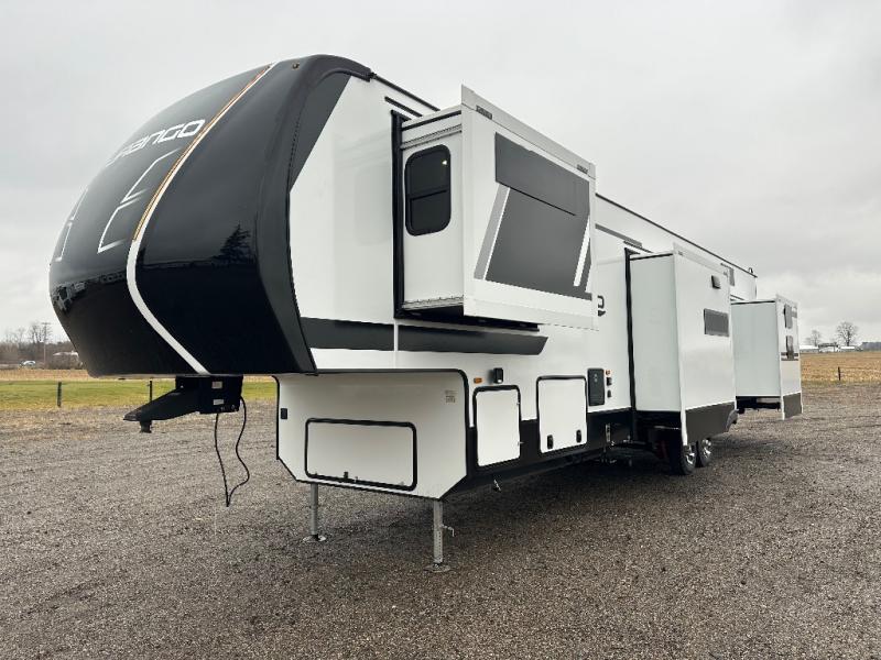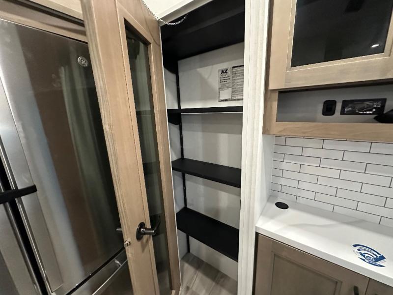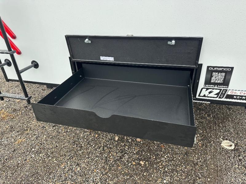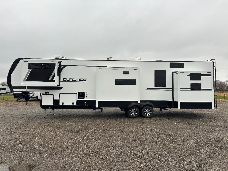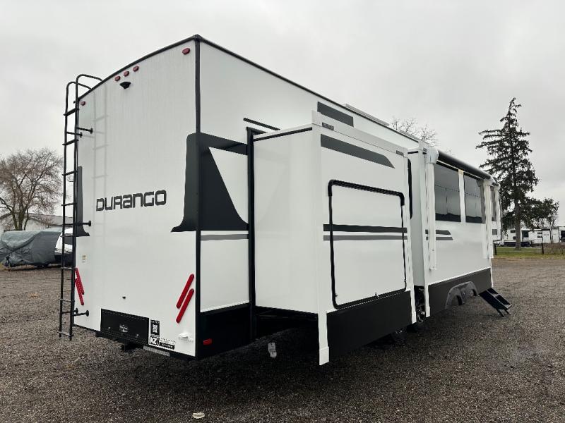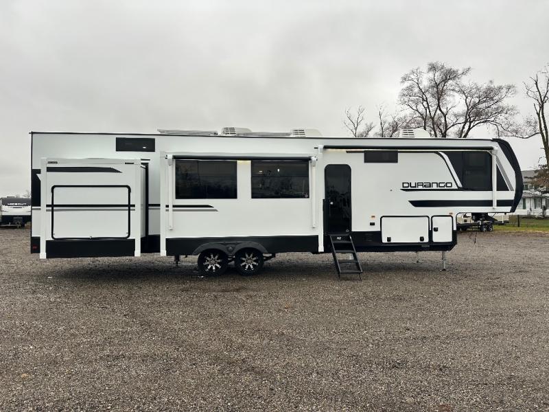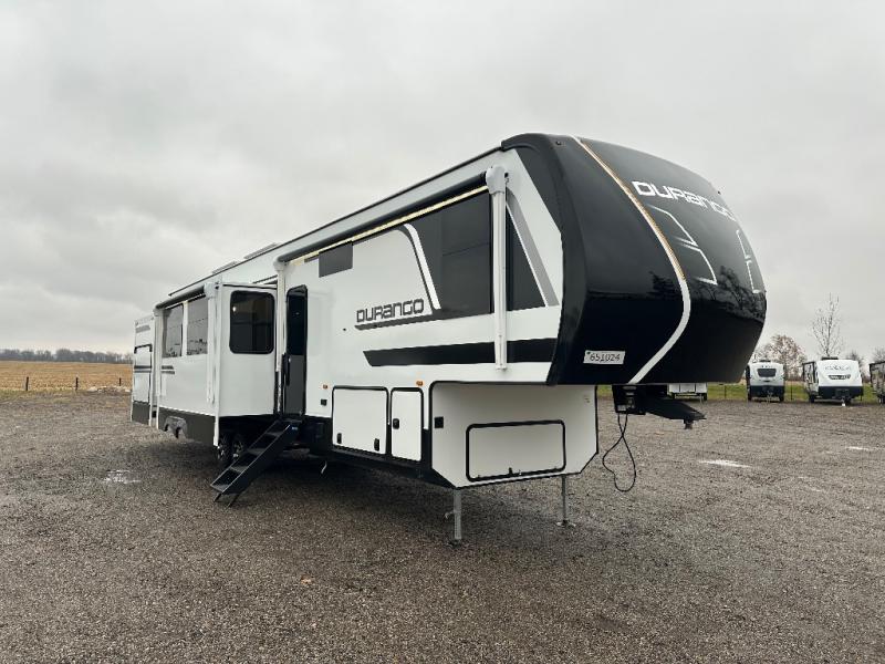 Enjoy full time living, an affordable price, and a wide body construction for more living space with every one of these KZ Durango light high-profile fifth wheels! These luxury units can be used all year round with the all-weather insulation package, the 3" x 14" foam-core in-floor straight-line heating system with a 35,000 BTU furnace, and the 15,000 BTU ducted roof A/C which optimizes the airflow by an average of 40% for better performance, cooling time, and reduction of noise. A few other construction features you will appreciate include a one piece, seamless walk-on Tufflex roofing material, Pex® in-floor heated waterlines, and a Lamilux® gelcoat fiberglass exterior. Inside, blancher maple & morel fog cabinetry , a king size bed, and smart TVs will have you feeling like you never left home!