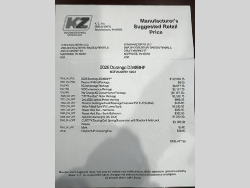 New 2026 KZ Durango D348BHF Fifth Wheel