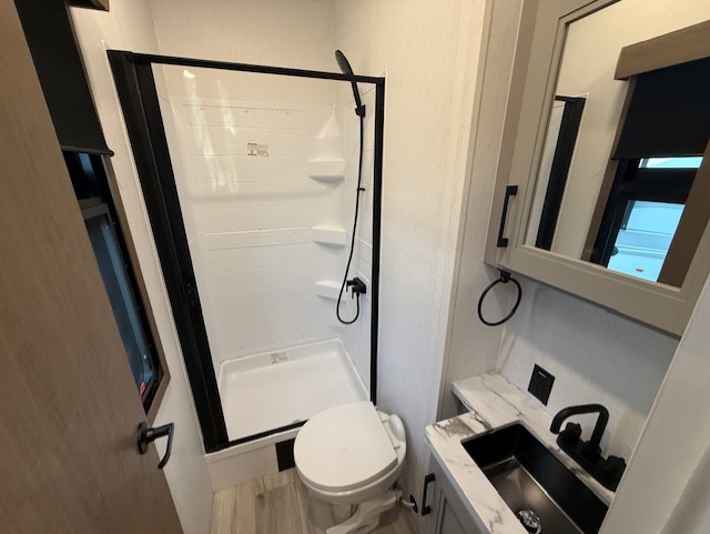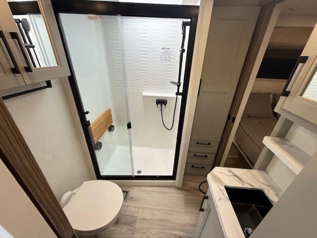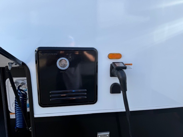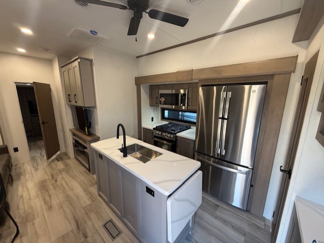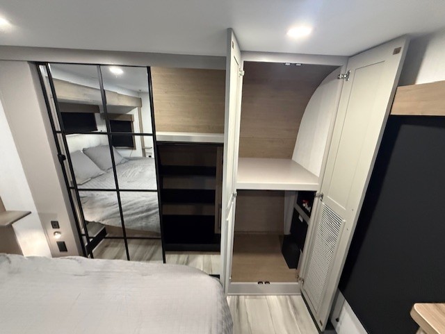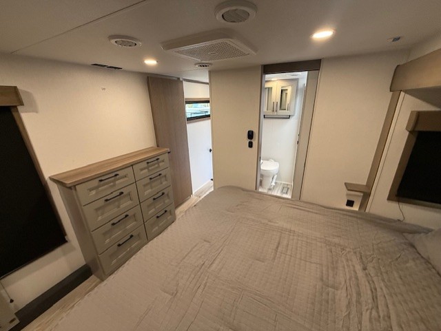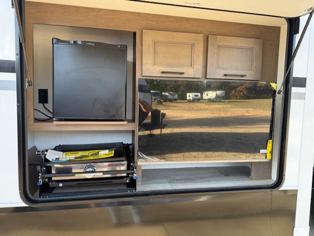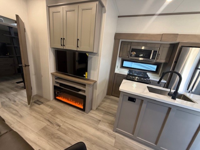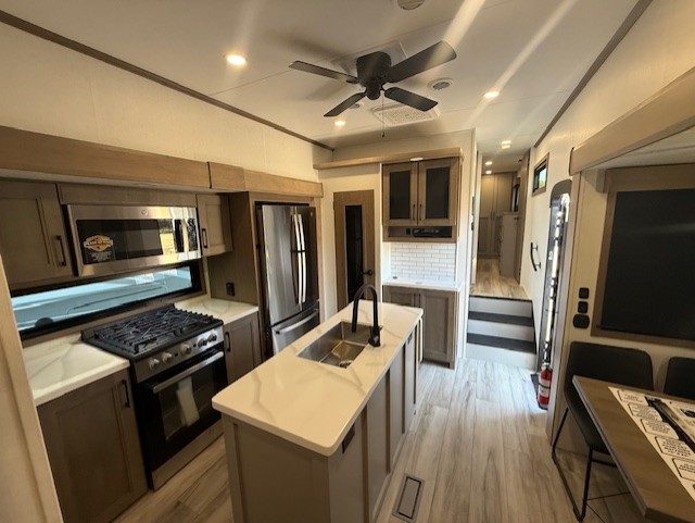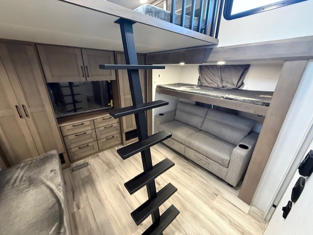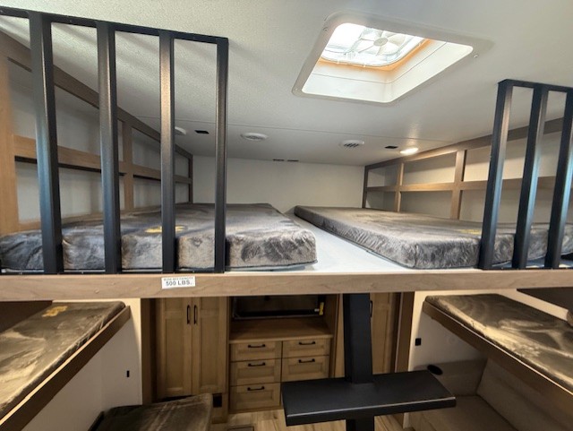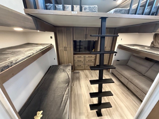 All of your friends and family can camp together in this fifth wheel! It features a rear private bunkhouse with a bunk above a hide-a-bed sofa, a full bathroom with a 30" x 36" shower, and an entertainment center with wardrobes on either side. There is also a folding bunk and a bunk over the outside kitchen. Across from the hide-a-bed sofa is an entertainment center with a 40" fireplace and a 43" smart TV to watch your favorite movies at night. The kitchen island will allow you to cook with ease and you can prepare your best meals with the four burner range with a 24" oven. The second bathroom has a residential shower with a seat and a linen closet to keep your towel close. Enjoy a good night's rest on the king bed slide in the front private bedroom which also has a dresser and a front wardrobe with washer and dryer prep!