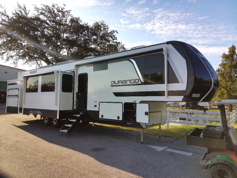 Enjoy full time living, an affordable price, and a wide body construction for more living space with every one of these KZ Durango light high-profile fifth wheels! These luxury units can be used all year round with the all-weather insulation package, the 3" x 14" foam-core in-floor straight-line heating system with a 35,000 BTU furnace, and the 15,000 BTU ducted roof A/C which optimizes the airflow by an average of 40% for better performance, cooling time, and reduction of noise. A few other construction features you will appreciate include a one piece, seamless walk-on Tufflex roofing material, Pex® in-floor heated waterlines, and a Lamilux® gelcoat fiberglass exterior. Inside, blancher maple & morel fog cabinetry , a king size bed, and smart TVs will have you feeling like you never left home!