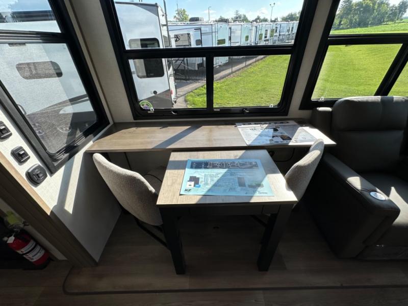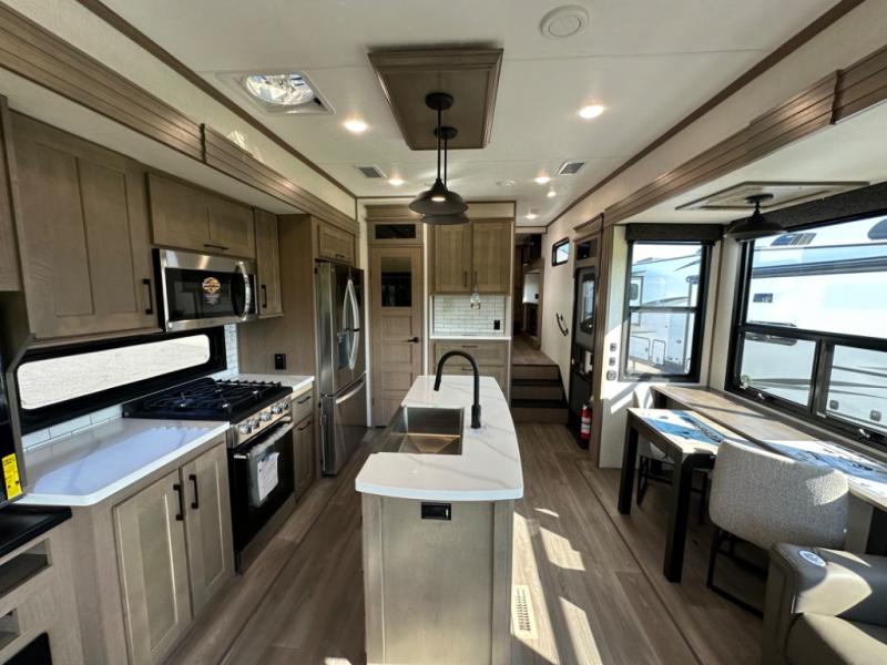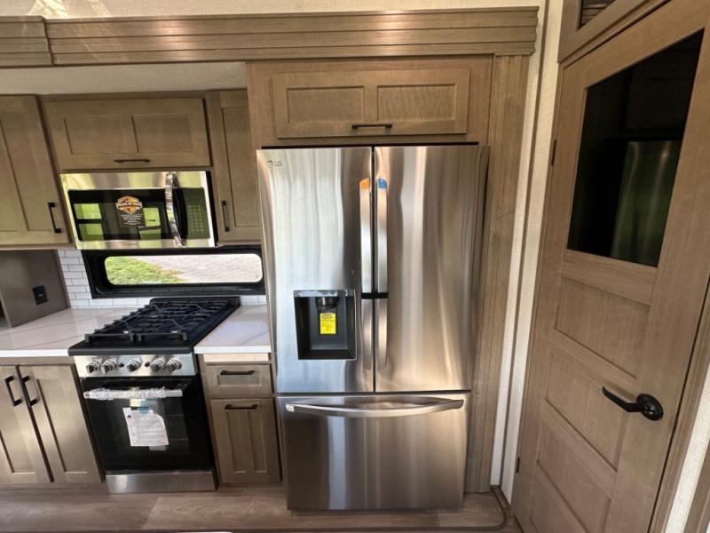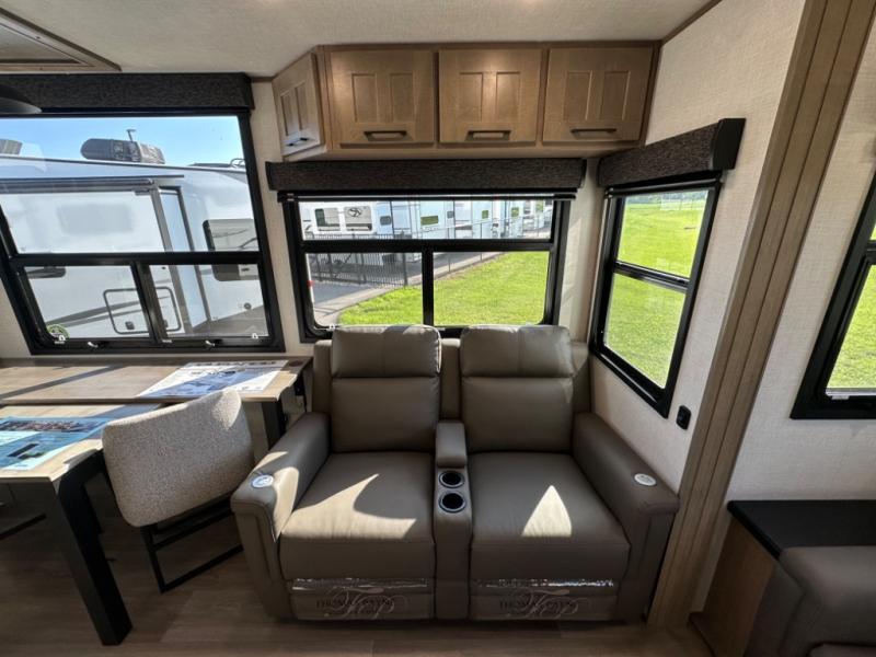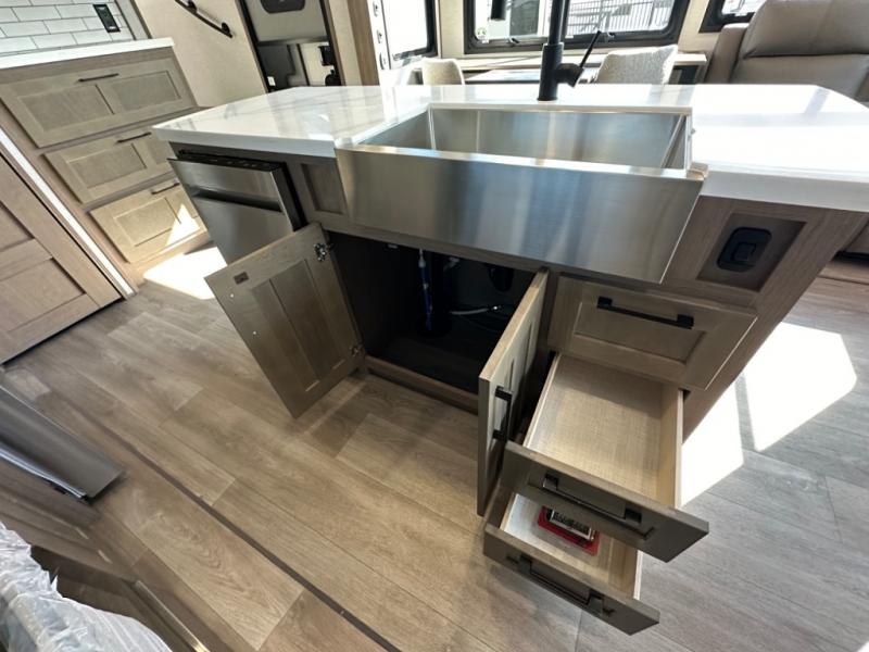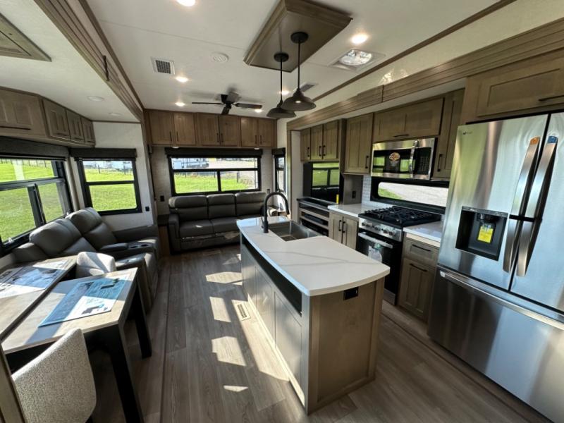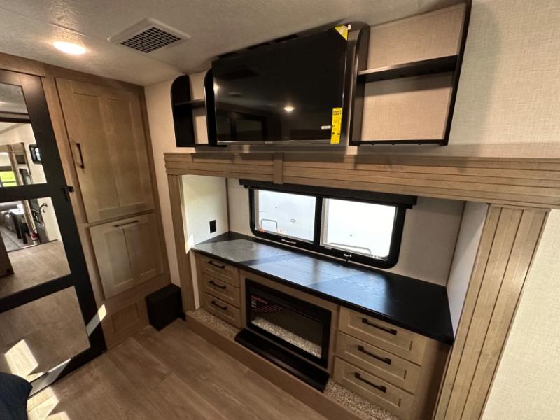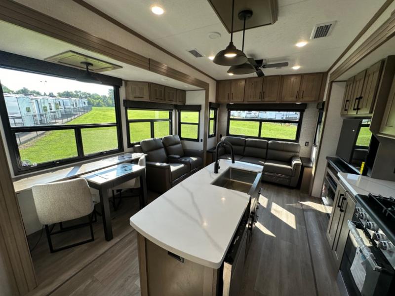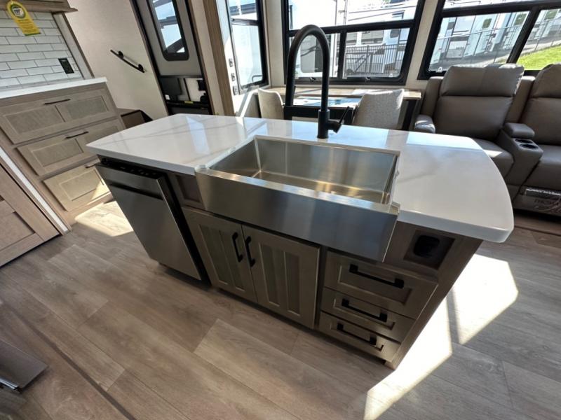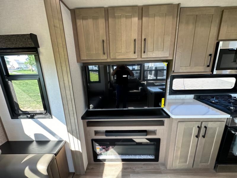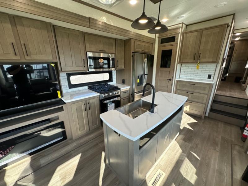 Camp wherever you want and stay as long as you desire with this full-time fifth wheel! You will love the spacious interior which includes a front bedroom with an electric tilt king bed slide with drawers underneath, a front wardrobe with washer and dryer prep, a closet with a built-in hamper, plus a slide out dresser with 32" Smart LED TV above. The full bathroom offers a residential shower with a seat plus linen storage, and the kitchen gives the cook a dream kitchen that includes a farmhouse stainless steel sink and dishwasher in the center island, a 26 cu. ft. house refrigerator with a 2,000W inverter, and more. The 50" Smart LED TV with a fireplace below can be seen from the sliding table/desk and chairs, the comfortable theater seats and the hide-a-bed sofa.