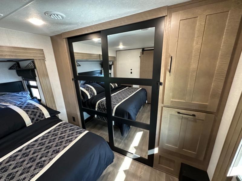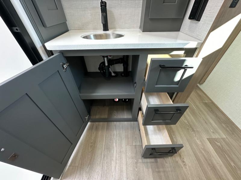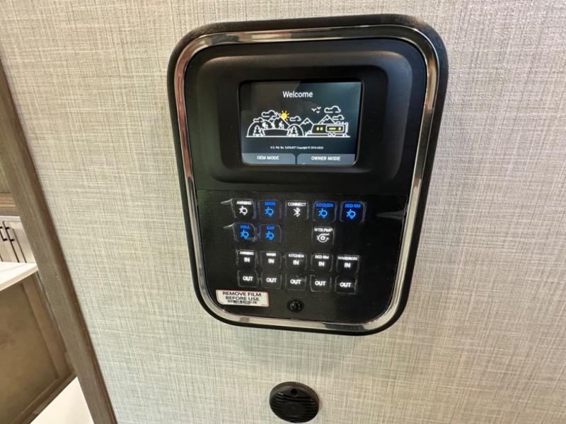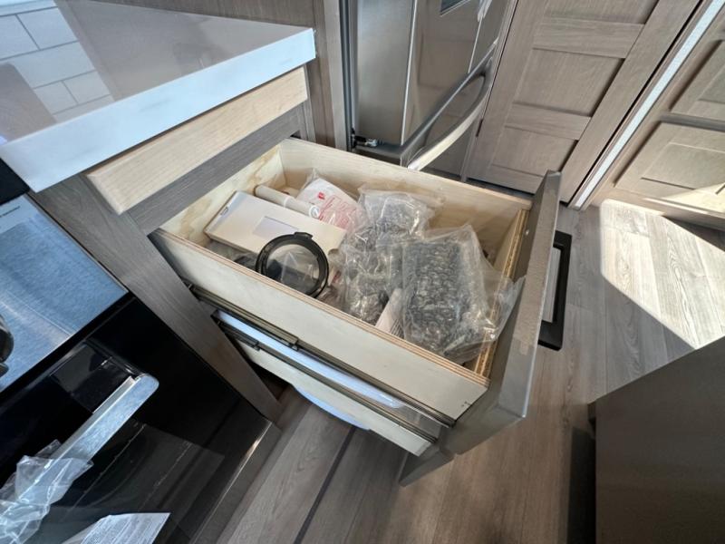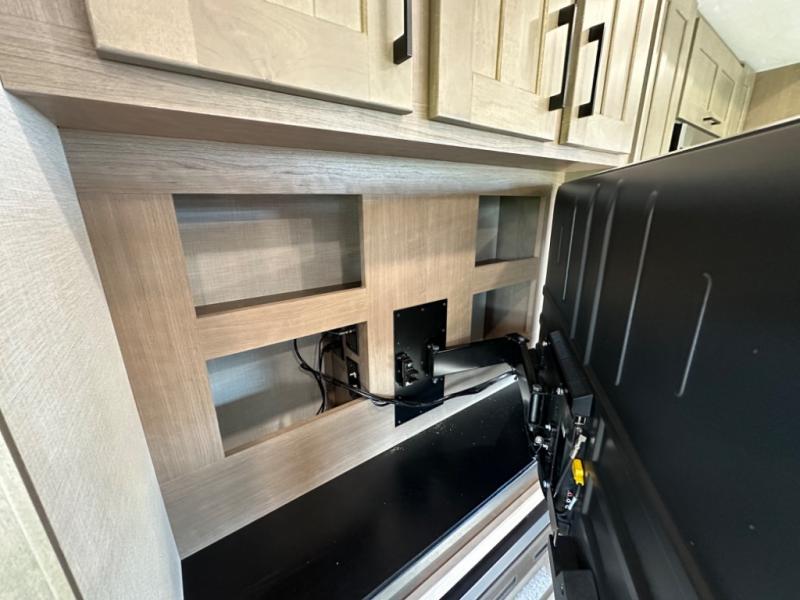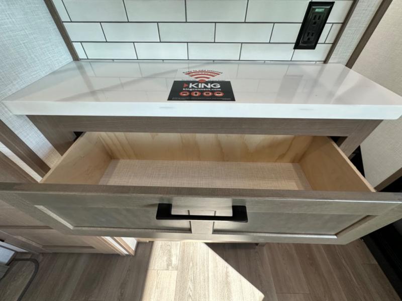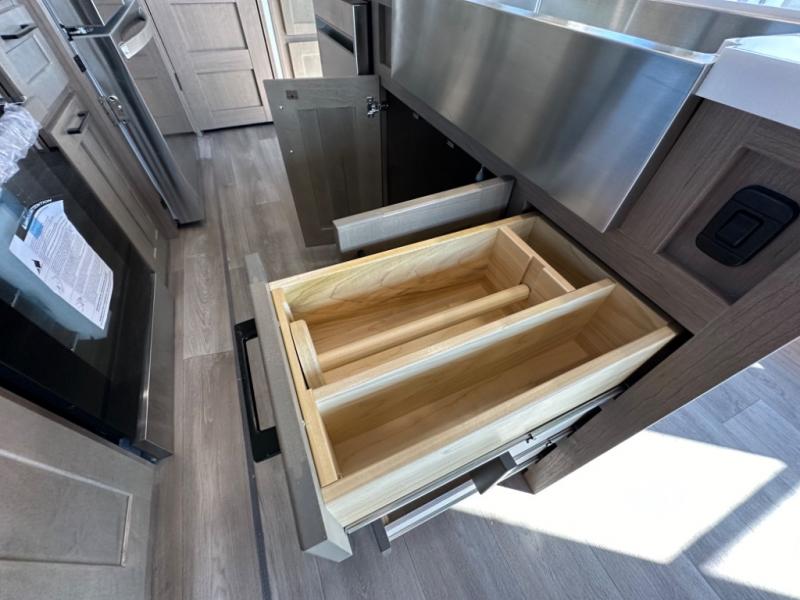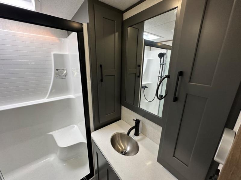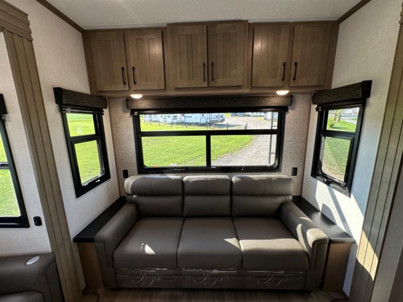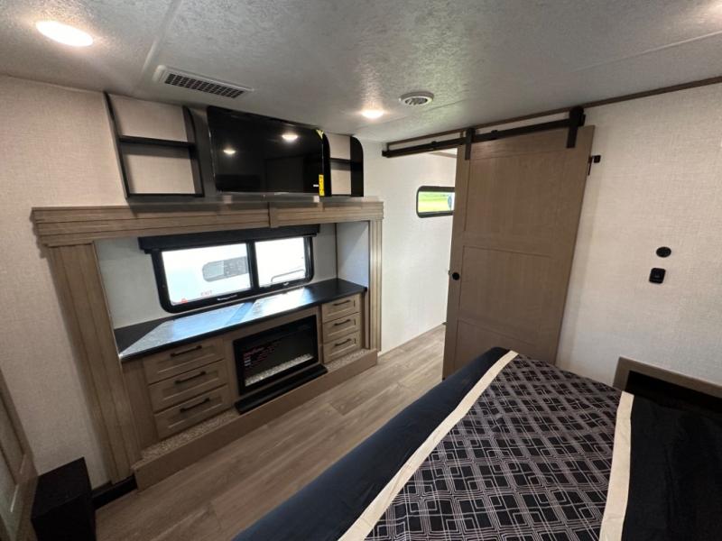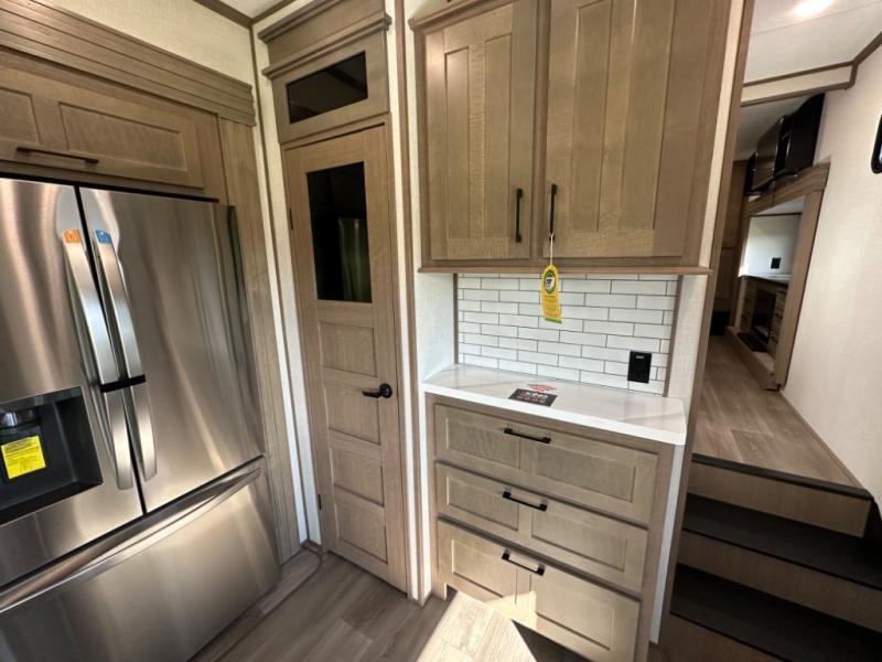 Camp wherever you want and stay as long as you desire with this full-time fifth wheel! You will love the spacious interior which includes a front bedroom with an electric tilt king bed slide with drawers underneath, a front wardrobe with washer and dryer prep, a closet with a built-in hamper, plus a slide out dresser with 32" Smart LED TV above. The full bathroom offers a residential shower with a seat plus linen storage, and the kitchen gives the cook a dream kitchen that includes a farmhouse stainless steel sink and dishwasher in the center island, a 26 cu. ft. house refrigerator with a 2,000W inverter, and more. The 50" Smart LED TV with a fireplace below can be seen from the sliding table/desk and chairs, the comfortable theater seats and the hide-a-bed sofa.