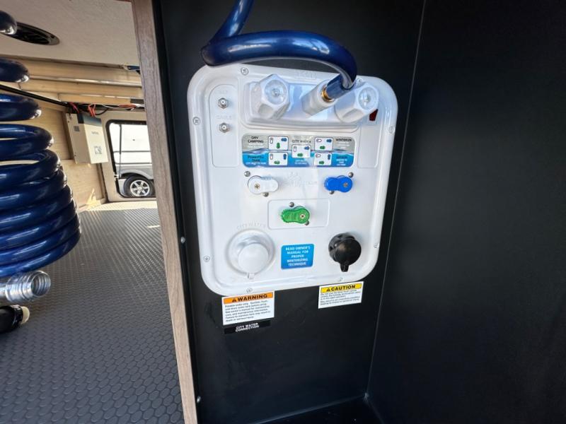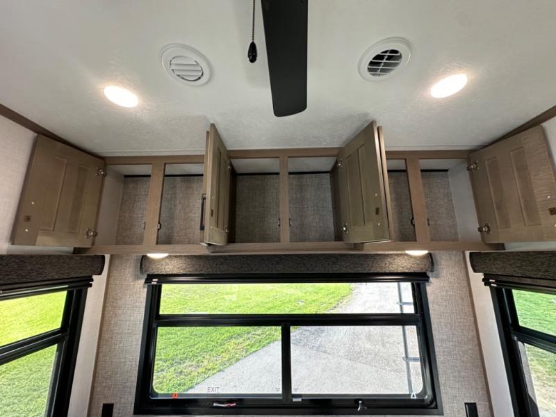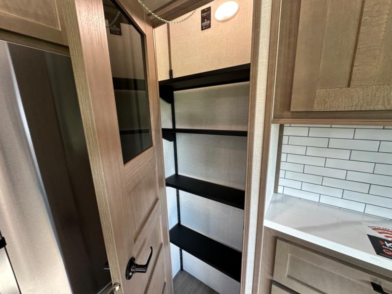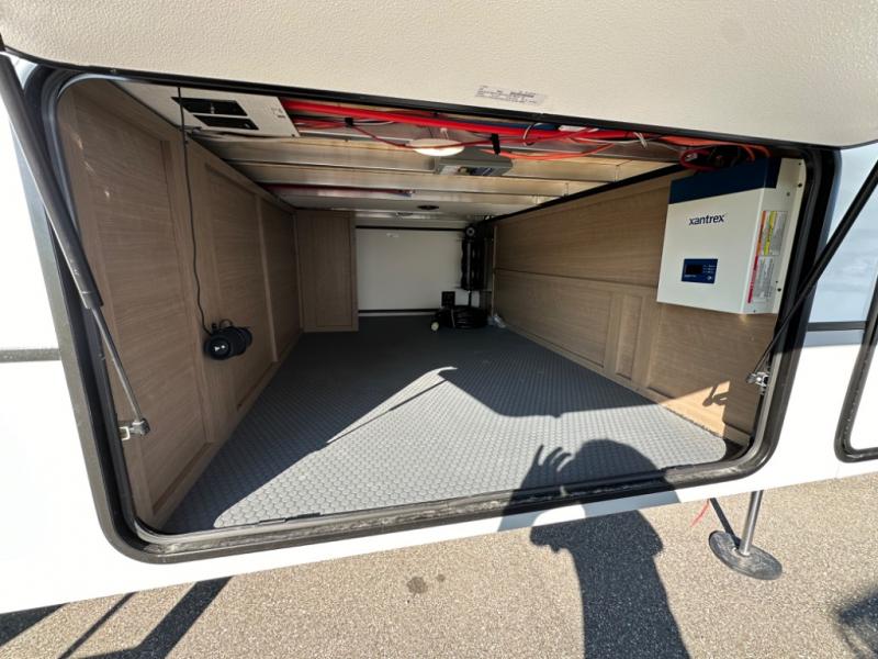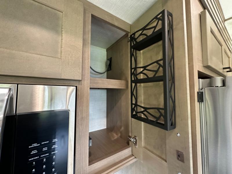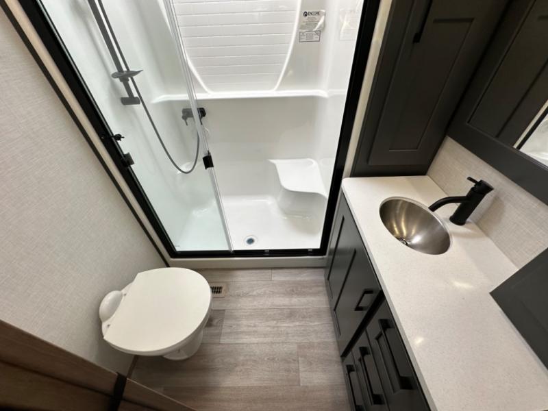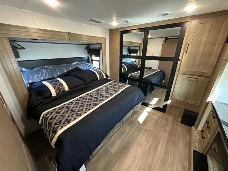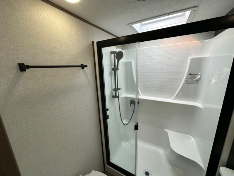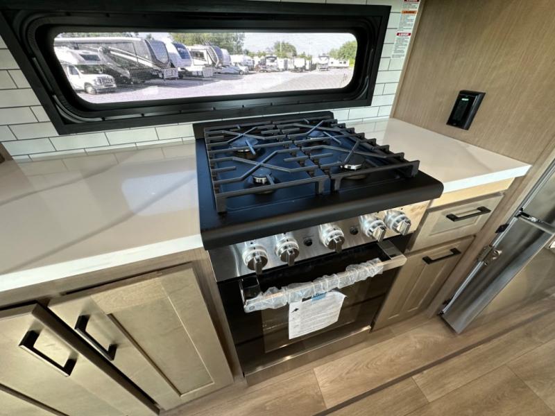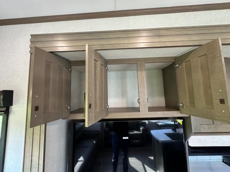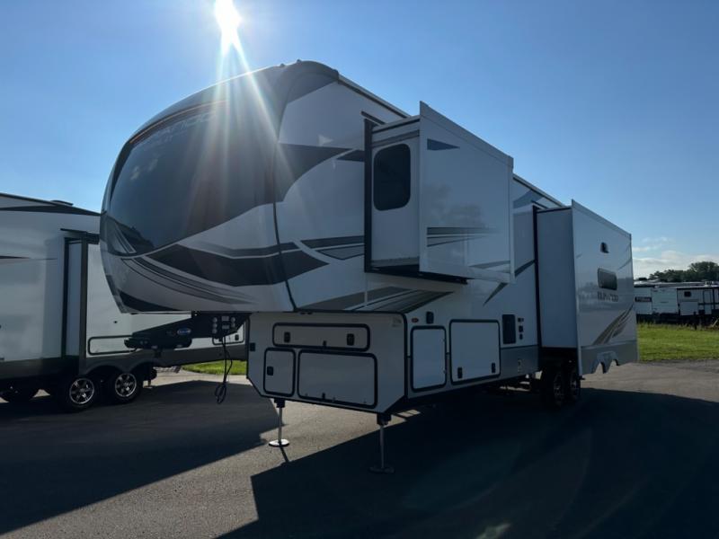 Camp wherever you want and stay as long as you desire with this full-time fifth wheel! You will love the spacious interior which includes a front bedroom with an electric tilt king bed slide with drawers underneath, a front wardrobe with washer and dryer prep, a closet with a built-in hamper, plus a slide out dresser with 32" Smart LED TV above. The full bathroom offers a residential shower with a seat plus linen storage, and the kitchen gives the cook a dream kitchen that includes a farmhouse stainless steel sink and dishwasher in the center island, a 26 cu. ft. house refrigerator with a 2,000W inverter, and more. The 50" Smart LED TV with a fireplace below can be seen from the sliding table/desk and chairs, the comfortable theater seats and the hide-a-bed sofa.