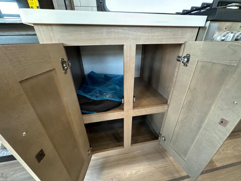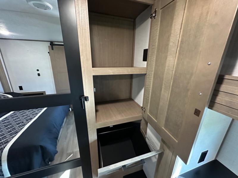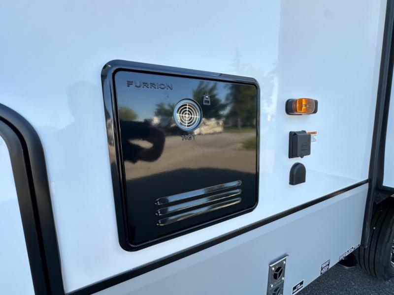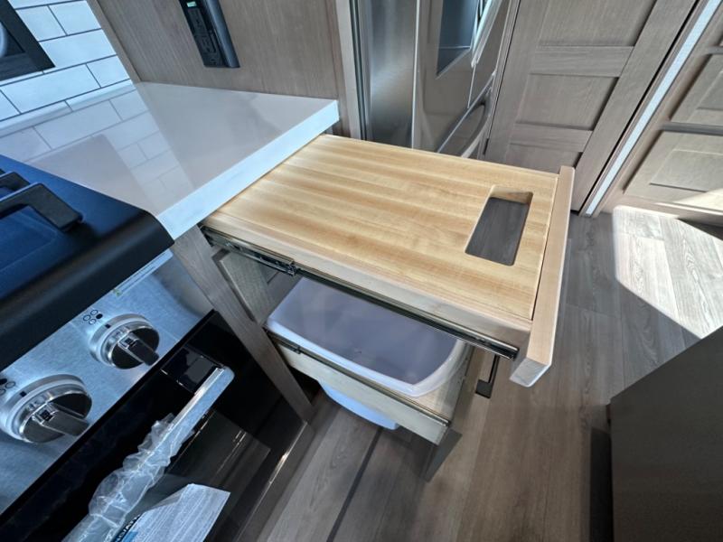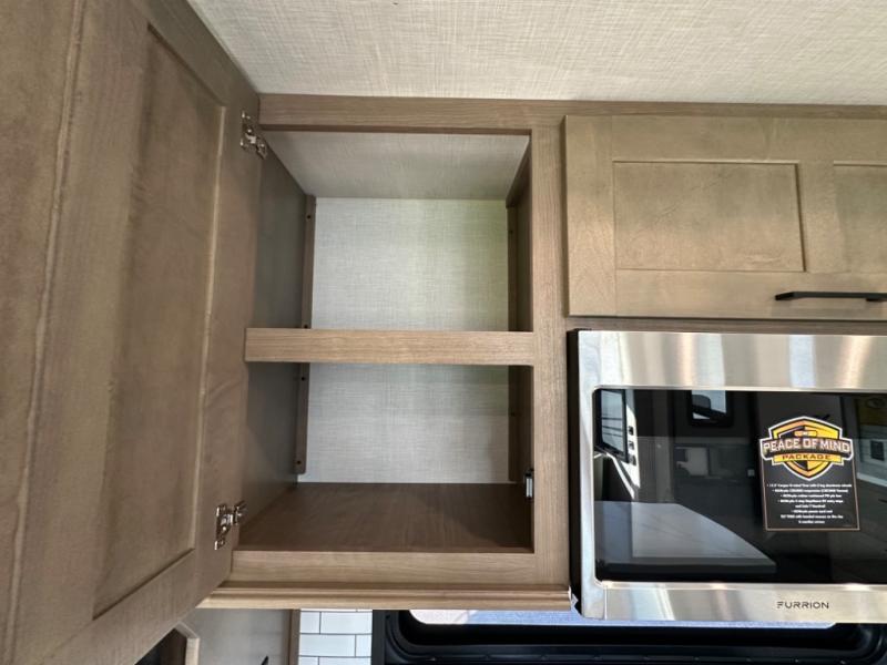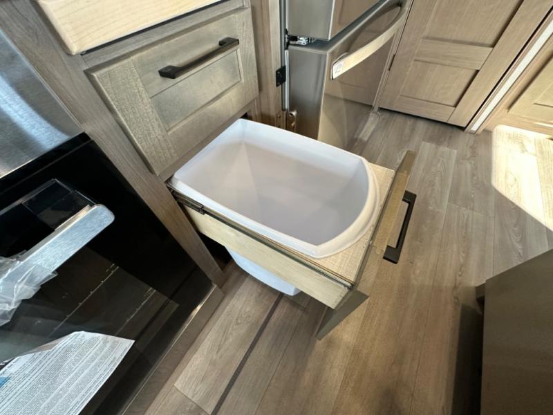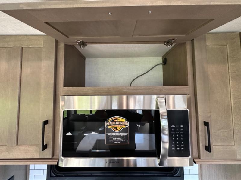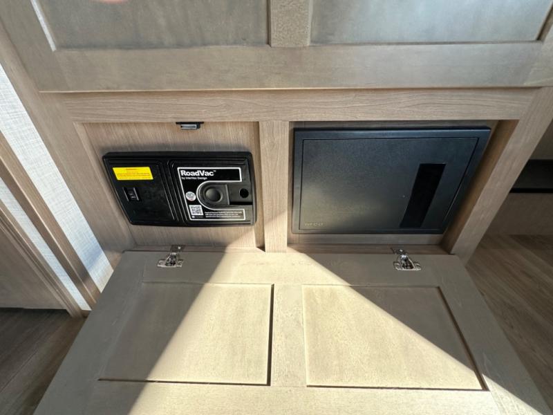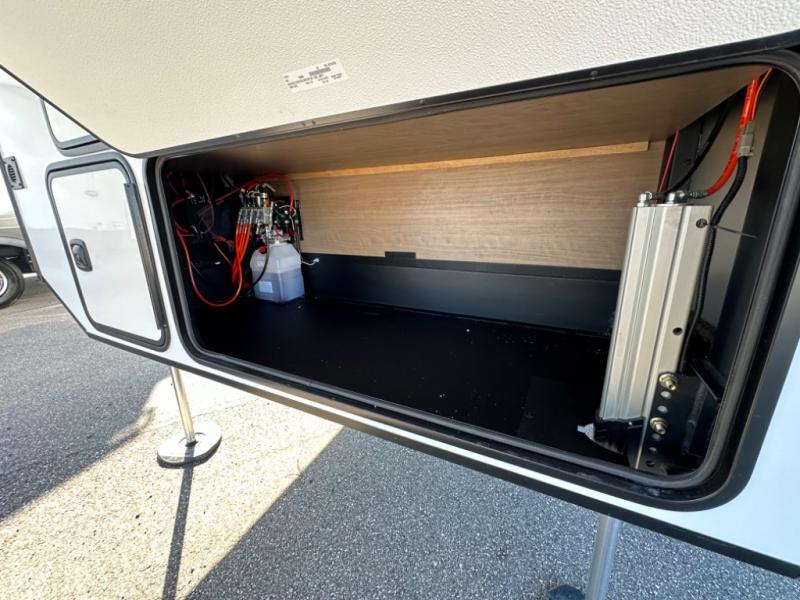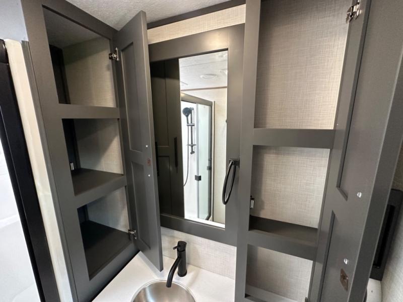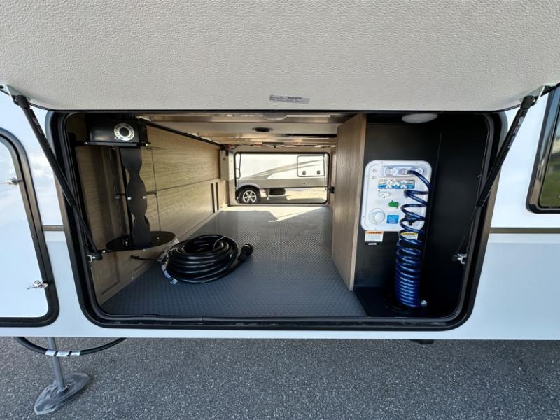 Camp wherever you want and stay as long as you desire with this full-time fifth wheel! You will love the spacious interior which includes a front bedroom with an electric tilt king bed slide with drawers underneath, a front wardrobe with washer and dryer prep, a closet with a built-in hamper, plus a slide out dresser with 32" Smart LED TV above. The full bathroom offers a residential shower with a seat plus linen storage, and the kitchen gives the cook a dream kitchen that includes a farmhouse stainless steel sink and dishwasher in the center island, a 26 cu. ft. house refrigerator with a 2,000W inverter, and more. The 50" Smart LED TV with a fireplace below can be seen from the sliding table/desk and chairs, the comfortable theater seats and the hide-a-bed sofa.