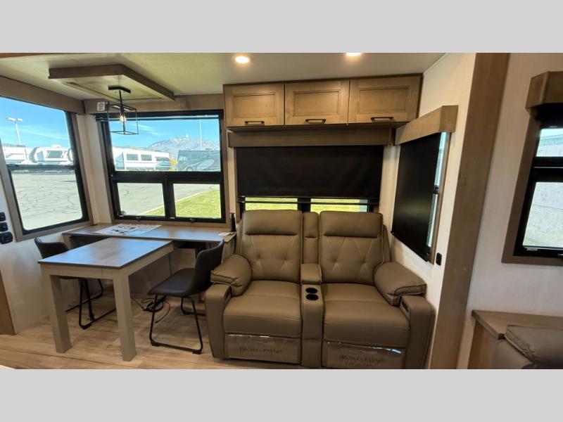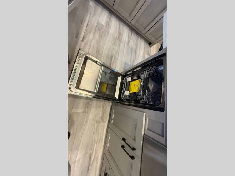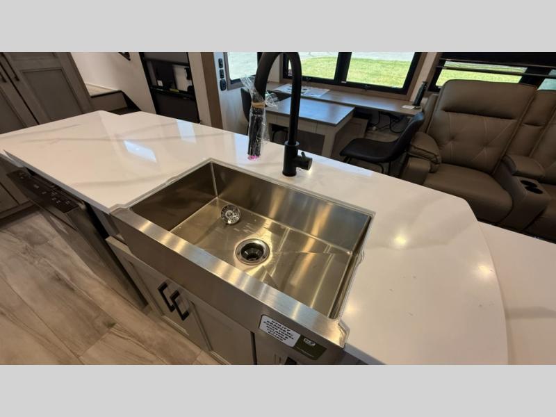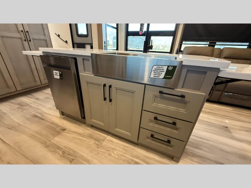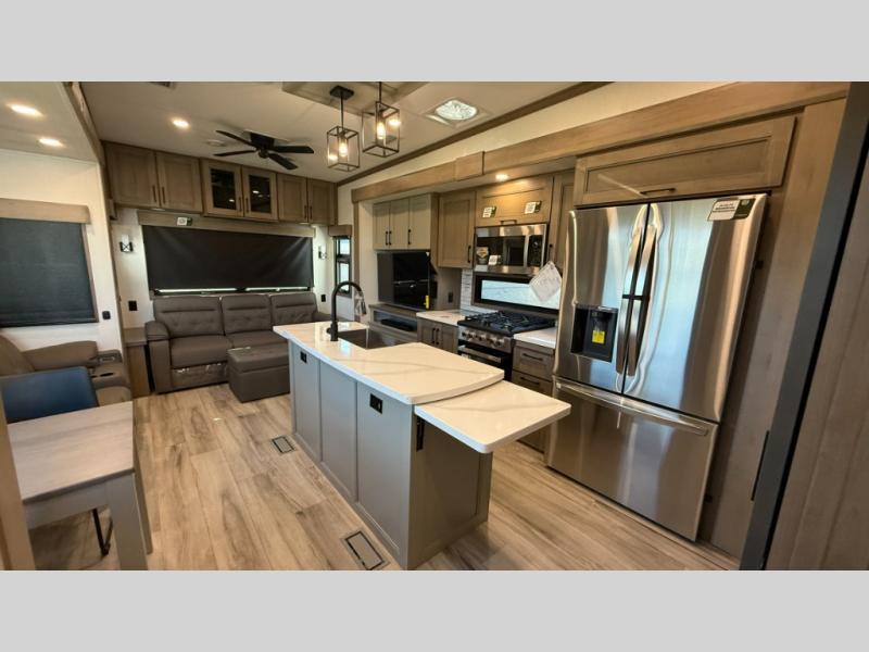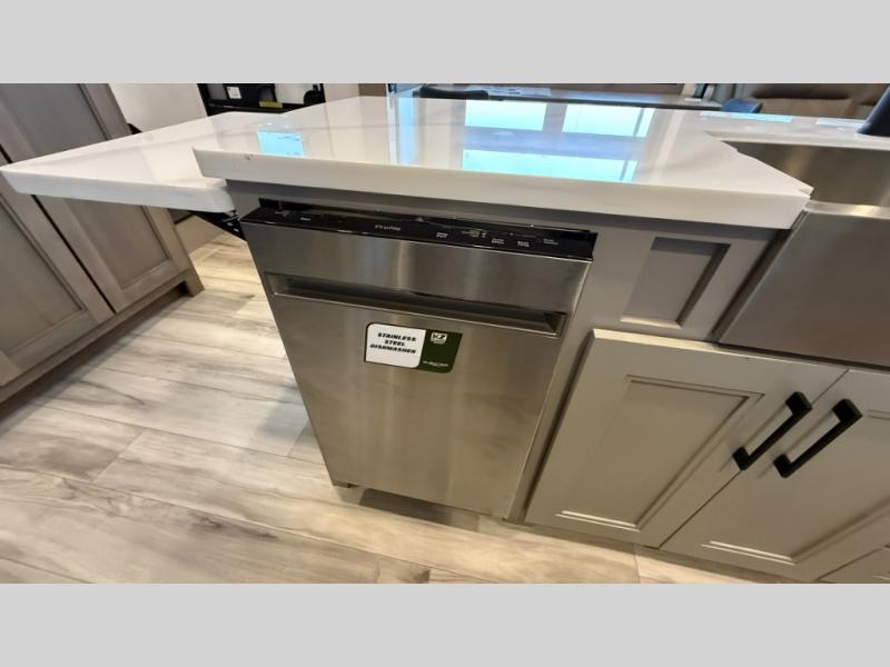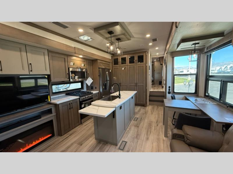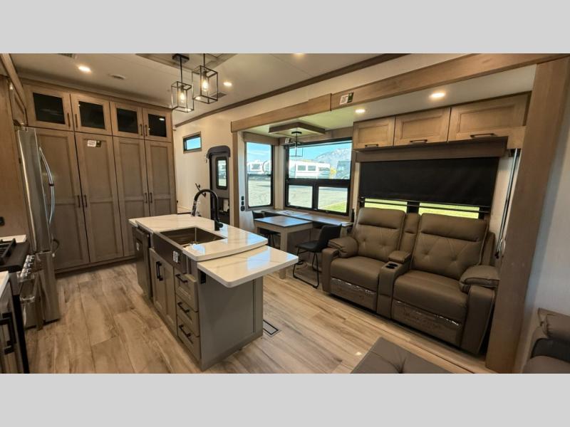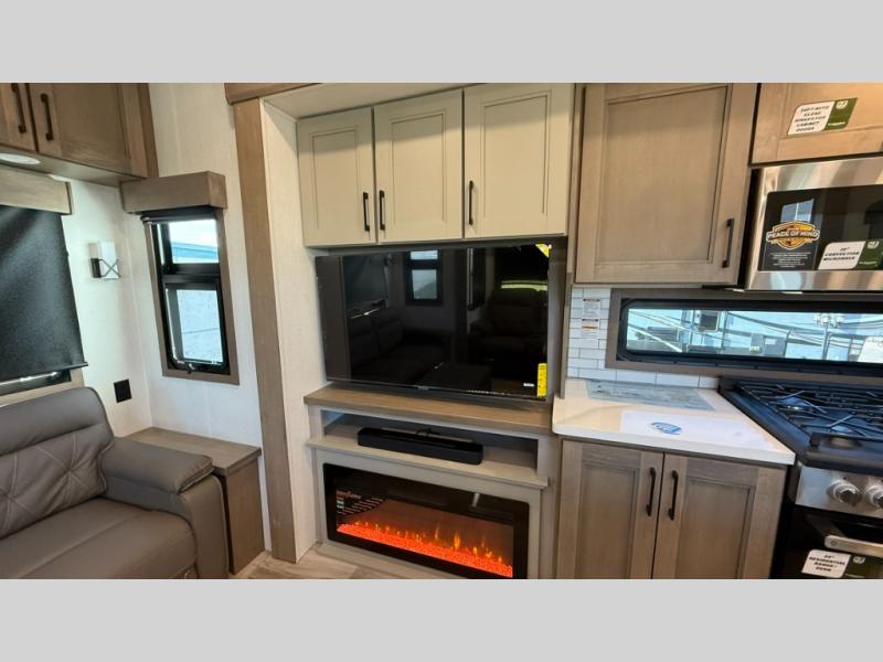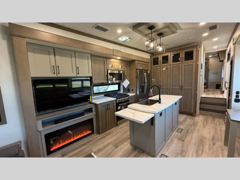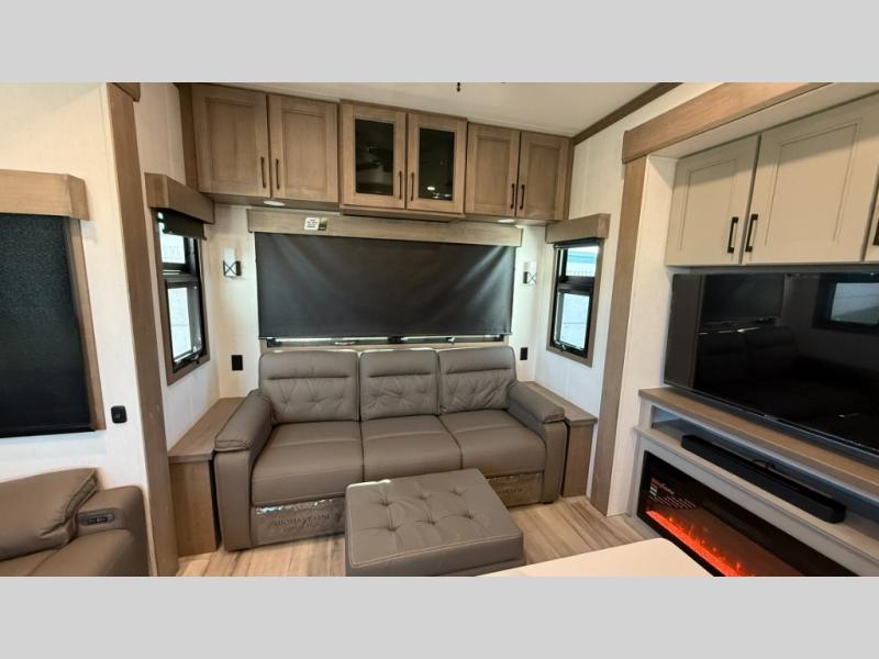 Camp wherever you want and stay as long as you desire with this full-time fifth wheel! You will love the spacious interior which includes a front bedroom with an electric tilt king bed slide with drawers underneath, a front wardrobe with washer and dryer prep, a closet with a built-in hamper, plus a slide out dresser with 32" Smart LED TV above. The full bathroom offers a residential shower with a seat plus linen storage, and the kitchen gives the cook a dream kitchen that includes a farmhouse stainless steel sink and dishwasher in the center island, a 26 cu. ft. house refrigerator with a 2,000W inverter, and more. The 50" Smart LED TV with a fireplace below can be seen from the sliding table/desk and chairs, the comfortable theater seats and the hide-a-bed sofa.