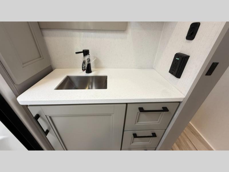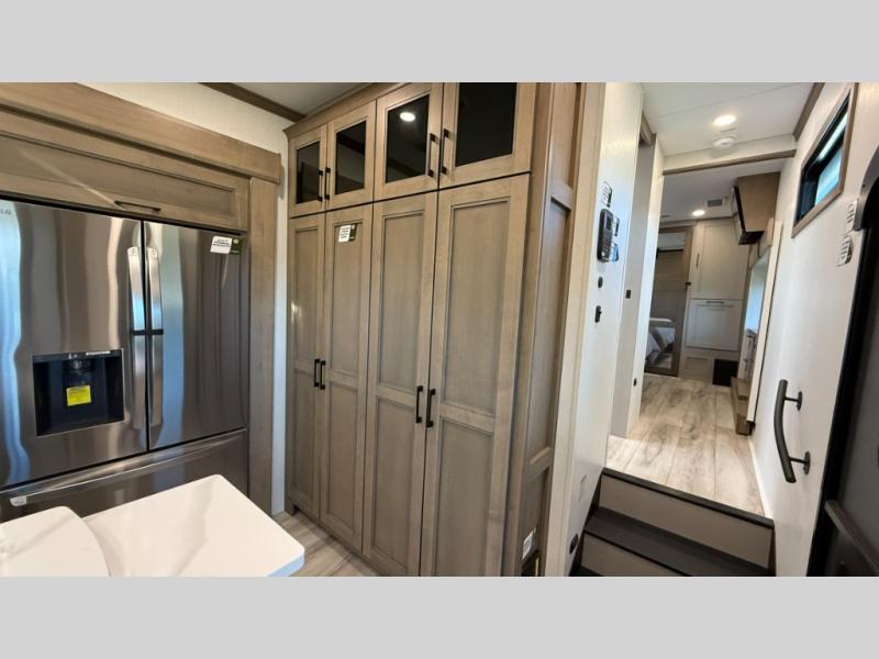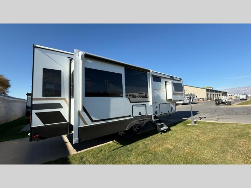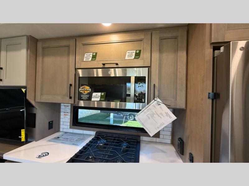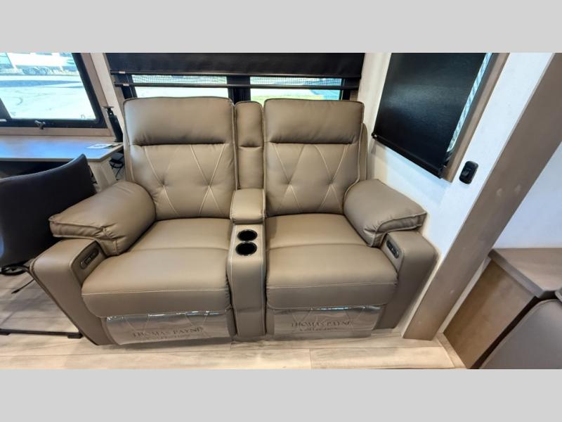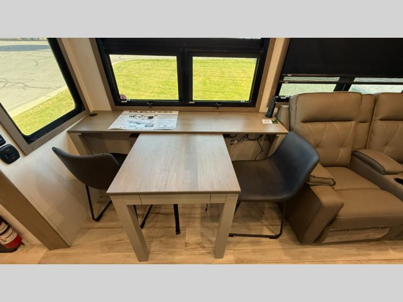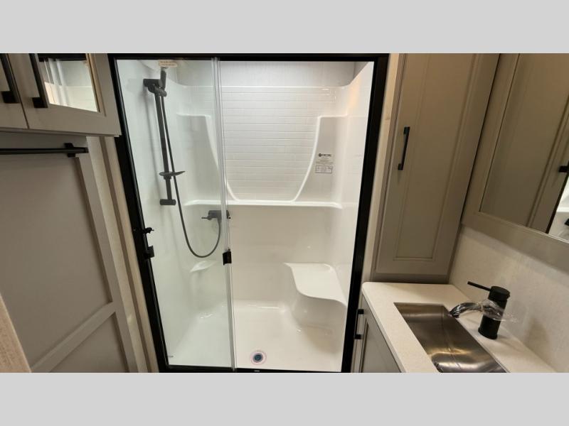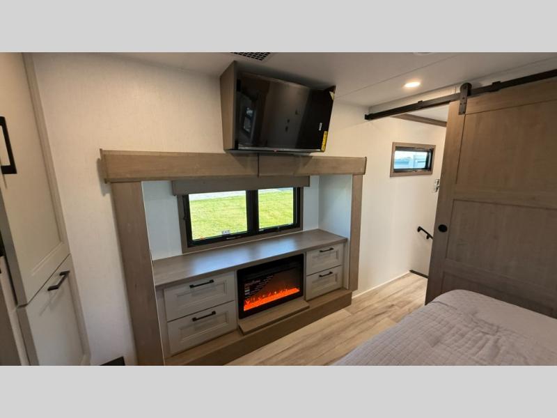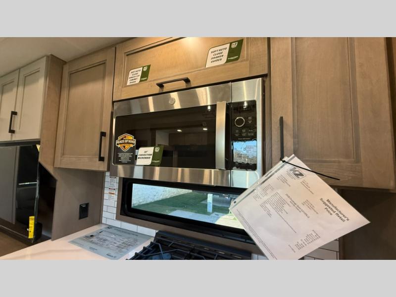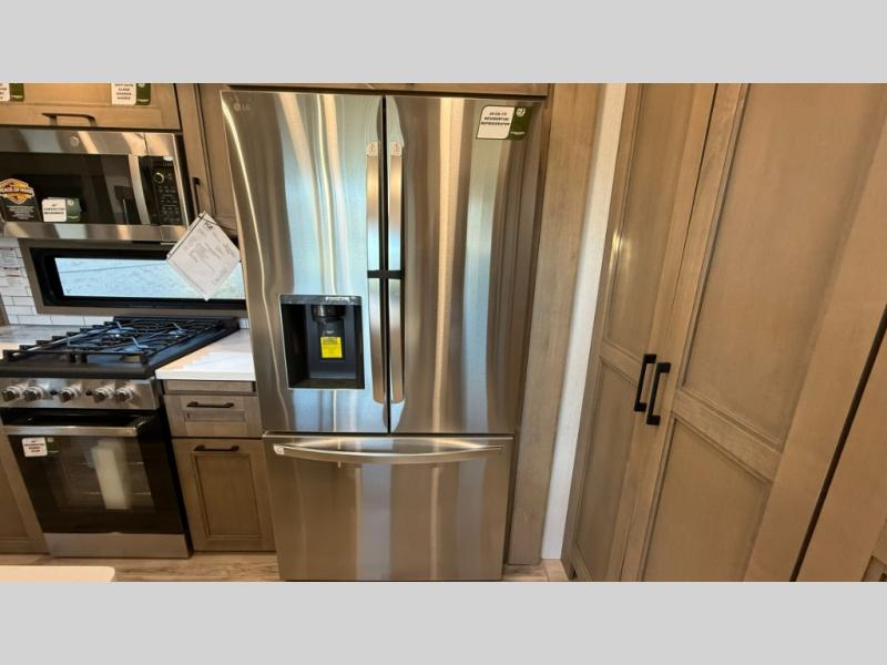 Camp wherever you want and stay as long as you desire with this full-time fifth wheel! You will love the spacious interior which includes a front bedroom with an electric tilt king bed slide with drawers underneath, a front wardrobe with washer and dryer prep, a closet with a built-in hamper, plus a slide out dresser with 32" Smart LED TV above. The full bathroom offers a residential shower with a seat plus linen storage, and the kitchen gives the cook a dream kitchen that includes a farmhouse stainless steel sink and dishwasher in the center island, a 26 cu. ft. house refrigerator with a 2,000W inverter, and more. The 50" Smart LED TV with a fireplace below can be seen from the sliding table/desk and chairs, the comfortable theater seats and the hide-a-bed sofa.