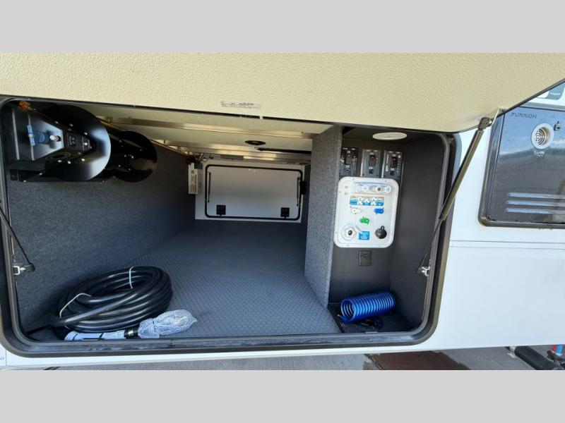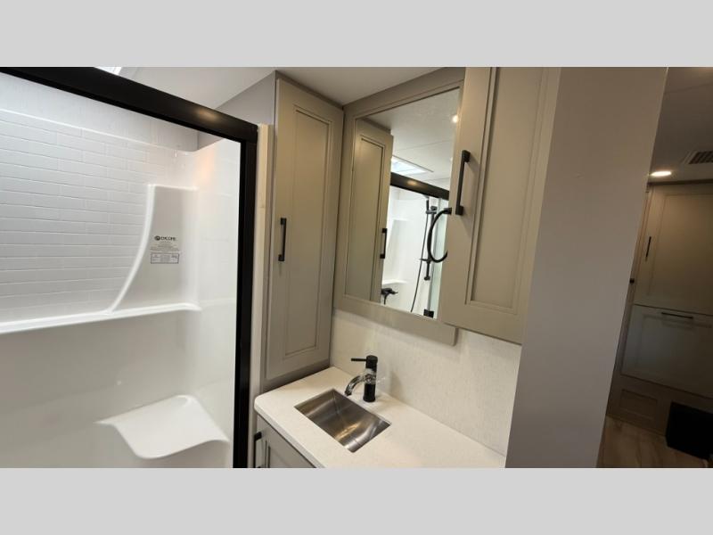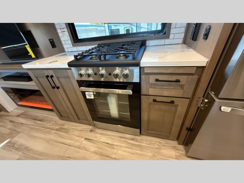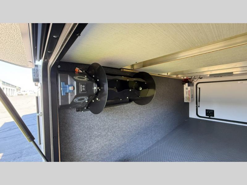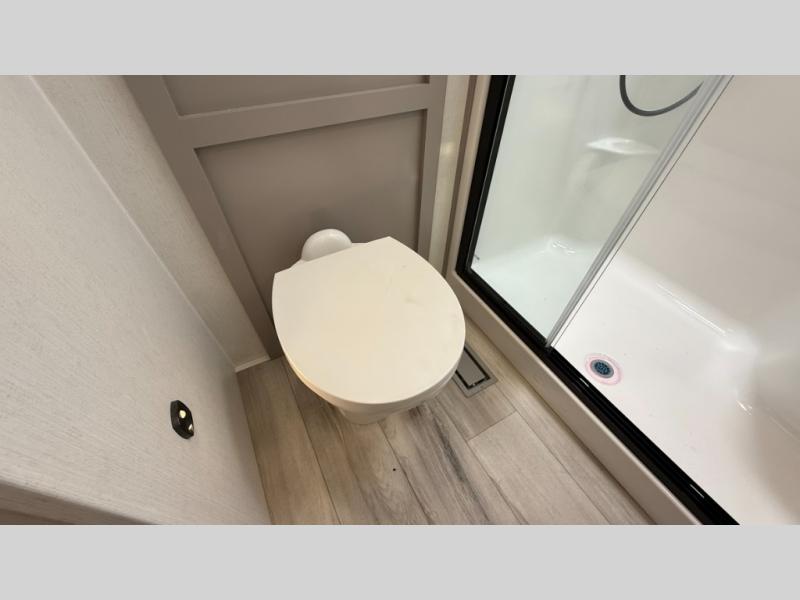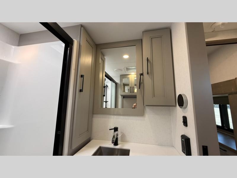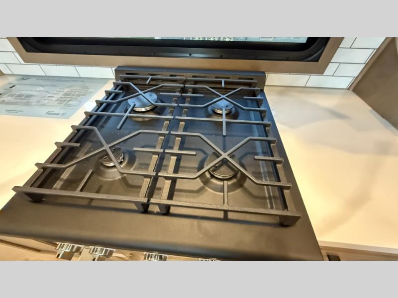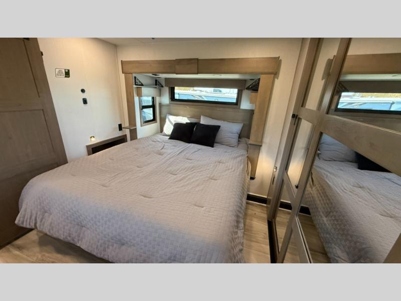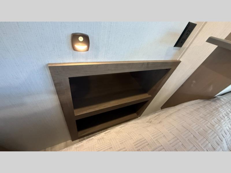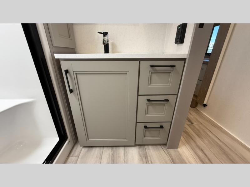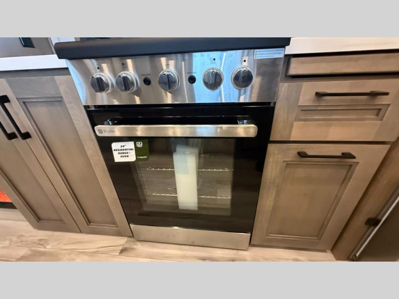 Camp wherever you want and stay as long as you desire with this full-time fifth wheel! You will love the spacious interior which includes a front bedroom with an electric tilt king bed slide with drawers underneath, a front wardrobe with washer and dryer prep, a closet with a built-in hamper, plus a slide out dresser with 32" Smart LED TV above. The full bathroom offers a residential shower with a seat plus linen storage, and the kitchen gives the cook a dream kitchen that includes a farmhouse stainless steel sink and dishwasher in the center island, a 26 cu. ft. house refrigerator with a 2,000W inverter, and more. The 50" Smart LED TV with a fireplace below can be seen from the sliding table/desk and chairs, the comfortable theater seats and the hide-a-bed sofa.