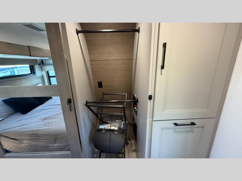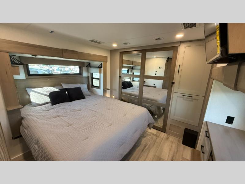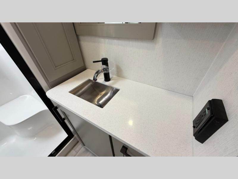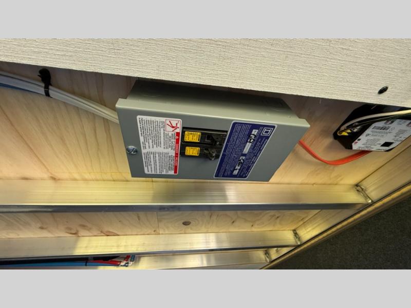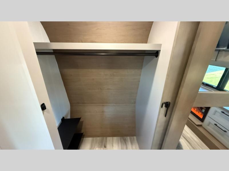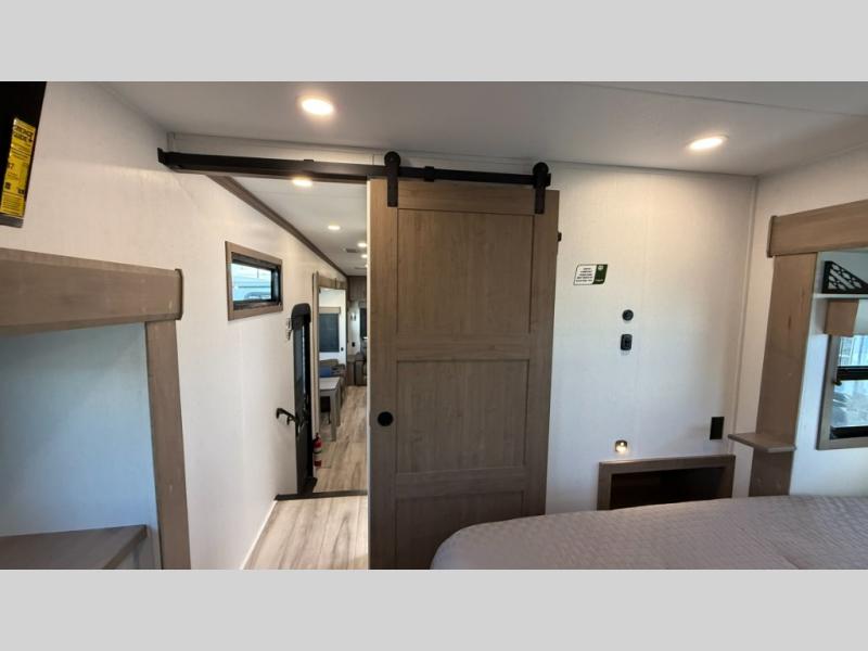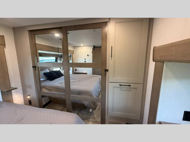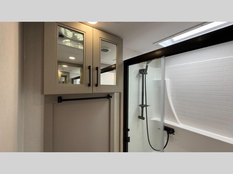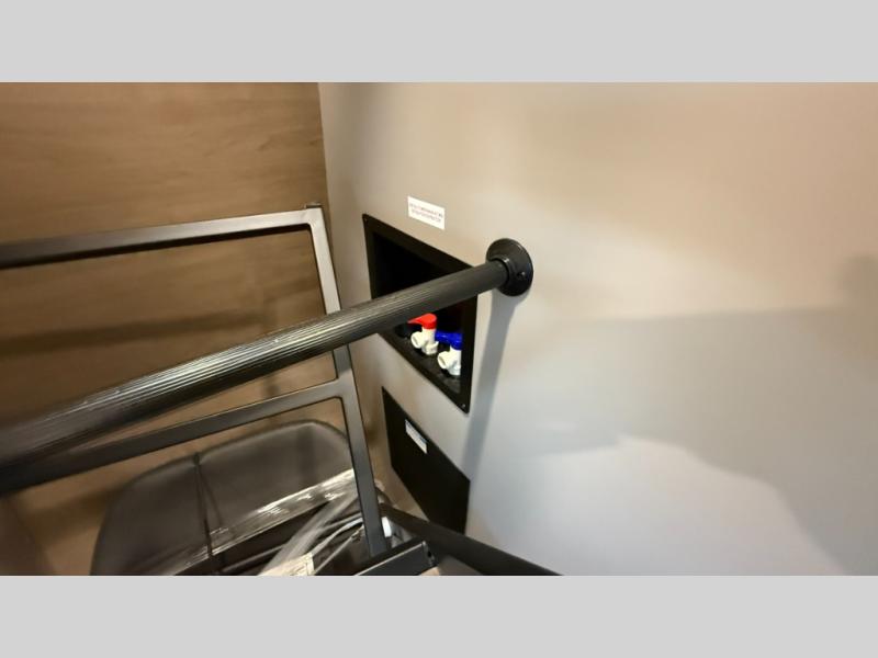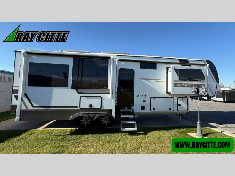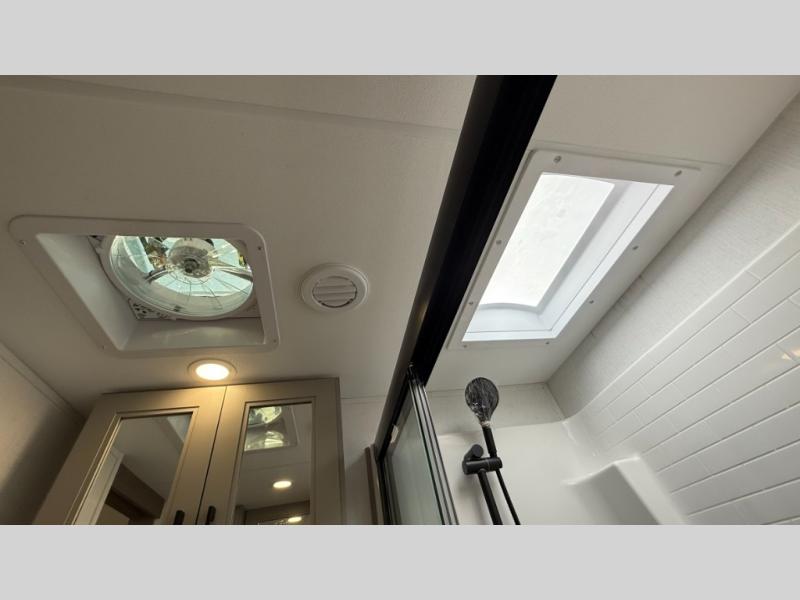 Camp wherever you want and stay as long as you desire with this full-time fifth wheel! You will love the spacious interior which includes a front bedroom with an electric tilt king bed slide with drawers underneath, a front wardrobe with washer and dryer prep, a closet with a built-in hamper, plus a slide out dresser with 32" Smart LED TV above. The full bathroom offers a residential shower with a seat plus linen storage, and the kitchen gives the cook a dream kitchen that includes a farmhouse stainless steel sink and dishwasher in the center island, a 26 cu. ft. house refrigerator with a 2,000W inverter, and more. The 50" Smart LED TV with a fireplace below can be seen from the sliding table/desk and chairs, the comfortable theater seats and the hide-a-bed sofa.