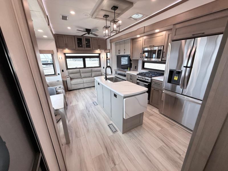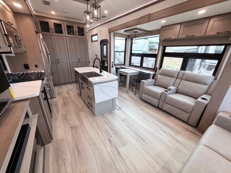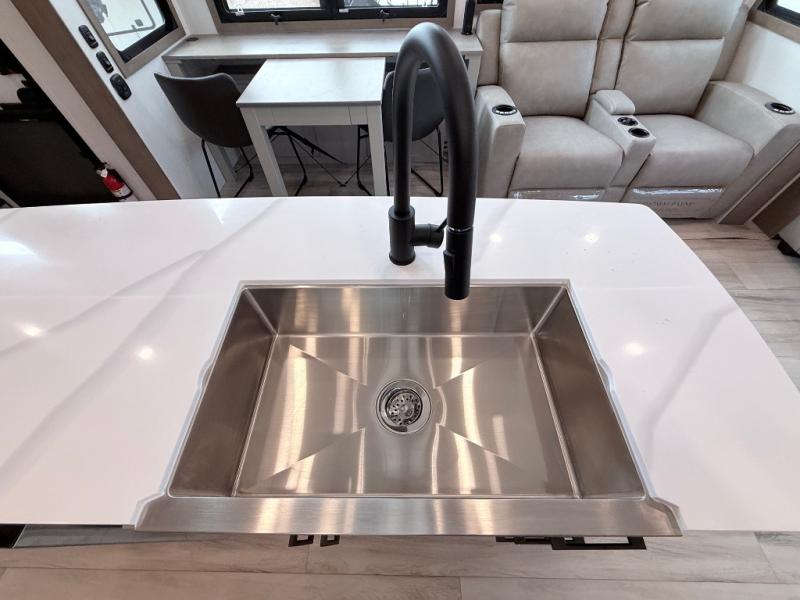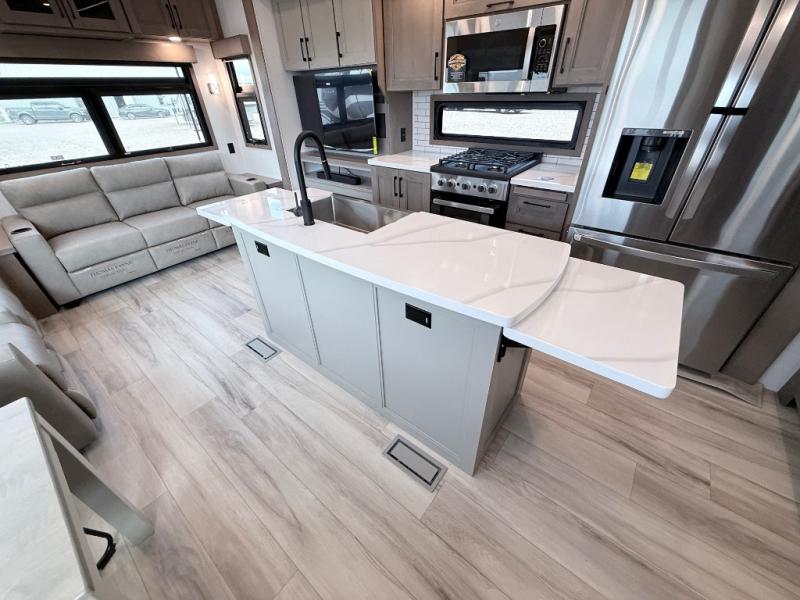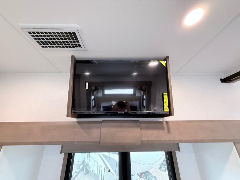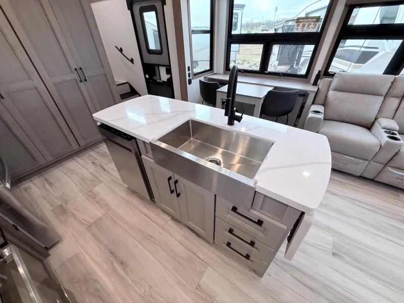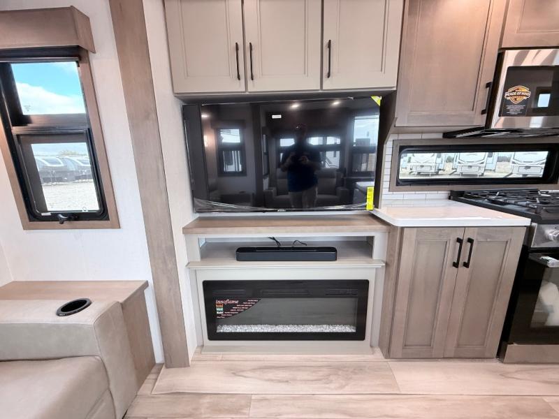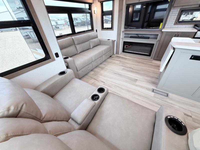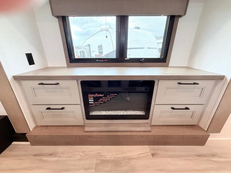 Enjoy the freedom to camp in the places you love with this well-equipped fifth wheel! You will love the spacious interior which includes a front bedroom with an electric tilt king bed slide with drawers underneath, a front wardrobe with washer and dryer prep, a closet with a built-in hamper, plus a slide out dresser with 32" Smart LED TV above. The full bathroom offers a residential shower with a seat plus linen storage, and the kitchen gives the cook a dream kitchen that includes a farmhouse stainless steel sink and dishwasher in the center island, a 26-cu. ft. house refrigerator with a 2,000W inverter, and more. The 50" Smart LED TV with a fireplace below can be seen from the sliding table/desk and chairs, the comfortable theater seats and the hide-a-bed sofa.