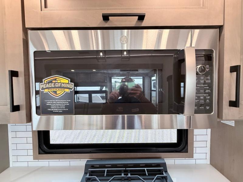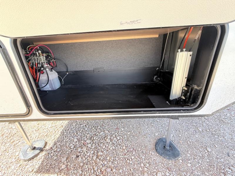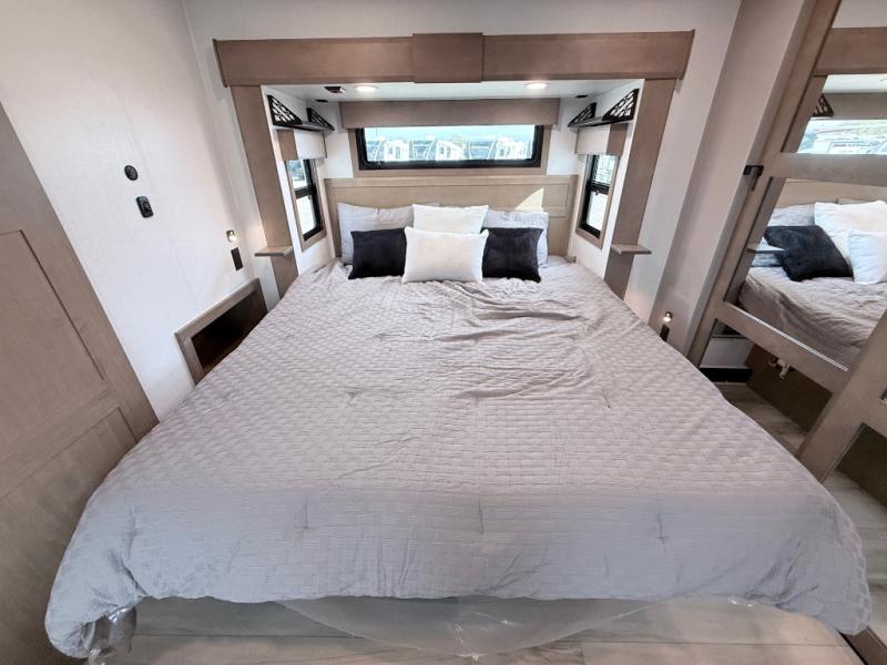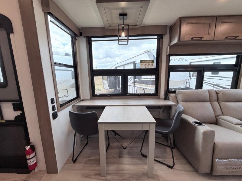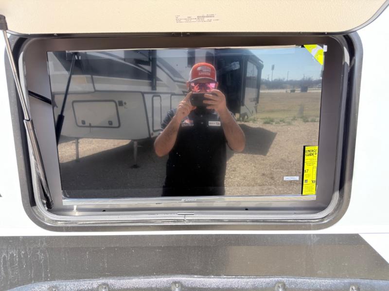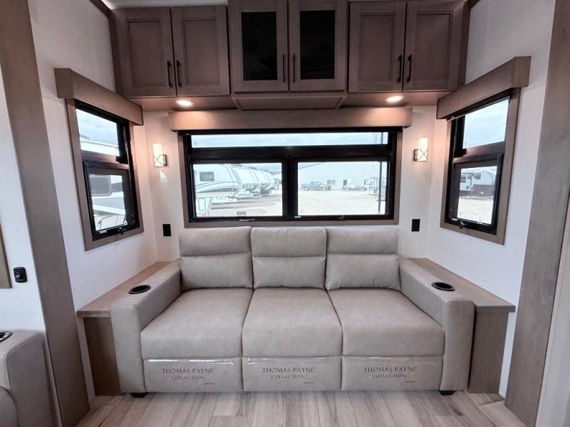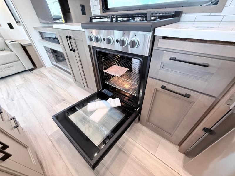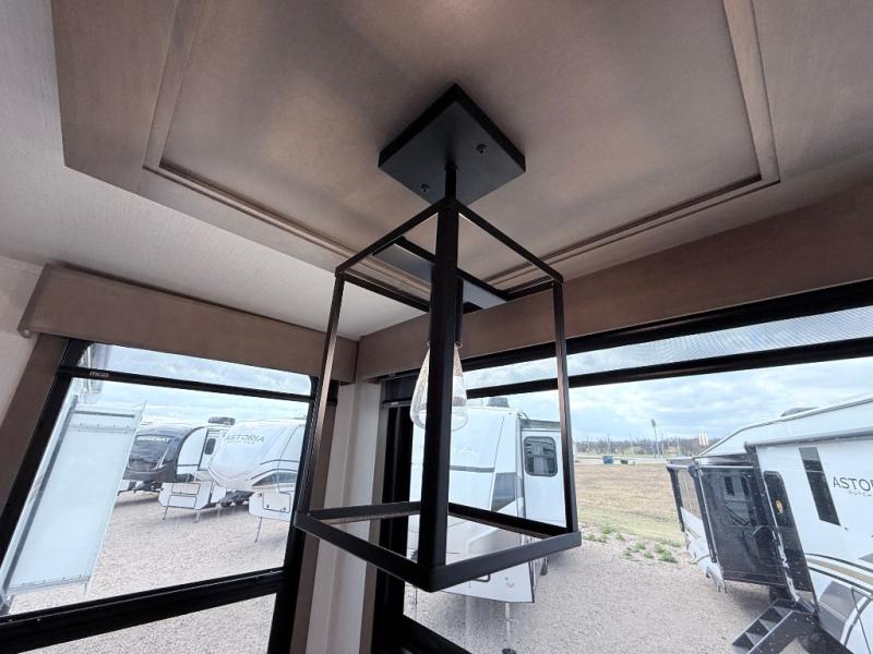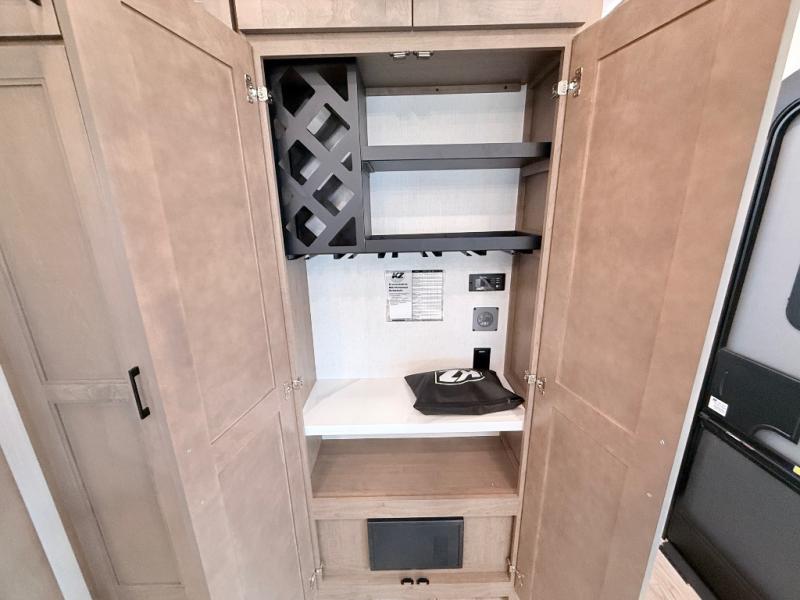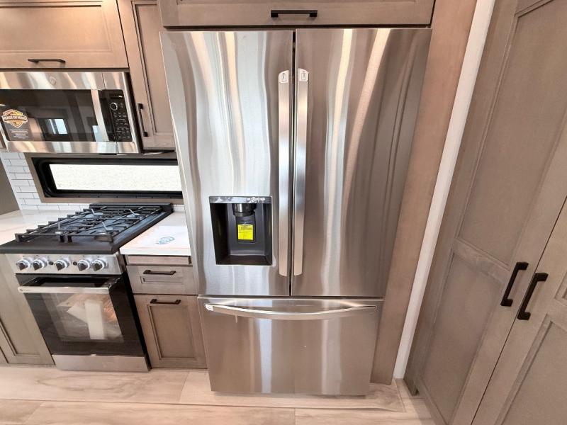 Enjoy the freedom to camp in the places you love with this well-equipped fifth wheel! You will love the spacious interior which includes a front bedroom with an electric tilt king bed slide with drawers underneath, a front wardrobe with washer and dryer prep, a closet with a built-in hamper, plus a slide out dresser with 32" Smart LED TV above. The full bathroom offers a residential shower with a seat plus linen storage, and the kitchen gives the cook a dream kitchen that includes a farmhouse stainless steel sink and dishwasher in the center island, a 26-cu. ft. house refrigerator with a 2,000W inverter, and more. The 50" Smart LED TV with a fireplace below can be seen from the sliding table/desk and chairs, the comfortable theater seats and the hide-a-bed sofa.