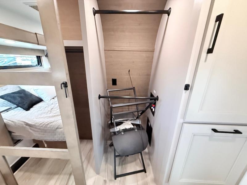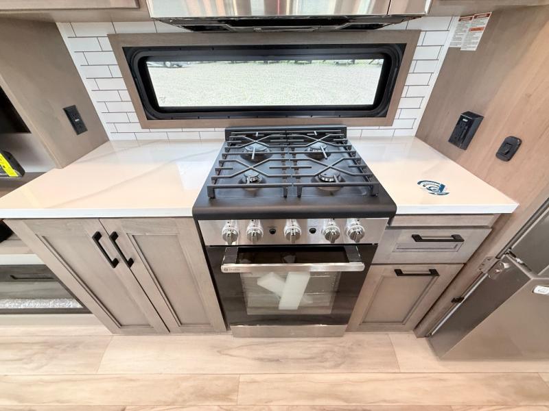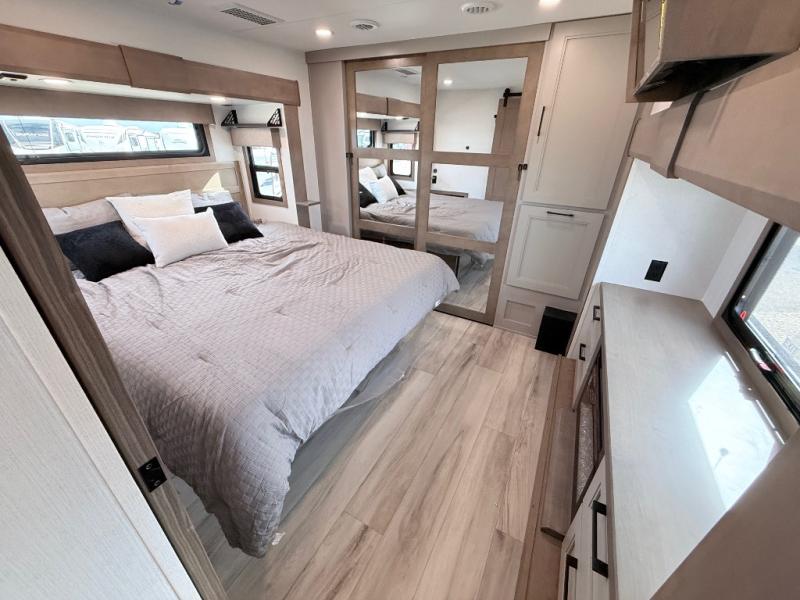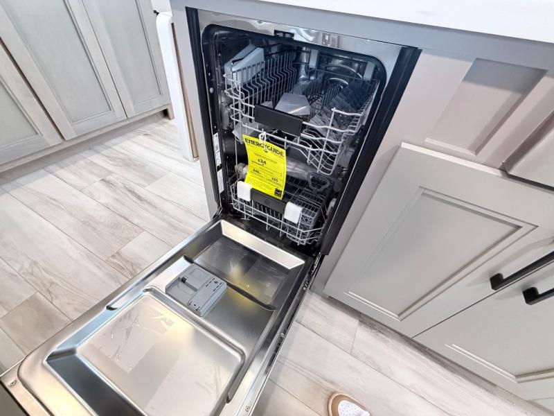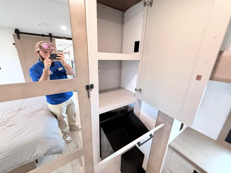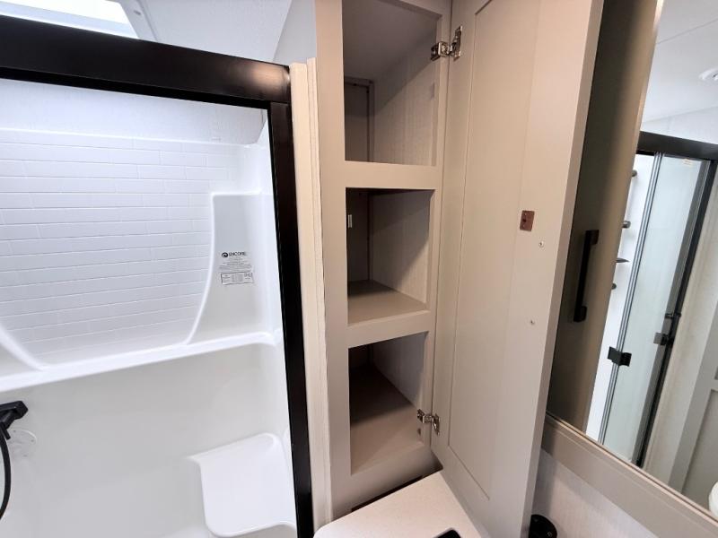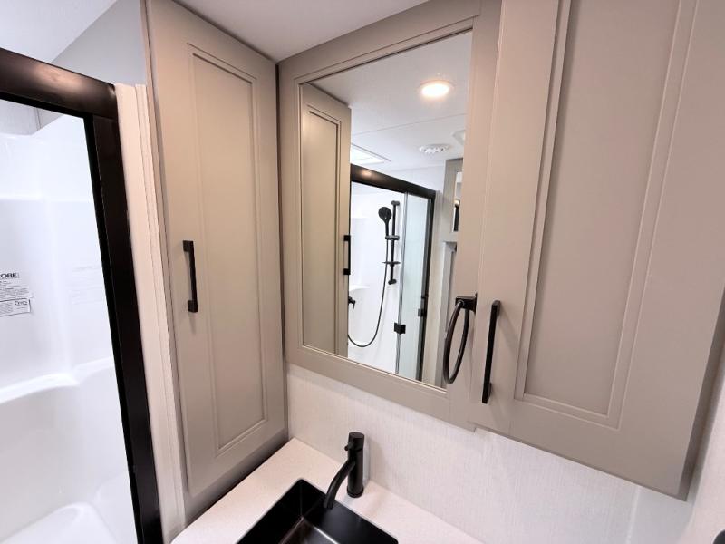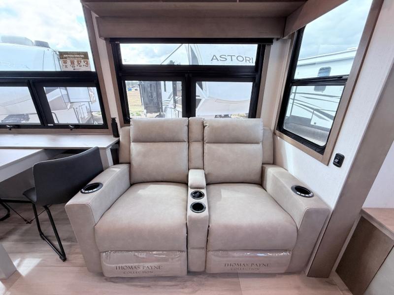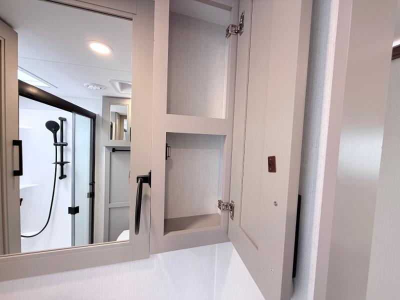 Enjoy the freedom to camp in the places you love with this well-equipped fifth wheel! You will love the spacious interior which includes a front bedroom with an electric tilt king bed slide with drawers underneath, a front wardrobe with washer and dryer prep, a closet with a built-in hamper, plus a slide out dresser with 32" Smart LED TV above. The full bathroom offers a residential shower with a seat plus linen storage, and the kitchen gives the cook a dream kitchen that includes a farmhouse stainless steel sink and dishwasher in the center island, a 26-cu. ft. house refrigerator with a 2,000W inverter, and more. The 50" Smart LED TV with a fireplace below can be seen from the sliding table/desk and chairs, the comfortable theater seats and the hide-a-bed sofa.