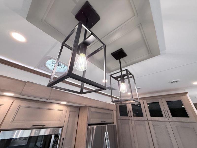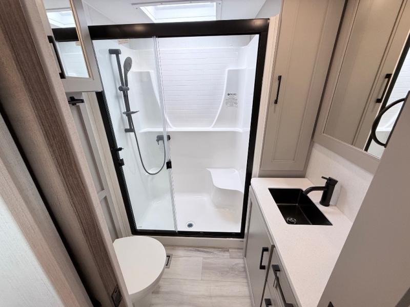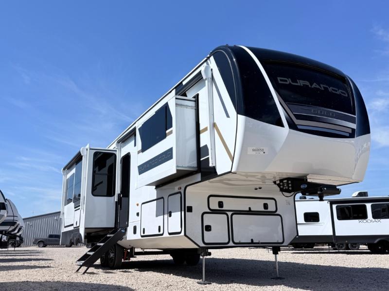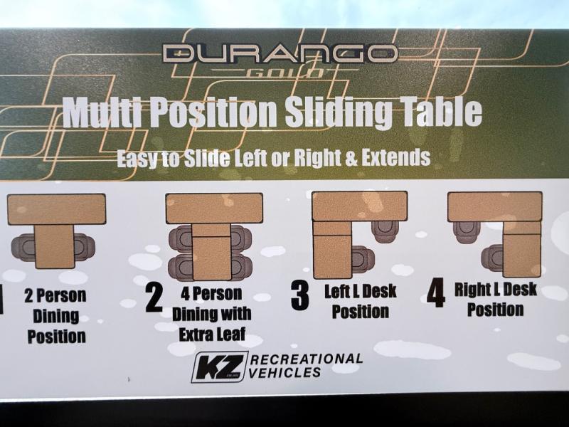 With any KZ Durango Gold full-time luxury fifth wheel, you will enjoy the new Blancher Maple and Morel Fog cabinetry, stainless steel appliances such as a 30" convection microwave and 24" oven with a four burner range, plus a stainless dishwasher. Other top features include an electric tilt bed with Serta Comfort foam king mattress, three 15K A/C units, plus theater seating with powered recline, heat and massage features. You will also appreciate a handy central vacuum system with attachments that stores out of sight. Each Durango Gold is constructed with six-sided aluminum framing, and has a heated, insulated and an enclosed underbelly. It is also constructed with Tufflex roofing material which is flexible, puncture resistant, and reflective. The now mandatory "Off The Grid" solar package includes two 200W solar panels, a 30A MPPT solar charge controller, and a 2,000W True Sine Wave inverter for off-grid capabilities.