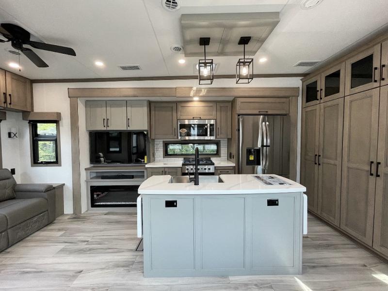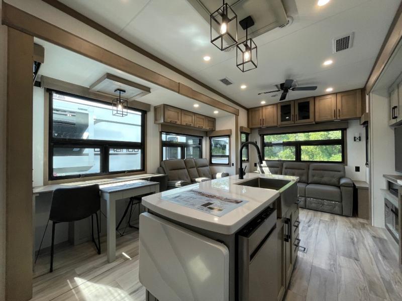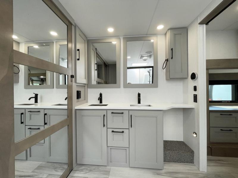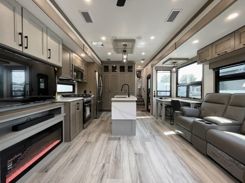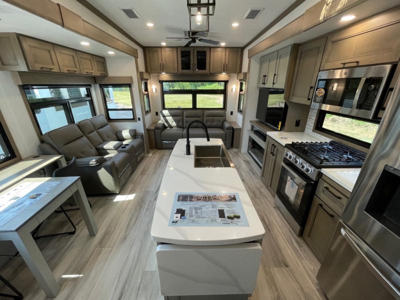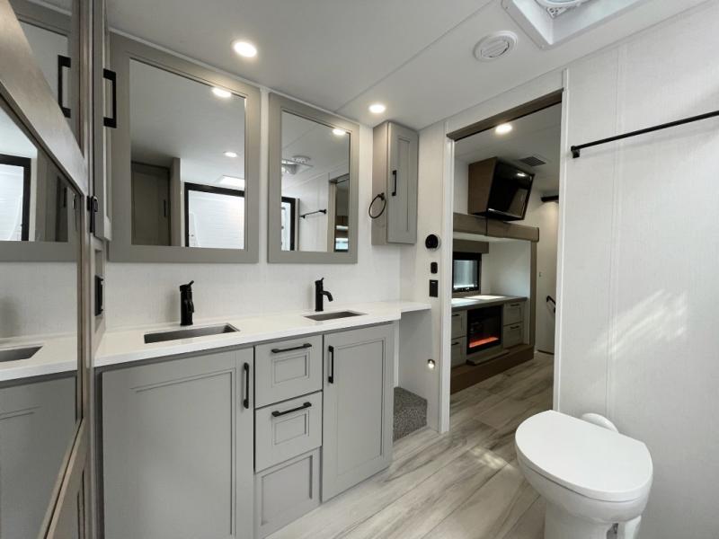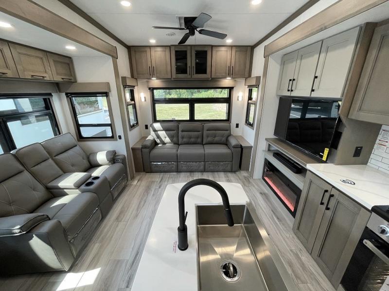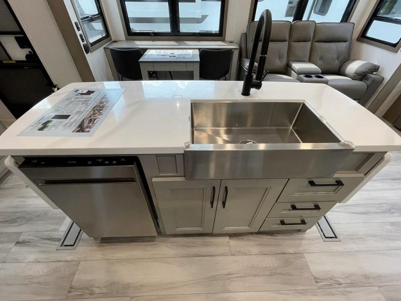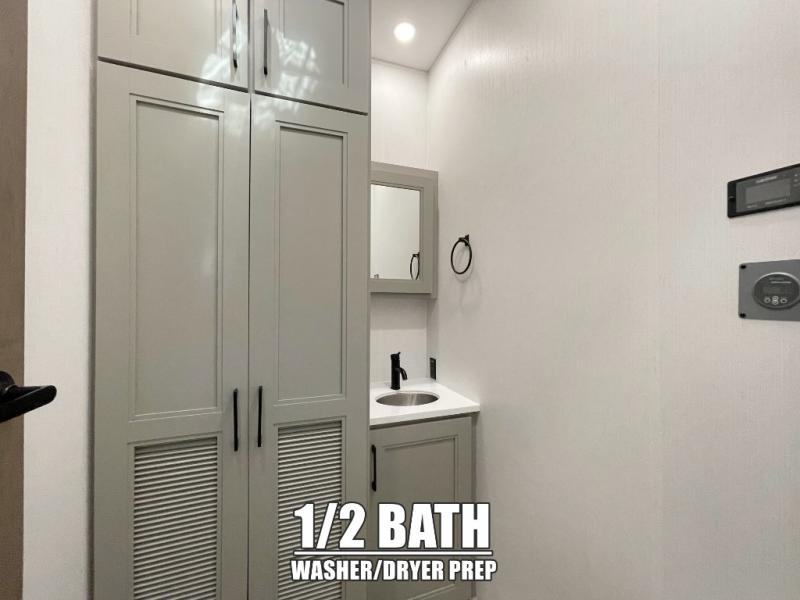 With a bath and a half, everyone will stay clean in this fifth wheel! The front full bathroom has a dual sink vanity for two to get ready at once, a 48" x 30" shower with a seat, and a front closet for your clothes. You can enter into the master suite from the bathroom and relax on the electric tilt king bed slide, store your things in the underbed drawers, and watch a movie in bed with the Smart LED TV. The half bathroom is directly off of the kitchen, and this room includes washer and dryer prep if you choose to add these appliances. You can prepare dinner at the four burner cooktop with a 24" oven and kitchen island, which also has a dishwasher for easy clean ups. Eat your meals at the sliding table/desk and then let your stomach settle while relaxing on the rear hide-a-bed sofa or theater seating across from the entertainment center with 40" fireplace!