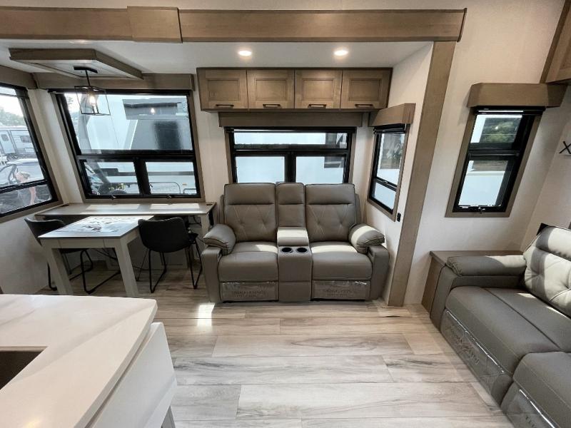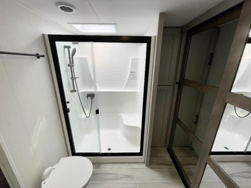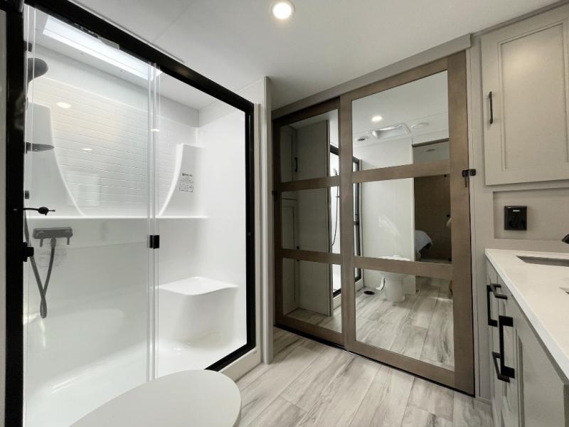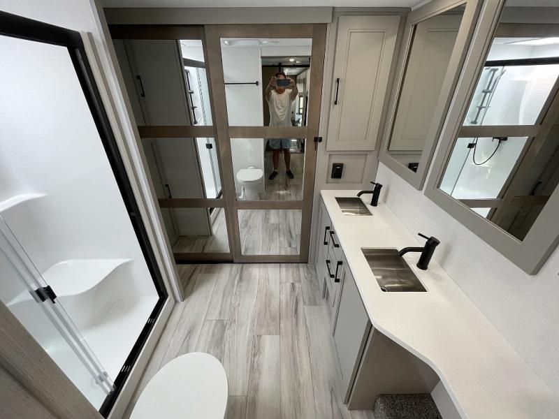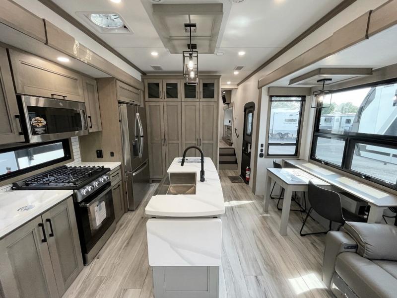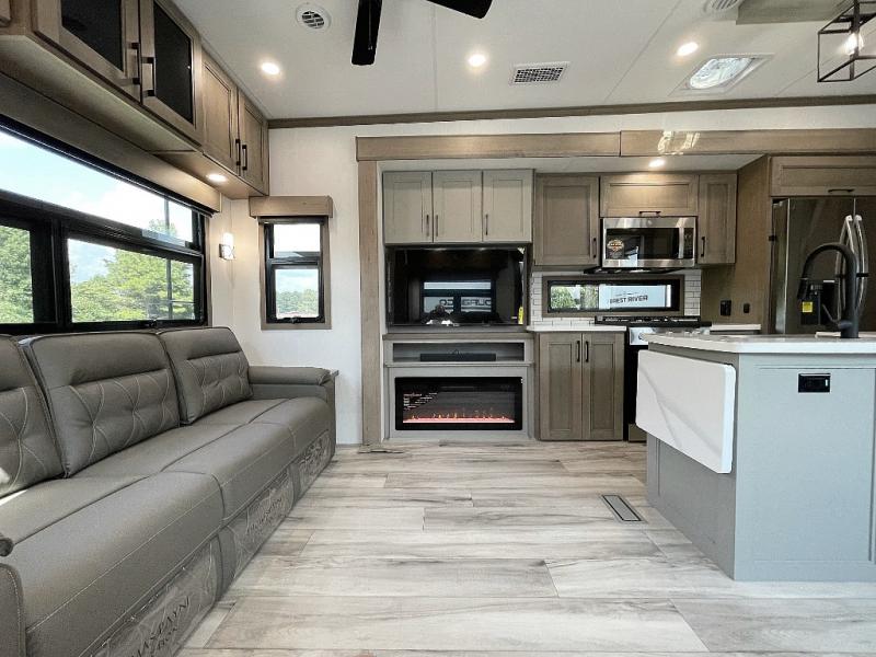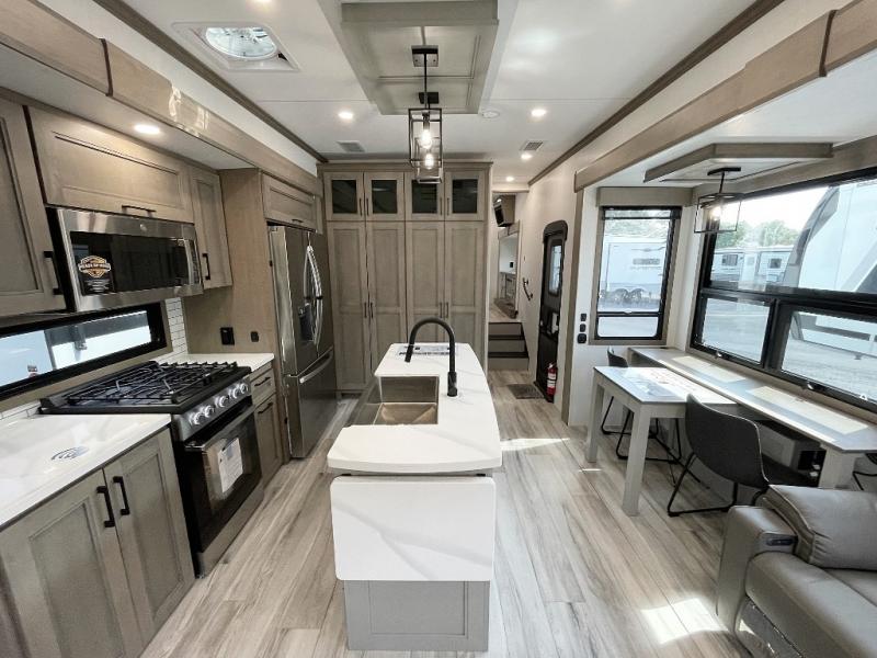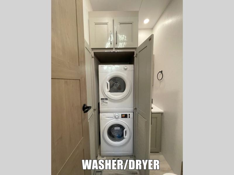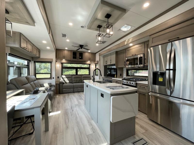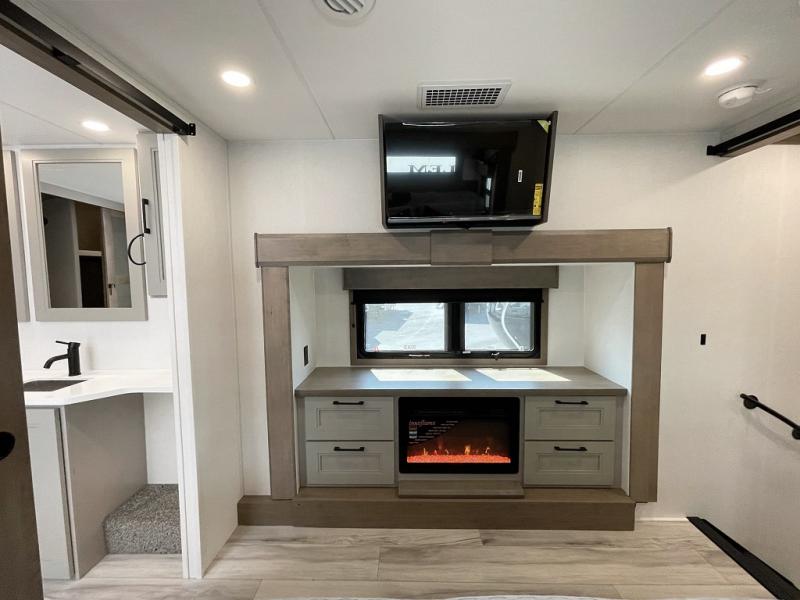 With a bath and a half, everyone will stay clean in this fifth wheel! The front full bathroom has a dual sink vanity for two to get ready at once, a 48" x 30" shower with a seat, and a front closet for your clothes. You can enter into the master suite from the bathroom and relax on the electric tilt king bed slide, store your things in the underbed drawers, and watch a movie in bed with the Smart LED TV. The half bathroom is directly off of the kitchen, and this room includes washer and dryer prep if you choose to add these appliances. You can prepare dinner at the four burner cooktop with a 24" oven and kitchen island, which also has a dishwasher for easy clean ups. Eat your meals at the sliding table/desk and then let your stomach settle while relaxing on the rear hide-a-bed sofa or theater seating across from the entertainment center with 40" fireplace!
