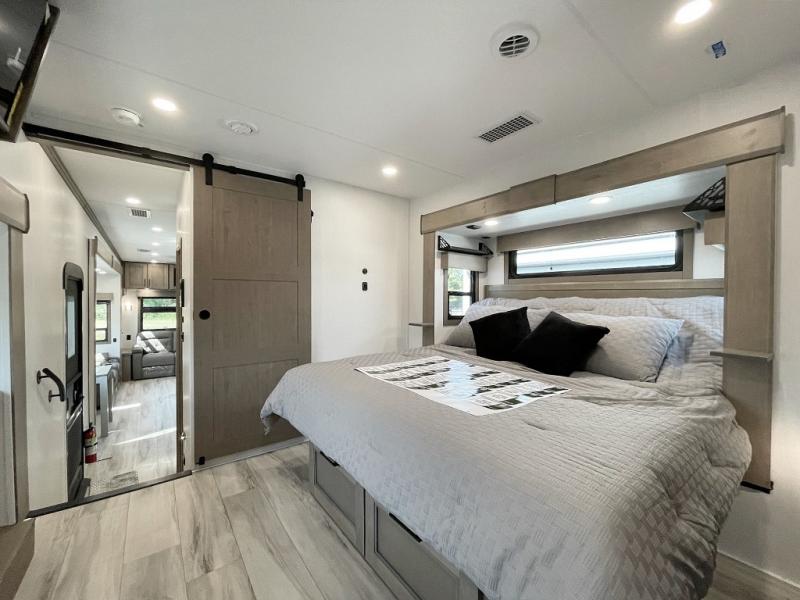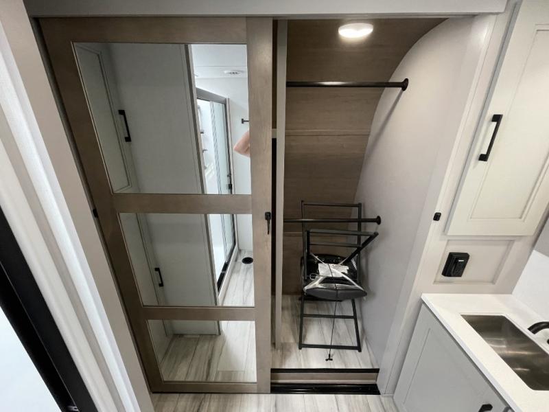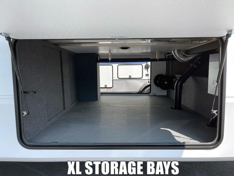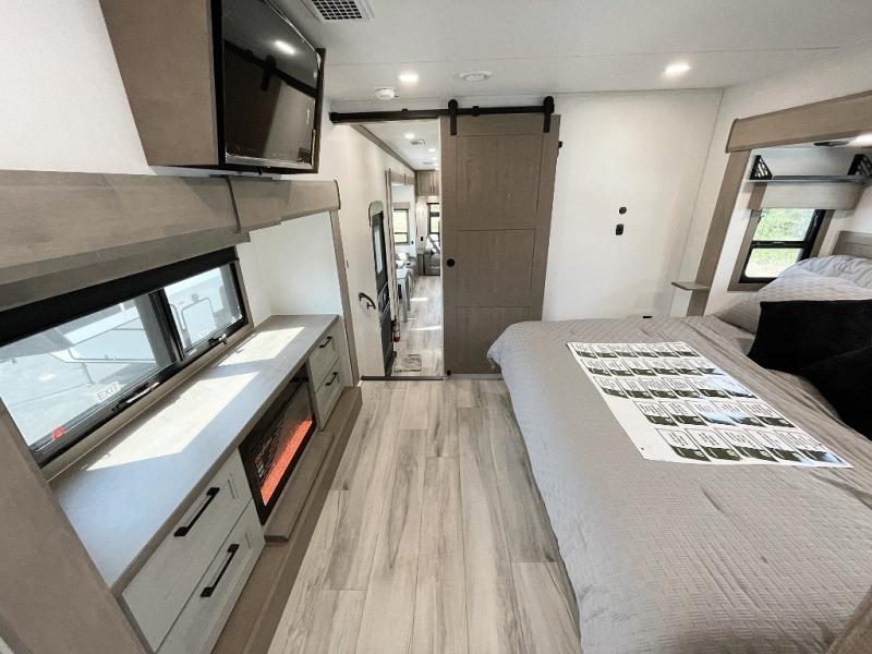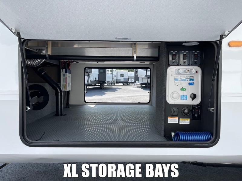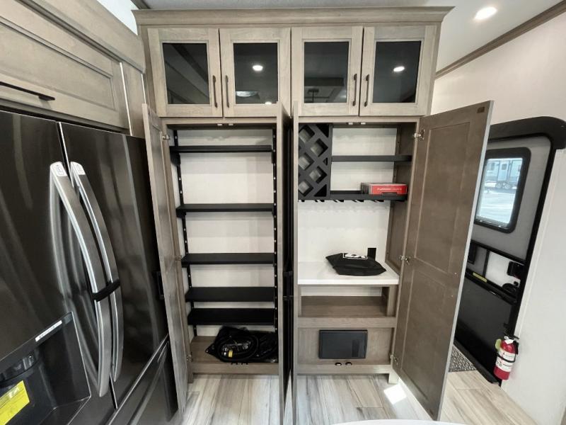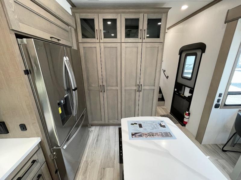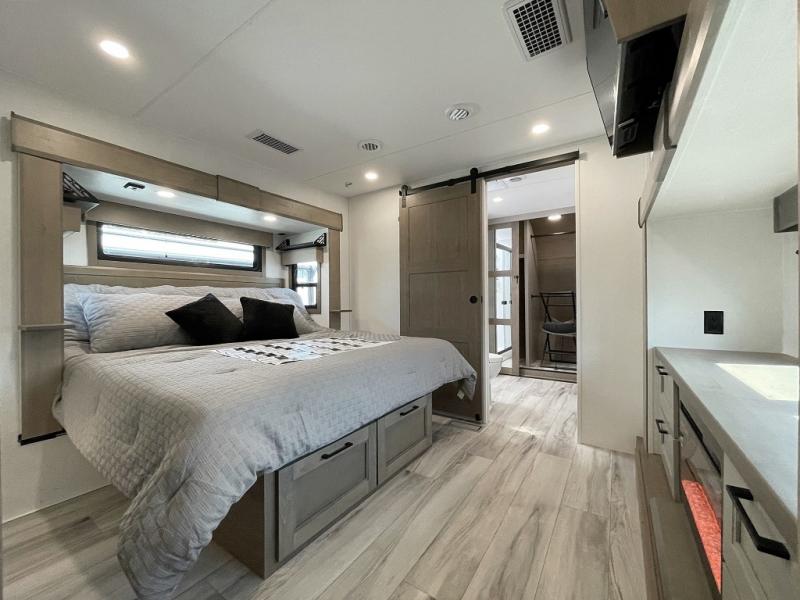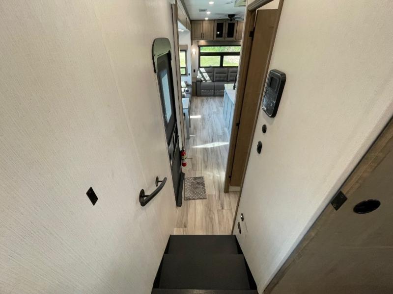 With a bath and a half, everyone will stay clean in this fifth wheel! The front full bathroom has a dual sink vanity for two to get ready at once, a 48" x 30" shower with a seat, and a front closet for your clothes. You can enter into the master suite from the bathroom and relax on the electric tilt king bed slide, store your things in the underbed drawers, and watch a movie in bed with the Smart LED TV. The half bathroom is directly off of the kitchen, and this room includes washer and dryer prep if you choose to add these appliances. You can prepare dinner at the four burner cooktop with a 24" oven and kitchen island, which also has a dishwasher for easy clean ups. Eat your meals at the sliding table/desk and then let your stomach settle while relaxing on the rear hide-a-bed sofa or theater seating across from the entertainment center with 40" fireplace!