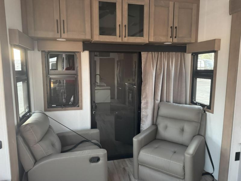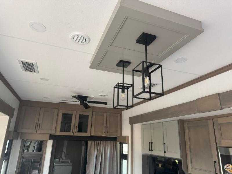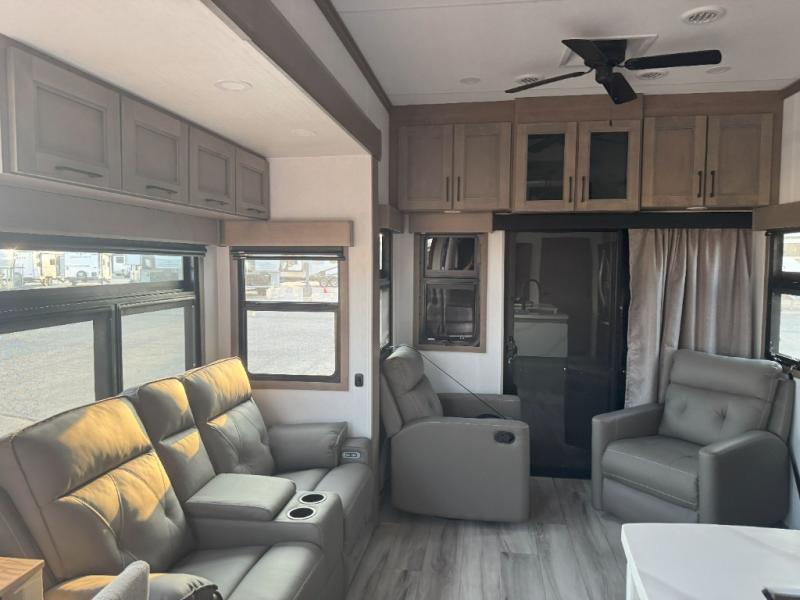 With any KZ Durango Gold full-time luxury fifth wheel, you will enjoy the new Blancher Maple and Morel Fog cabinetry, stainless steel appliances such as a 30" convection microwave and 24" oven with a four burner range, plus a stainless dishwasher. Other top features include an electric tilt bed with Serta Comfort foam king mattress, three 15K A/C units, plus theater seating with powered recline, heat and massage features. You will also appreciate a handy central vacuum system with attachments that stores out of sight. Each Durango Gold is constructed with six-sided aluminum framing, and has a heated, insulated and an enclosed underbelly. It is also constructed with Tufflex roofing material which is flexible, puncture resistant, and reflective. The now standard "Off The Grid" solar package includes two 200W solar panels, a 30A MPPT solar charge controller, and a 2,000W True Sine Wave inverter for off-grid capabilities. If you're wanting to go completely off-grid, you might want to choose the optional Boondocker Solar System with even more features that won't require you to be close to electric hookups!