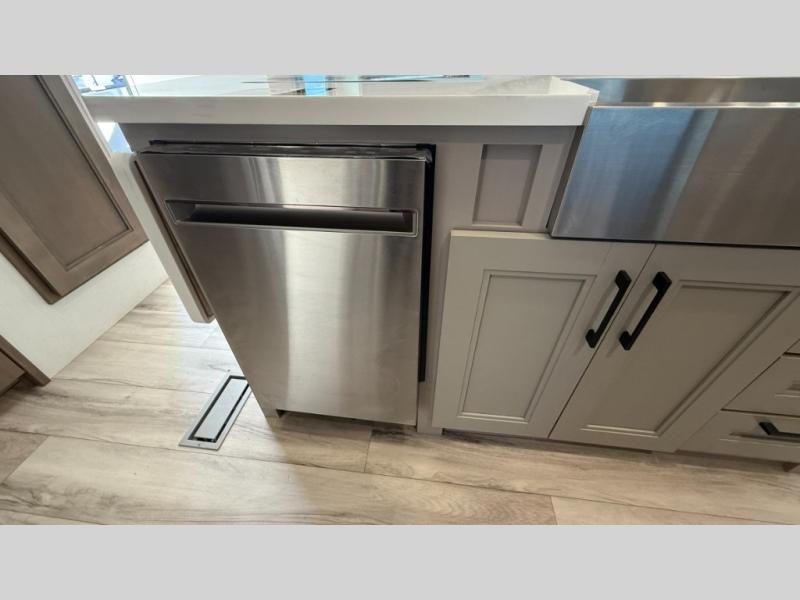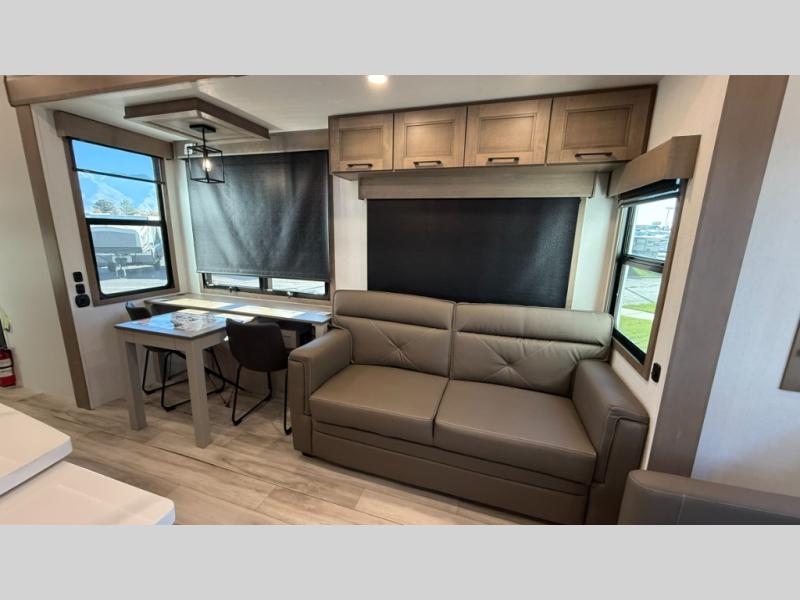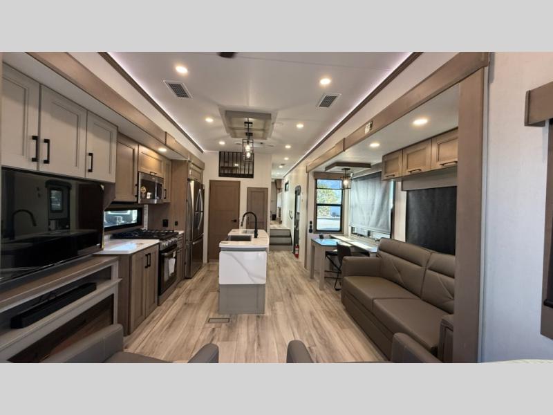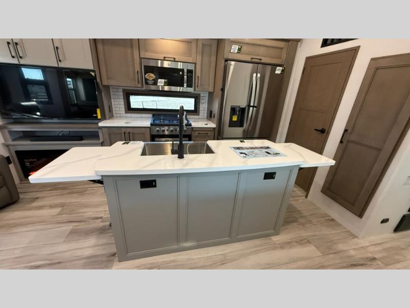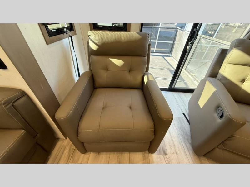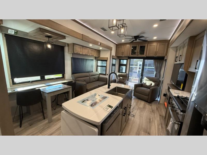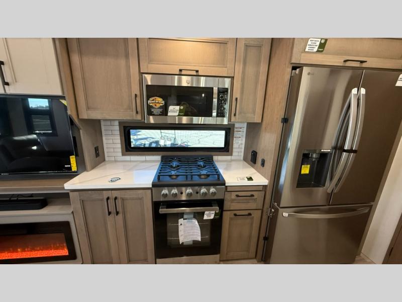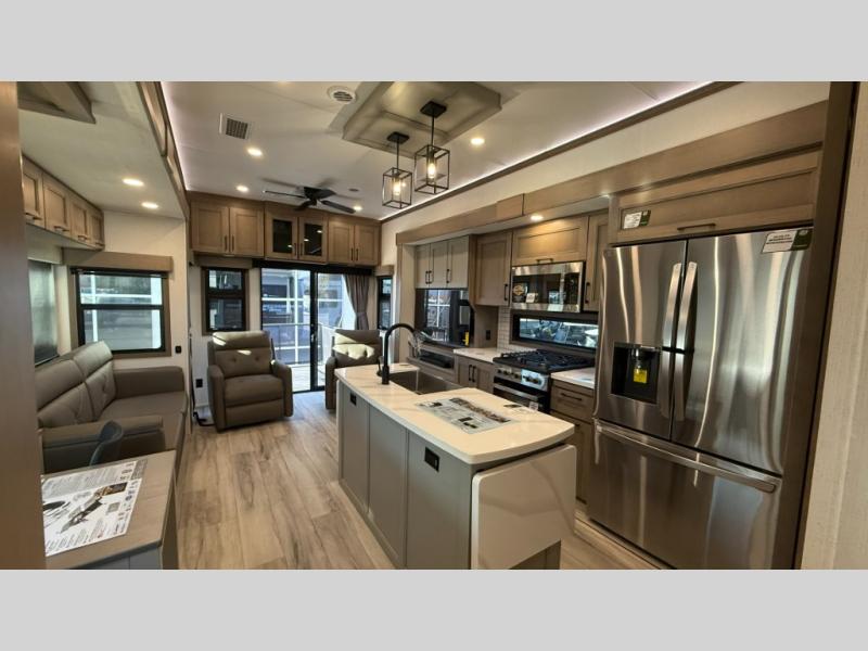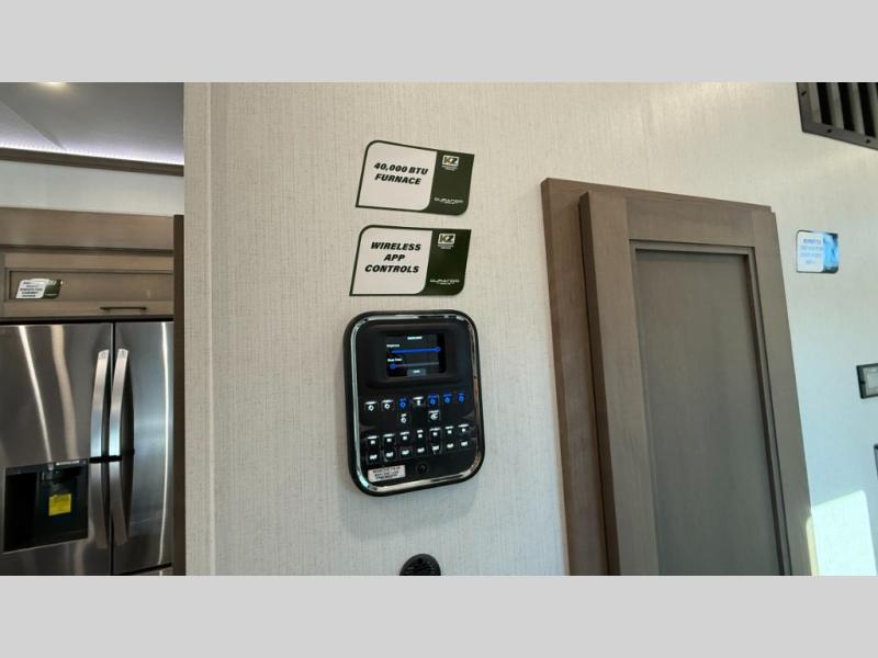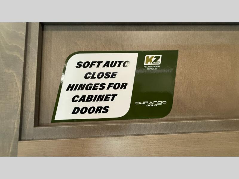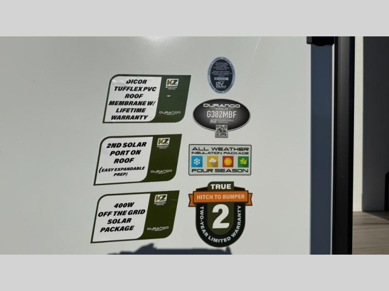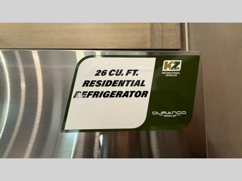 With any KZ Durango Gold full-time luxury fifth wheel, you will enjoy the new Blancher Maple and Morel Fog cabinetry, stainless steel appliances such as a 30" convection microwave and 24" oven with a four burner range, plus a stainless dishwasher. Other top features include an electric tilt bed with Serta Comfort foam king mattress, three 15K A/C units, plus theater seating with powered recline, heat and massage features. You will also appreciate a handy central vacuum system with attachments that stores out of sight. Each Durango Gold is constructed with six-sided aluminum framing, and has a heated, insulated and an enclosed underbelly. It is also constructed with Tufflex roofing material which is flexible, puncture resistant, and reflective. The now mandatory "Off The Grid" solar package includes two 200W solar panels, a 30A MPPT solar charge controller, and a 2,000W True Sine Wave inverter for off-grid capabilities.