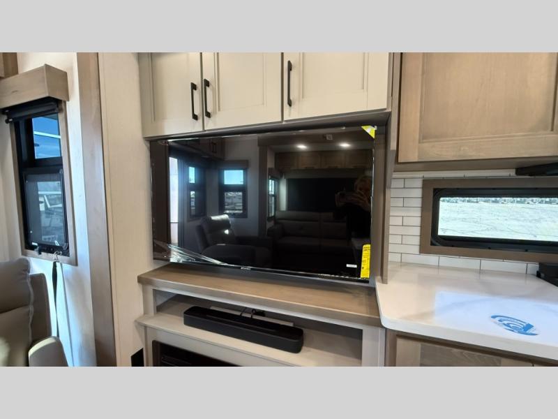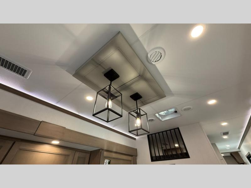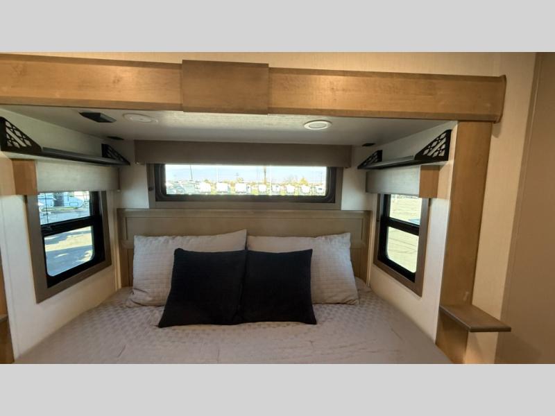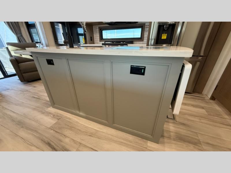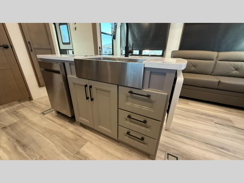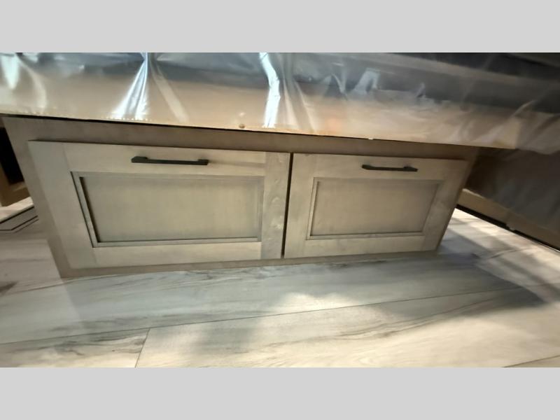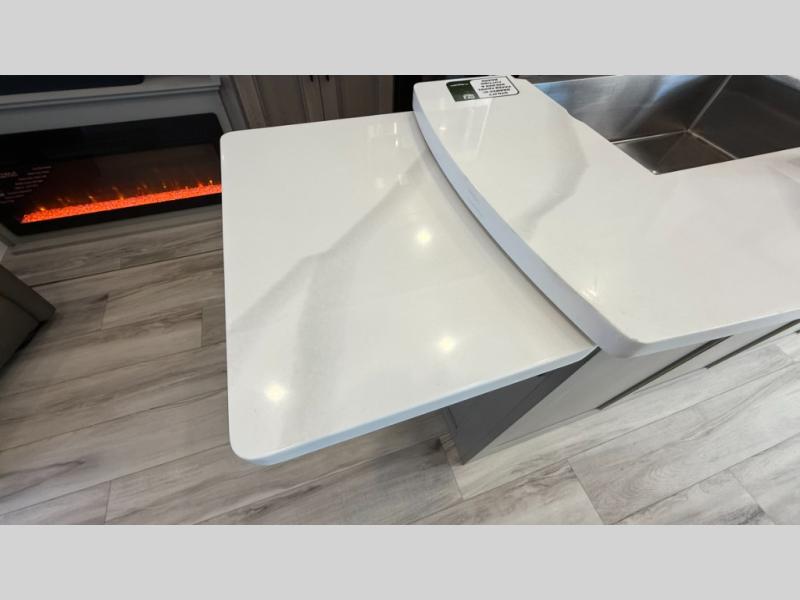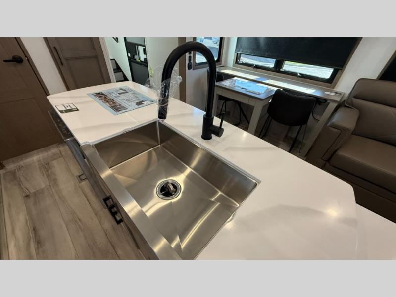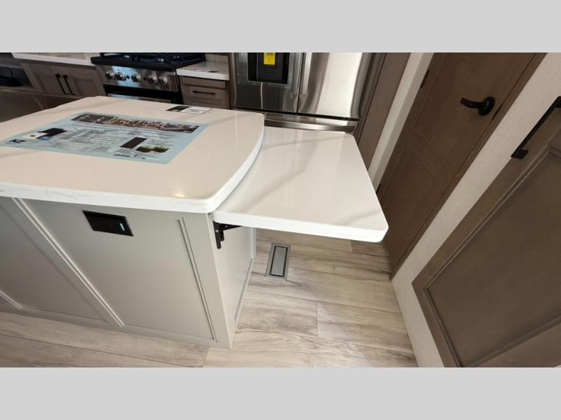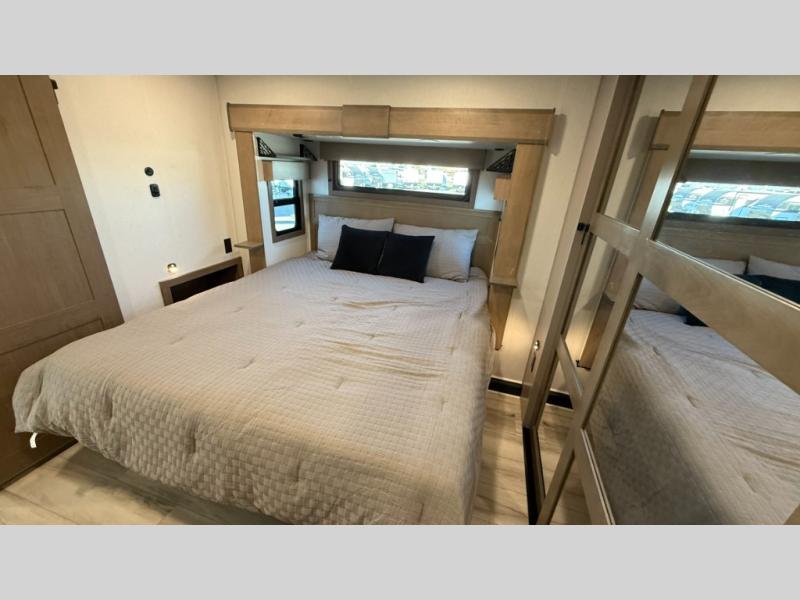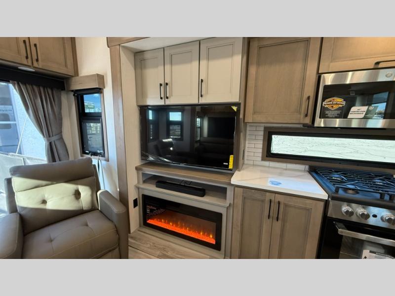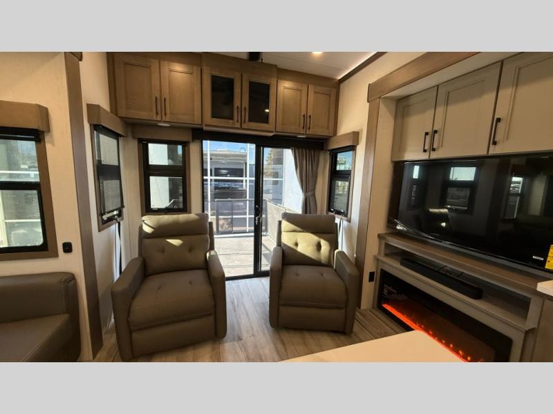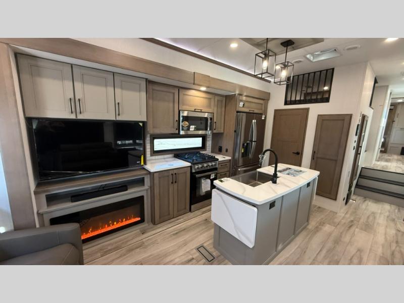 With any KZ Durango Gold full-time luxury fifth wheel, you will enjoy the new Blancher Maple and Morel Fog cabinetry, stainless steel appliances such as a 30" convection microwave and 24" oven with a four burner range, plus a stainless dishwasher. Other top features include an electric tilt bed with Serta Comfort foam king mattress, three 15K A/C units, plus theater seating with powered recline, heat and massage features. You will also appreciate a handy central vacuum system with attachments that stores out of sight. Each Durango Gold is constructed with six-sided aluminum framing, and has a heated, insulated and an enclosed underbelly. It is also constructed with Tufflex roofing material which is flexible, puncture resistant, and reflective. The now mandatory "Off The Grid" solar package includes two 200W solar panels, a 30A MPPT solar charge controller, and a 2,000W True Sine Wave inverter for off-grid capabilities.