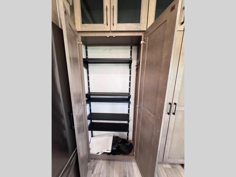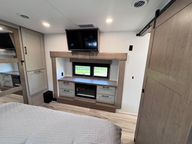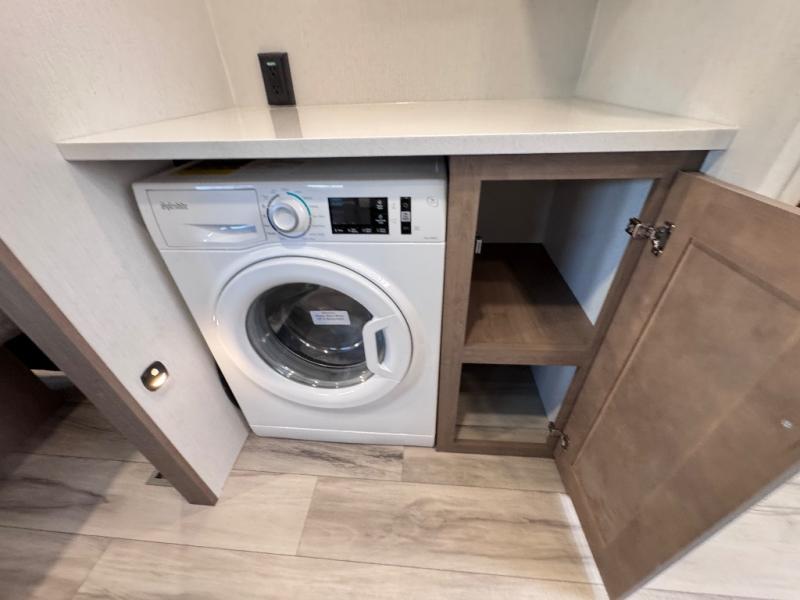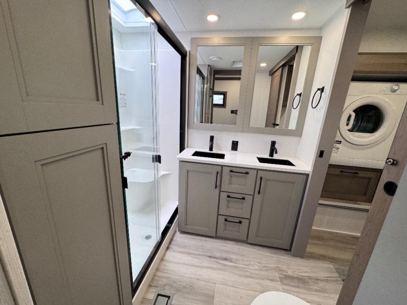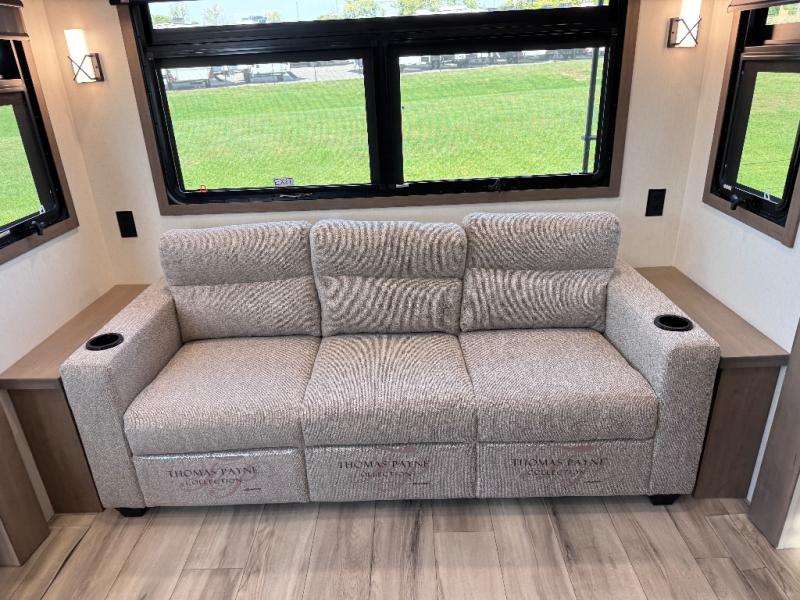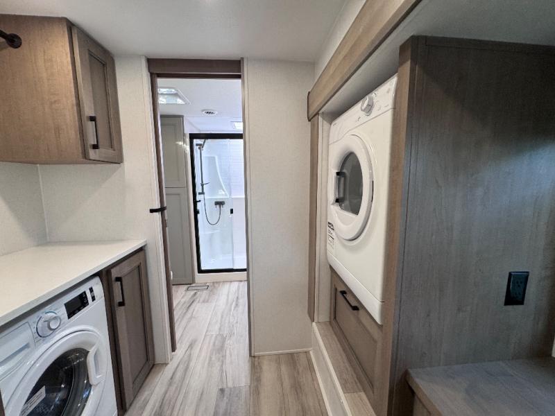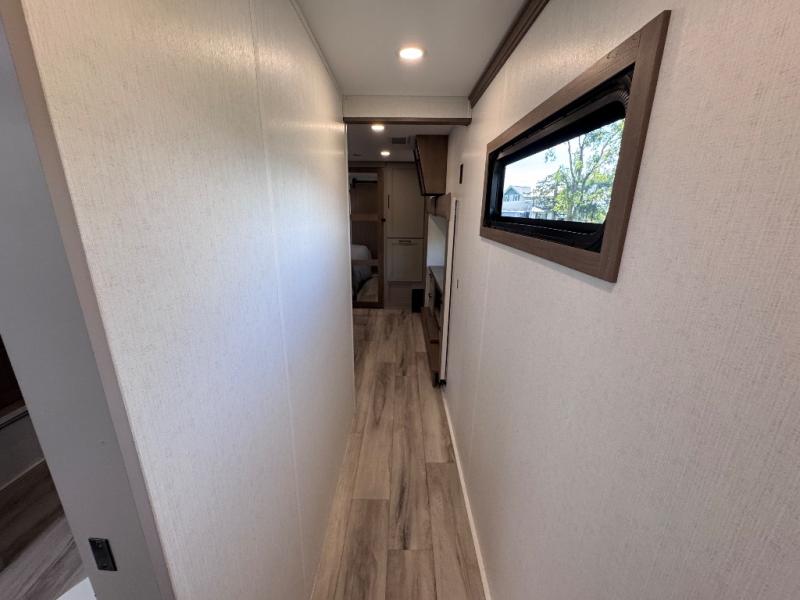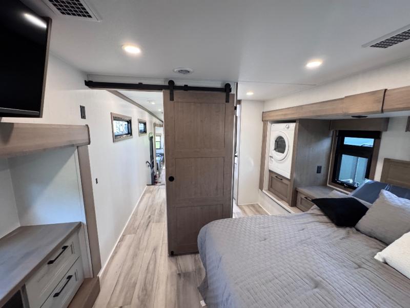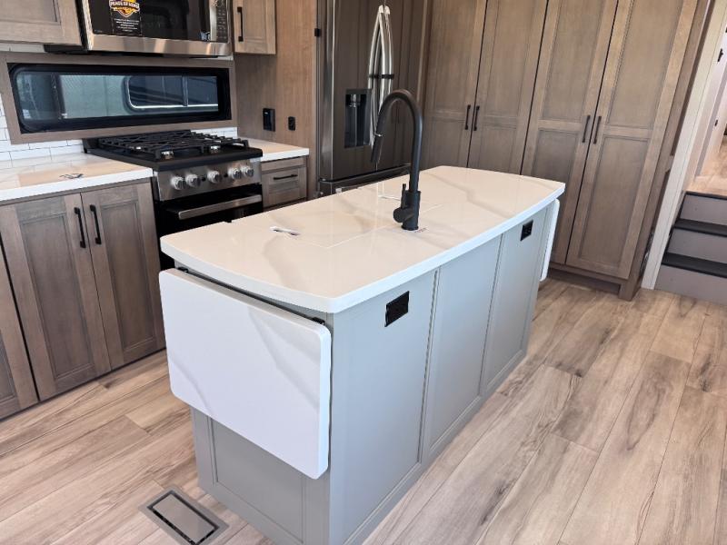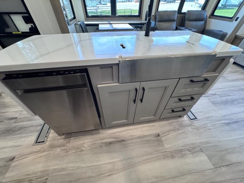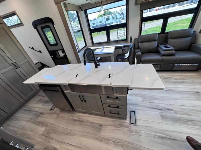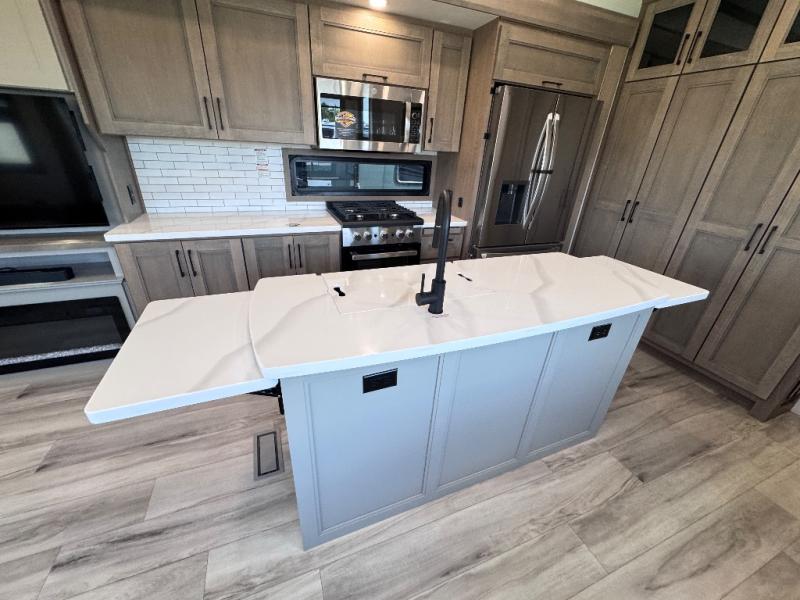 At the front of this unit, the main bedroom offers a comfortable 70" x 80" electric tilt king bed for a restful night’s sleep, complete with drawers beneath for extra storage. A large front closet and a dresser provide even more space for clothing and essentials, and a 32" Smart LED TV lets you enjoy your favorite series right from bed. Down the hall, the bathroom and laundry center can be accessed from both the bedroom and main hallway for added convenience. The bathroom features a 48" x 30" residential shower with a built-in seat, along with dual sinks to make busy mornings easier. Moving to the rear, the spacious living and kitchen area opens up with dual opposing slides. One slide houses the entertainment center with a 40" fireplace and swing-arm TV, while beside it you’ll find generous countertop space, a 24" oven with four-burner range, a 30" convection microwave with air fryer, and a 26-cu. ft. refrigerator giving you everything you need to cook like a pro. A pantry and a coffee bar with wine storage add convenience for both quiet mornings and entertaining guests. At the center, the kitchen island offers even more prep space and includes a stainless steel dishwasher. The opposite slide features theater seating and a versatile sliding table/desk perfect for lounging, dining, or getting work done, and the rear hide-a-bed sofa provides additional seating during the day and converts into a comfortable sleeping space for guests at night.