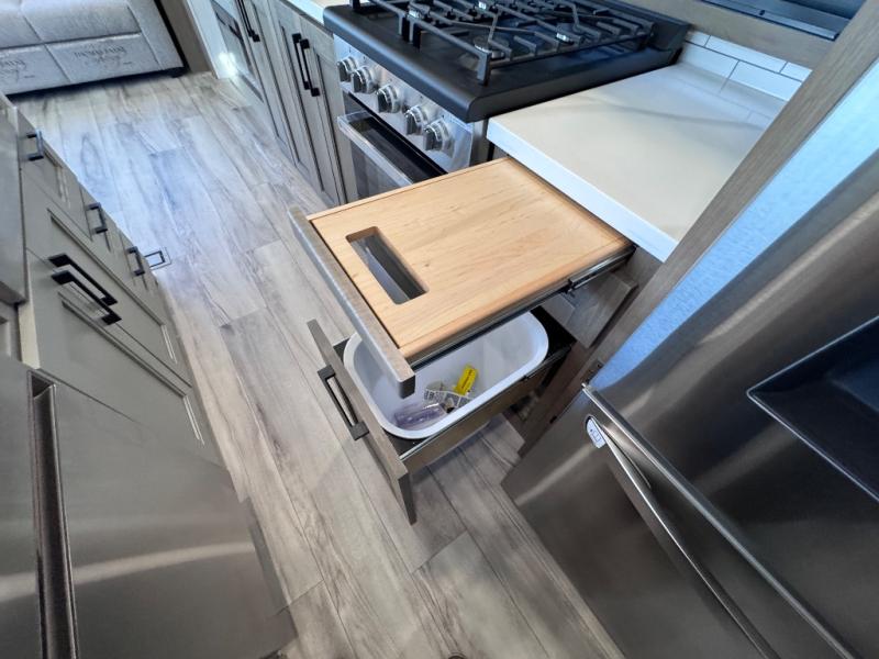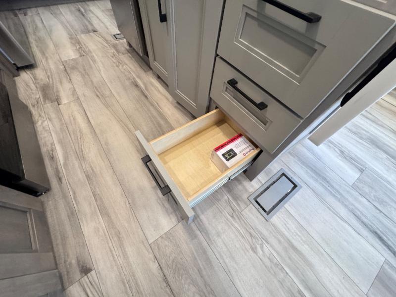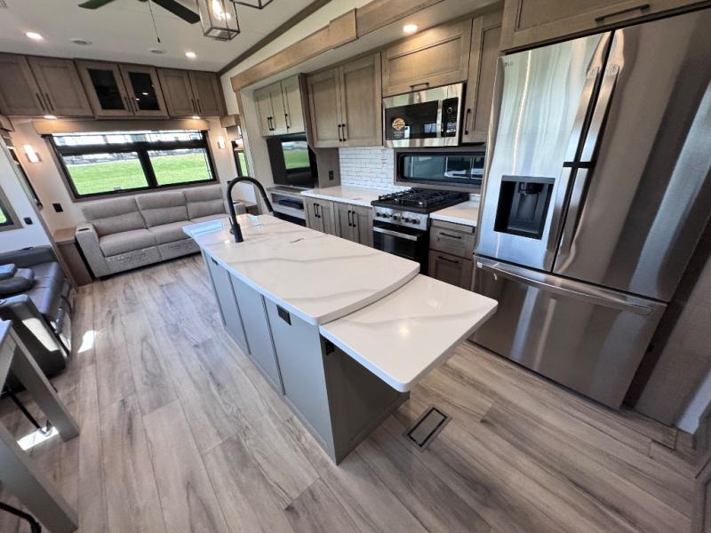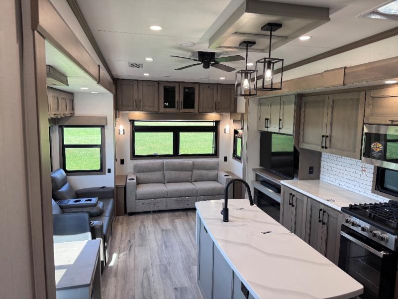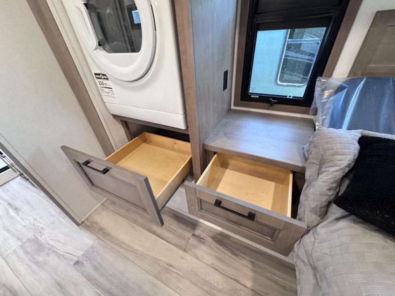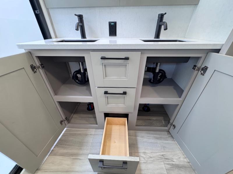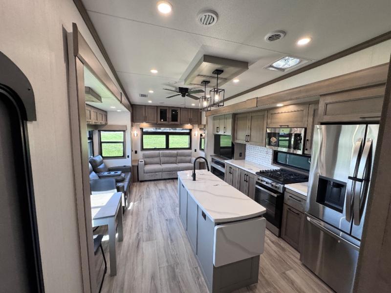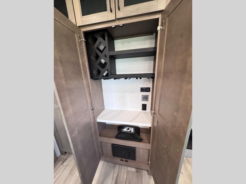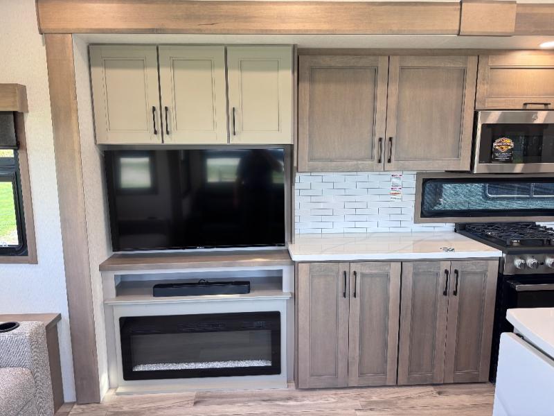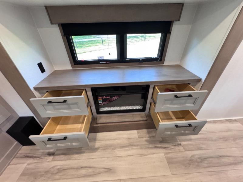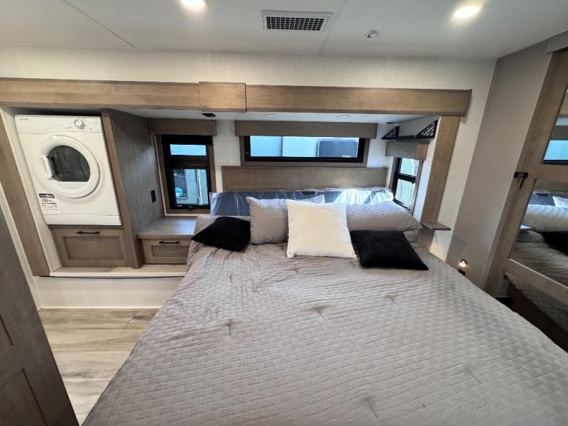 At the front of this unit, the main bedroom offers a comfortable 70" x 80" electric tilt king bed for a restful night’s sleep, complete with drawers beneath for extra storage. A large front closet and a dresser provide even more space for clothing and essentials, and a 32" Smart LED TV lets you enjoy your favorite series right from bed. Down the hall, the bathroom and laundry center can be accessed from both the bedroom and main hallway for added convenience. The bathroom features a 48" x 30" residential shower with a built-in seat, along with dual sinks to make busy mornings easier. Moving to the rear, the spacious living and kitchen area opens up with dual opposing slides. One slide houses the entertainment center with a 40" fireplace and swing-arm TV, while beside it you’ll find generous countertop space, a 24" oven with four-burner range, a 30" convection microwave with air fryer, and a 26-cu. ft. refrigerator giving you everything you need to cook like a pro. A pantry and a coffee bar with wine storage add convenience for both quiet mornings and entertaining guests. At the center, the kitchen island offers even more prep space and includes a stainless steel dishwasher. The opposite slide features theater seating and a versatile sliding table/desk perfect for lounging, dining, or getting work done, and the rear hide-a-bed sofa provides additional seating during the day and converts into a comfortable sleeping space for guests at night.