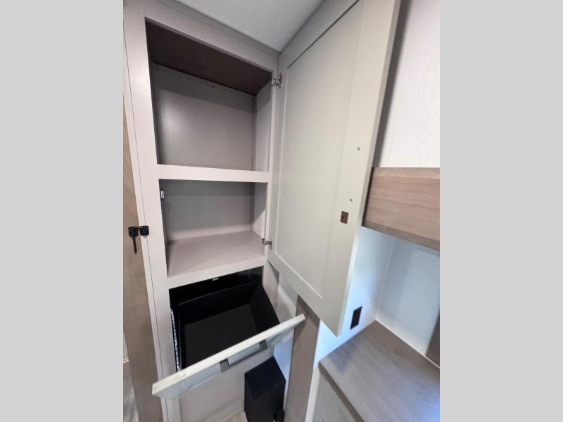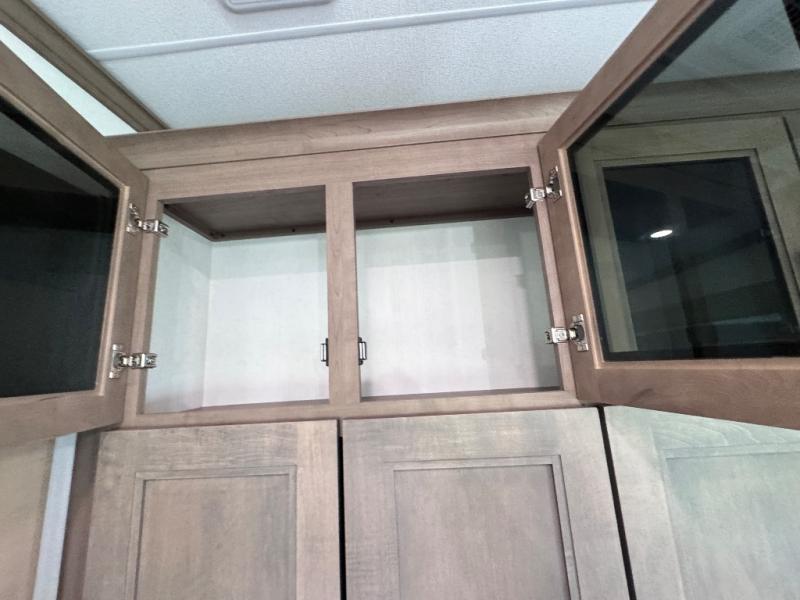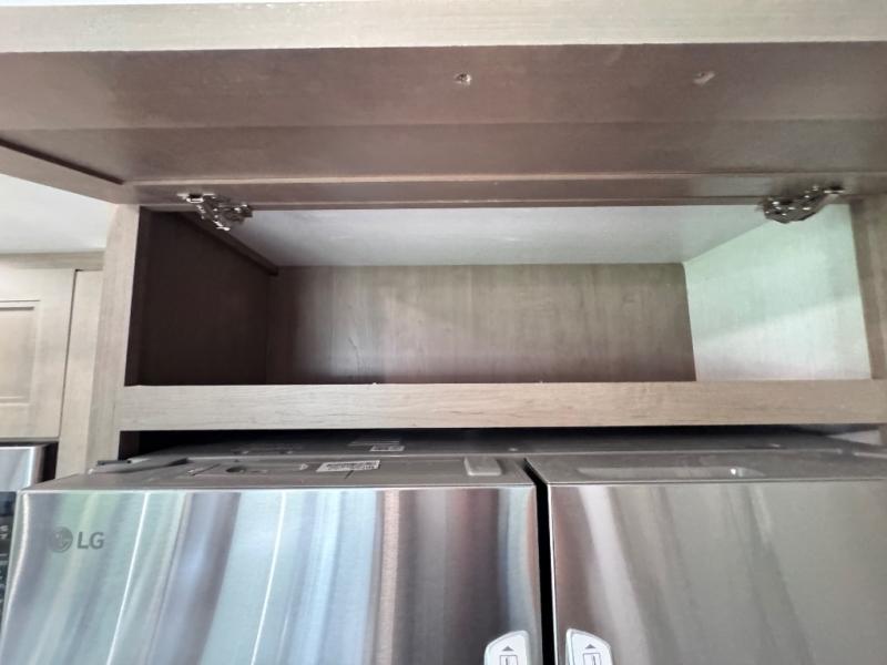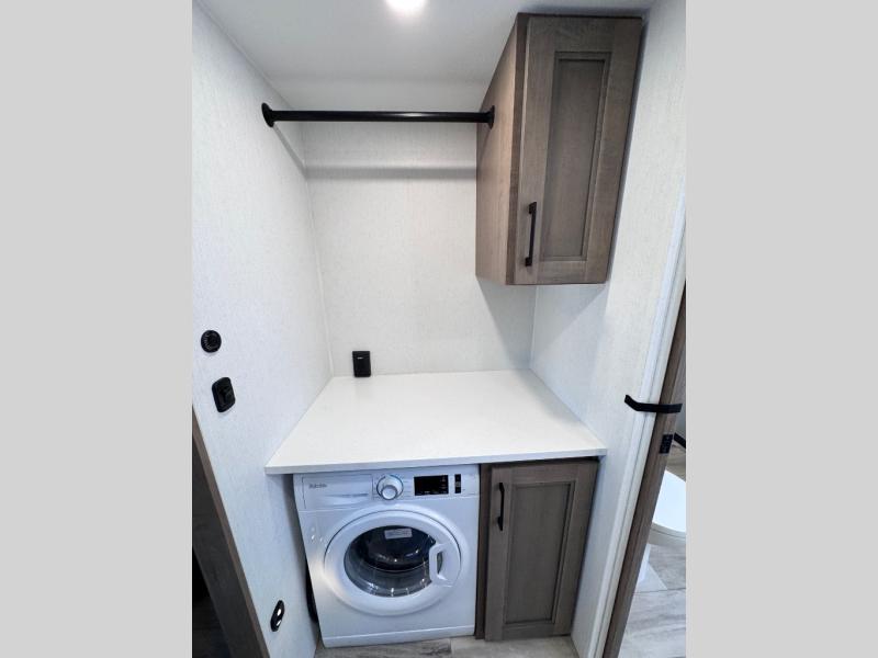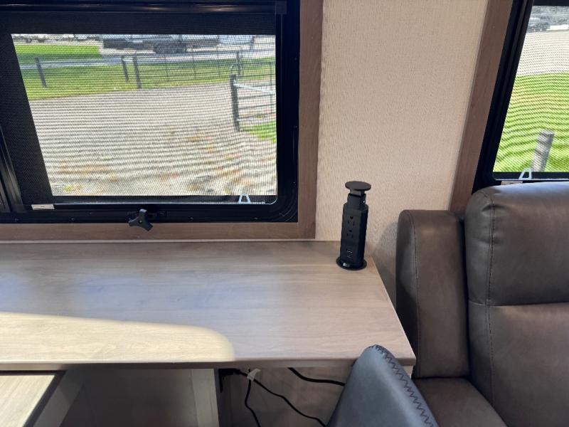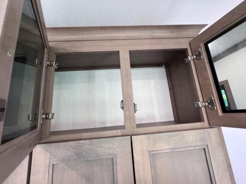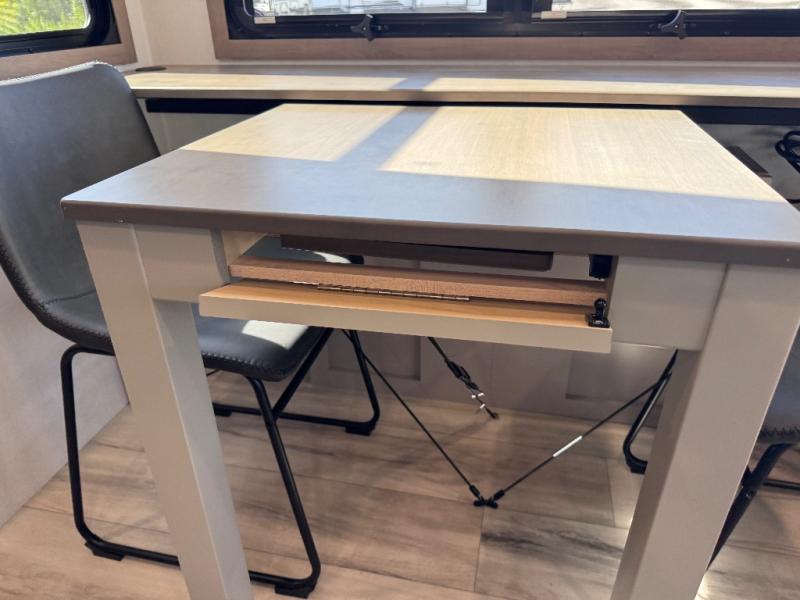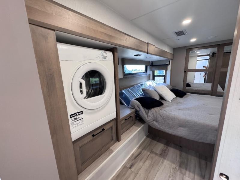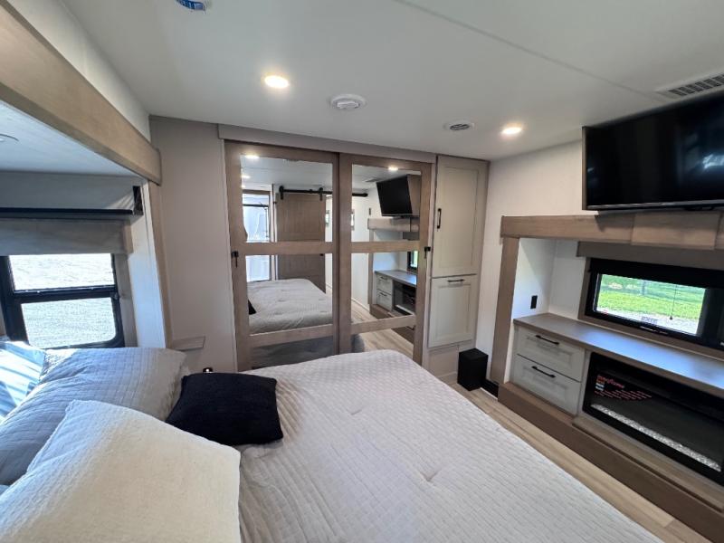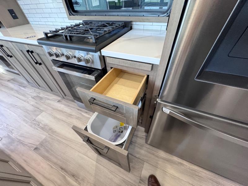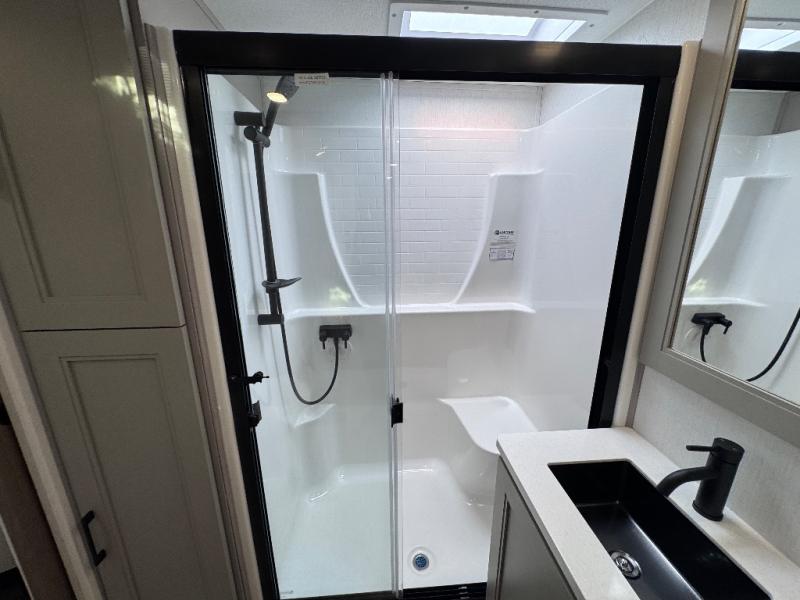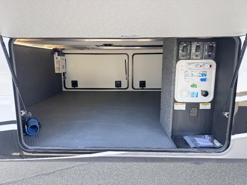 At the front of this unit, the main bedroom offers a comfortable 70" x 80" electric tilt king bed for a restful night’s sleep, complete with drawers beneath for extra storage. A large front closet and a dresser provide even more space for clothing and essentials, and a 32" Smart LED TV lets you enjoy your favorite series right from bed. Down the hall, the bathroom and laundry center can be accessed from both the bedroom and main hallway for added convenience. The bathroom features a 48" x 30" residential shower with a built-in seat, along with dual sinks to make busy mornings easier. Moving to the rear, the spacious living and kitchen area opens up with dual opposing slides. One slide houses the entertainment center with a 40" fireplace and swing-arm TV, while beside it you’ll find generous countertop space, a 24" oven with four-burner range, a 30" convection microwave with air fryer, and a 26-cu. ft. refrigerator giving you everything you need to cook like a pro. A pantry and a coffee bar with wine storage add convenience for both quiet mornings and entertaining guests. At the center, the kitchen island offers even more prep space and includes a stainless steel dishwasher. The opposite slide features theater seating and a versatile sliding table/desk perfect for lounging, dining, or getting work done, and the rear hide-a-bed sofa provides additional seating during the day and converts into a comfortable sleeping space for guests at night.