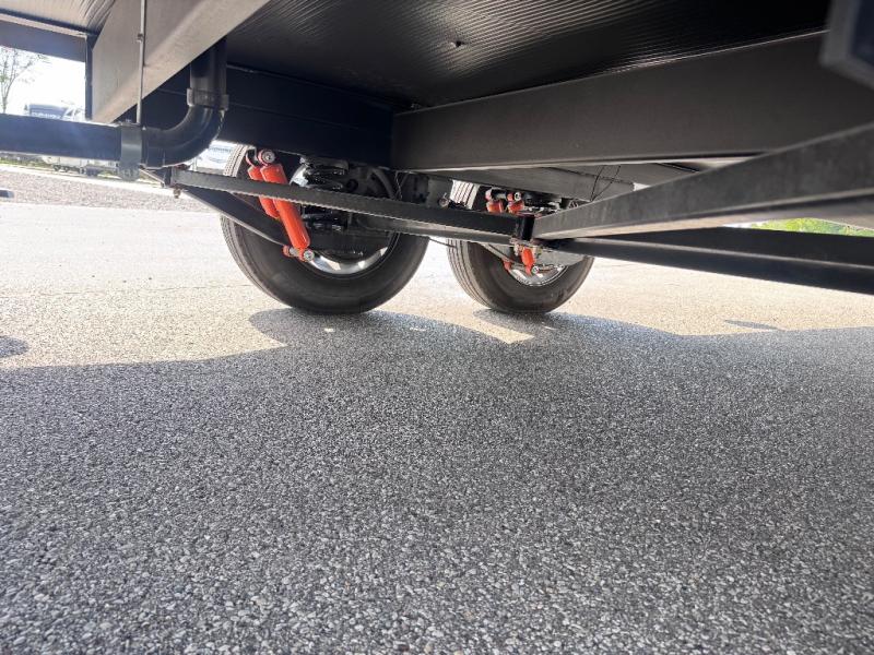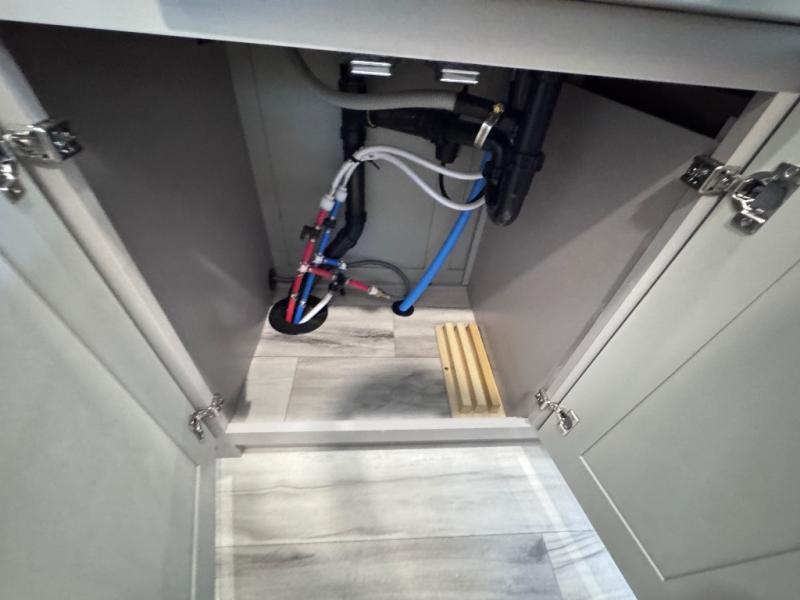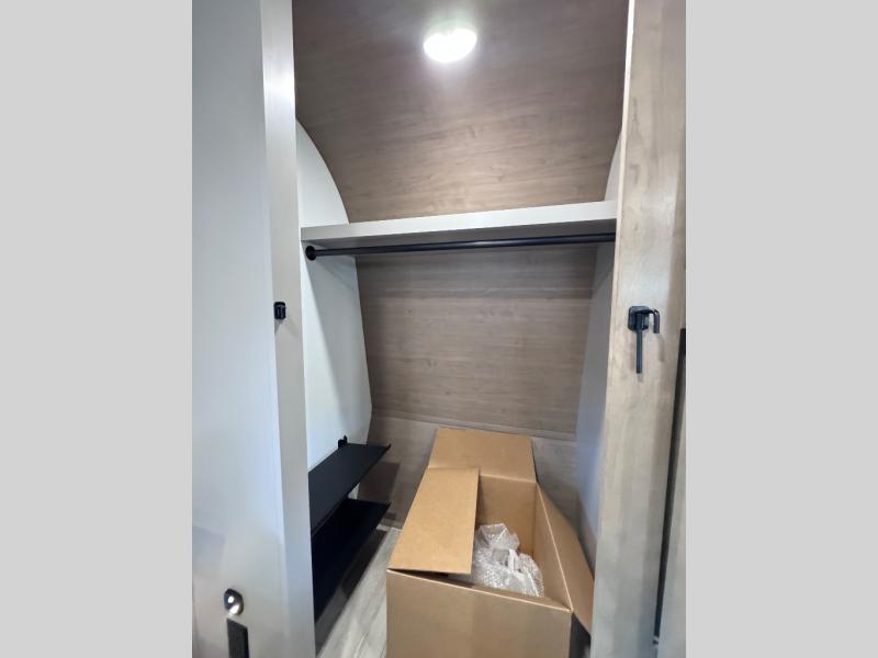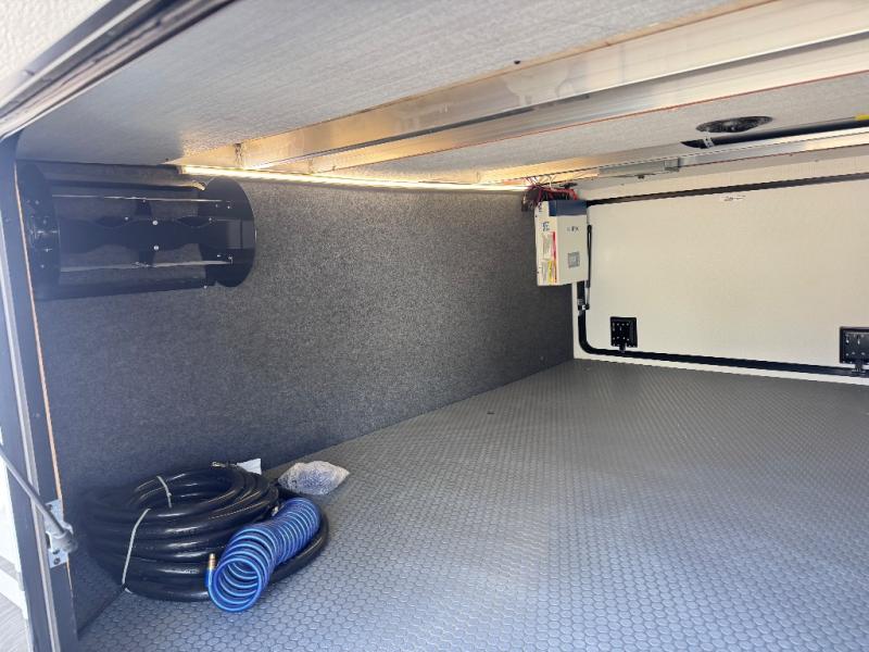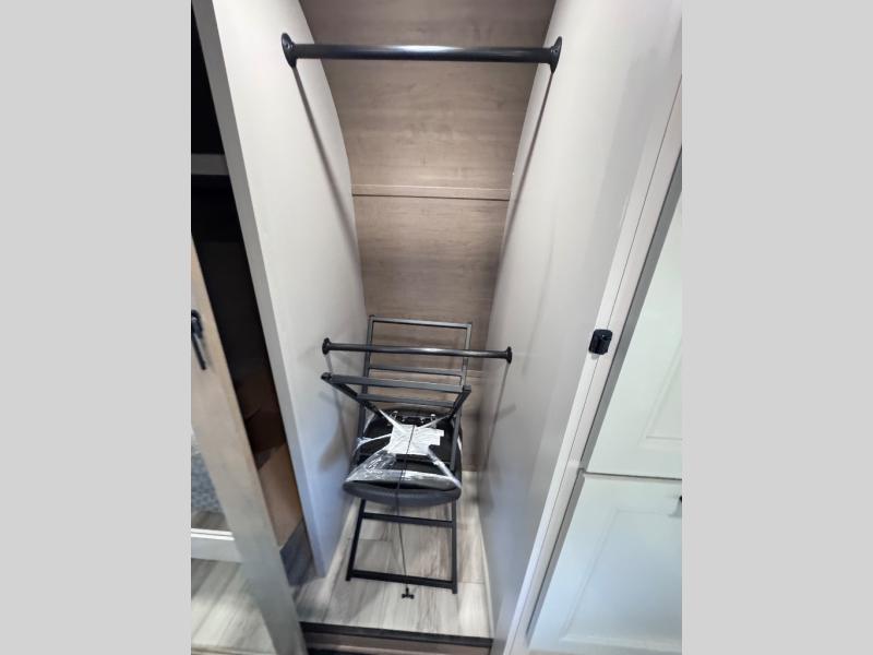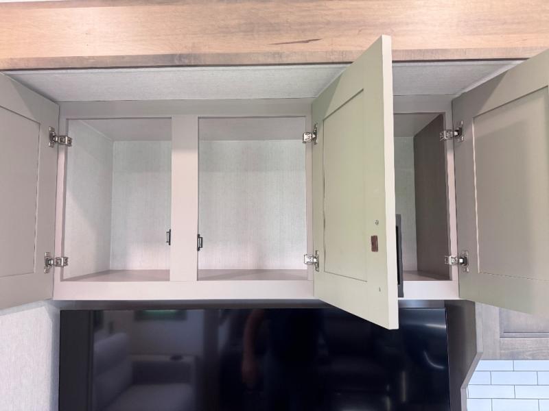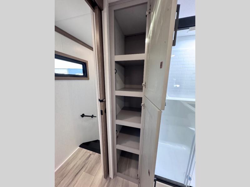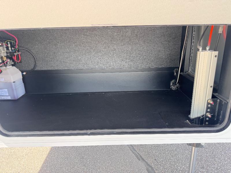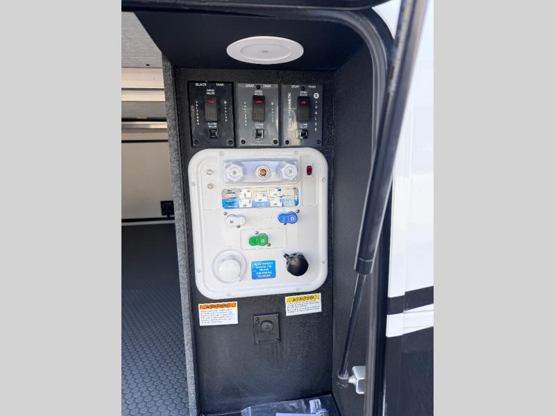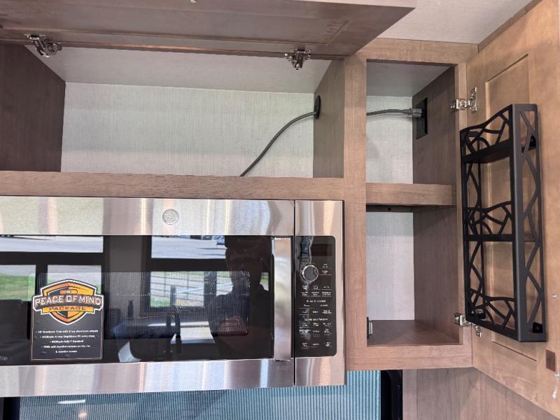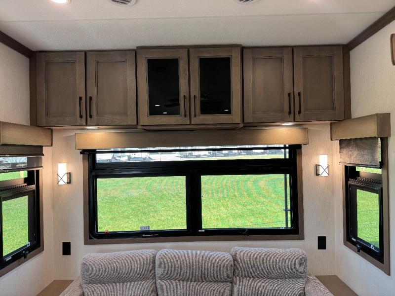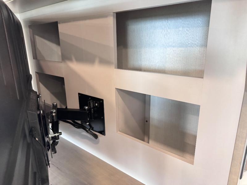 At the front of this unit, the main bedroom offers a comfortable 70" x 80" electric tilt king bed for a restful night’s sleep, complete with drawers beneath for extra storage. A large front closet and a dresser provide even more space for clothing and essentials, and a 32" Smart LED TV lets you enjoy your favorite series right from bed. Down the hall, the bathroom and laundry center can be accessed from both the bedroom and main hallway for added convenience. The bathroom features a 48" x 30" residential shower with a built-in seat, along with dual sinks to make busy mornings easier. Moving to the rear, the spacious living and kitchen area opens up with dual opposing slides. One slide houses the entertainment center with a 40" fireplace and swing-arm TV, while beside it you’ll find generous countertop space, a 24" oven with four-burner range, a 30" convection microwave with air fryer, and a 26-cu. ft. refrigerator giving you everything you need to cook like a pro. A pantry and a coffee bar with wine storage add convenience for both quiet mornings and entertaining guests. At the center, the kitchen island offers even more prep space and includes a stainless steel dishwasher. The opposite slide features theater seating and a versatile sliding table/desk perfect for lounging, dining, or getting work done, and the rear hide-a-bed sofa provides additional seating during the day and converts into a comfortable sleeping space for guests at night.