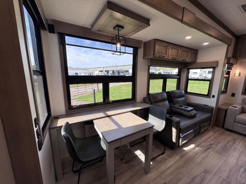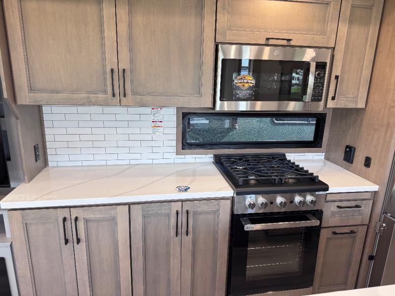 With any KZ Durango Gold full-time luxury fifth wheel, you will enjoy the new Blancher Maple and Morel Fog cabinetry, stainless steel appliances such as a 30" convection microwave and 24" oven with a four burner range, plus a stainless dishwasher. Other top features include an electric tilt bed with Serta Comfort foam king mattress, three 15K A/C units, plus theater seating with powered recline, heat and massage features. You will also appreciate a handy central vacuum system with attachments that stores out of sight. Each Durango Gold is constructed with six-sided aluminum framing, and has a heated, insulated and an enclosed underbelly. It is also constructed with Tufflex roofing material which is flexible, puncture resistant, and reflective. The now mandatory "Off The Grid" solar package includes two 200W solar panels, a 30A MPPT solar charge controller, and a 2,000W True Sine Wave inverter for off-grid capabilities.