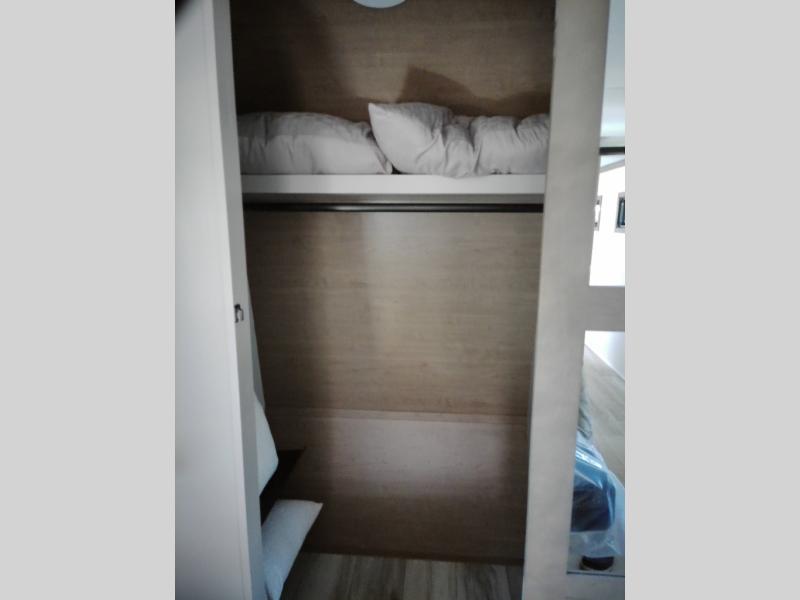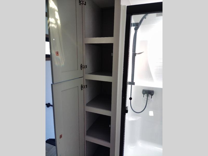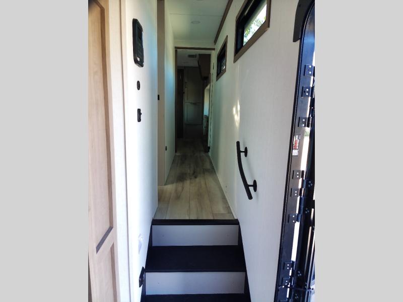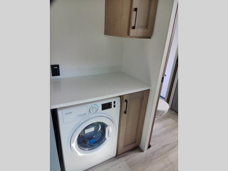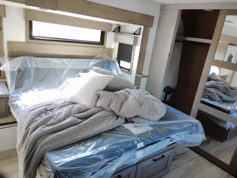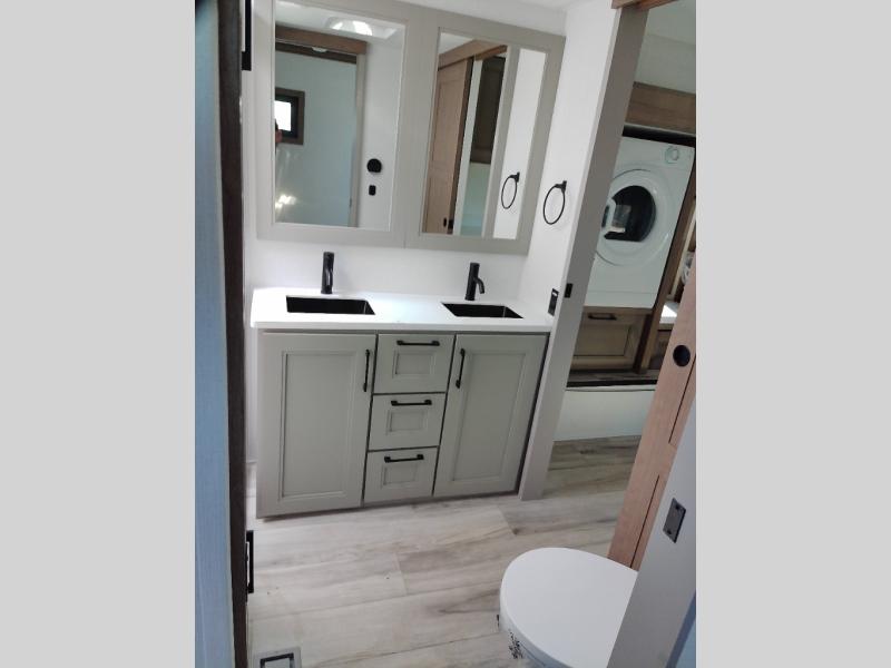 At the front of this unit, the main bedroom offers a comfortable 70" x 80" electric tilt king bed for a restful night’s sleep, complete with drawers beneath for extra storage. A large front closet and a dresser provide even more space for clothing and essentials, and a 32" Smart LED TV lets you enjoy your favorite series right from bed. Down the hall, the bathroom and laundry center can be accessed from both the bedroom and main hallway for added convenience. The bathroom features a 48" x 30" residential shower with a built-in seat, along with dual sinks to make busy mornings easier. Moving to the rear, the spacious living and kitchen area opens up with dual opposing slides. One slide houses the entertainment center with a 40" fireplace and swing-arm TV, while beside it you’ll find generous countertop space, a 24" oven with four-burner range, a 30" convection microwave with air fryer, and a 26-cu. ft. refrigerator giving you everything you need to cook like a pro. A pantry and a coffee bar with wine storage add convenience for both quiet mornings and entertaining guests. At the center, the kitchen island offers even more prep space and includes a stainless steel dishwasher. The opposite slide features theater seating and a versatile sliding table/desk perfect for lounging, dining, or getting work done, and the rear hide-a-bed sofa provides additional seating during the day and converts into a comfortable sleeping space for guests at night.