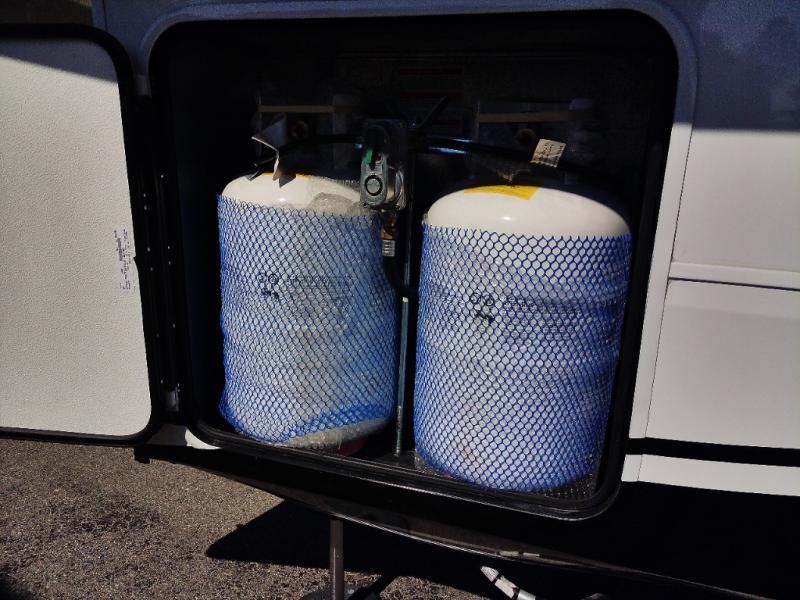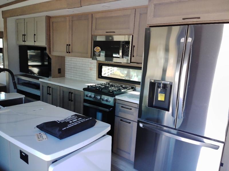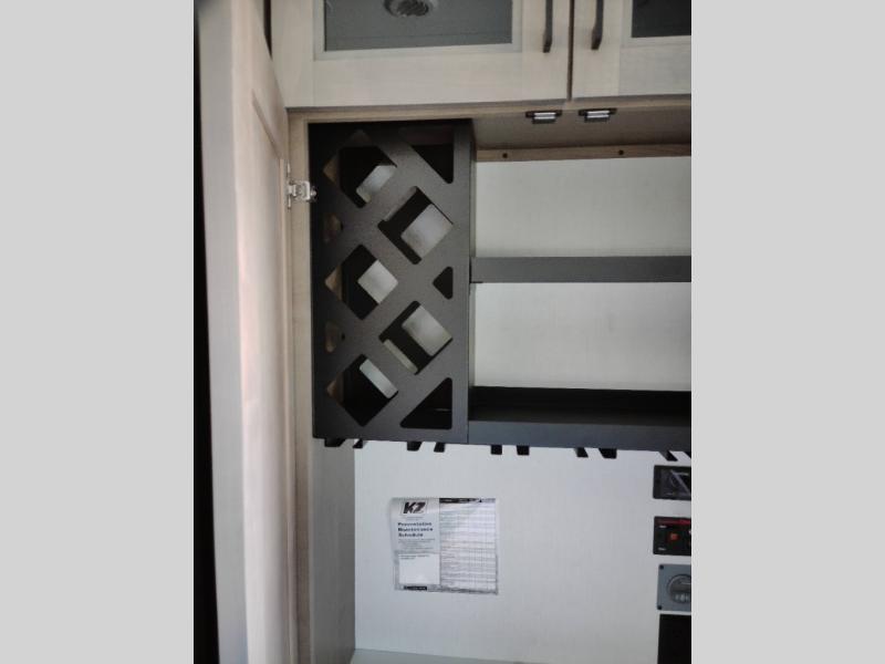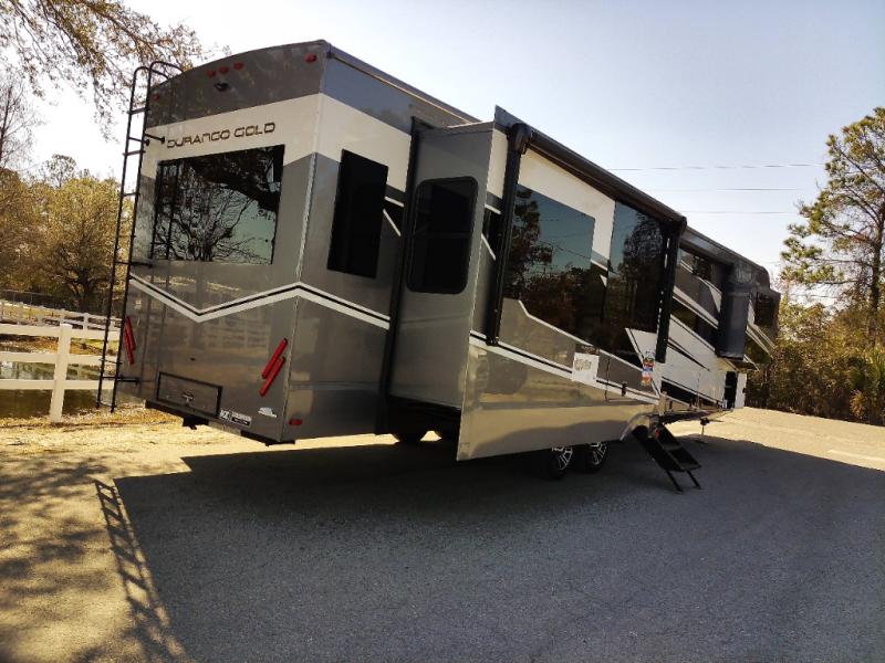 With any KZ Durango Gold full-time luxury fifth wheel, you will enjoy the new Blancher Maple and Morel Fog cabinetry, stainless steel appliances such as a 30" convection microwave and 24" oven with a four burner range, plus a stainless dishwasher. Other top features include an electric tilt bed with Serta Comfort foam king mattress, three 15K A/C units, plus theater seating with powered recline, heat and massage features. You will also appreciate a handy central vacuum system with attachments that stores out of sight. Each Durango Gold is constructed with six-sided aluminum framing, and has a heated, insulated and an enclosed underbelly. It is also constructed with Tufflex roofing material which is flexible, puncture resistant, and reflective. The now mandatory "Off The Grid" solar package includes two 200W solar panels, a 30A MPPT solar charge controller, and a 2,000W True Sine Wave inverter for off-grid capabilities.