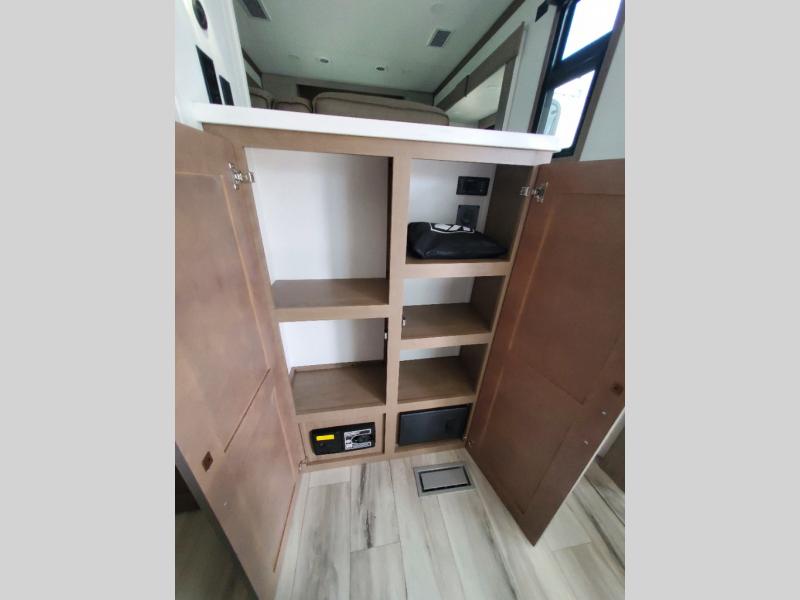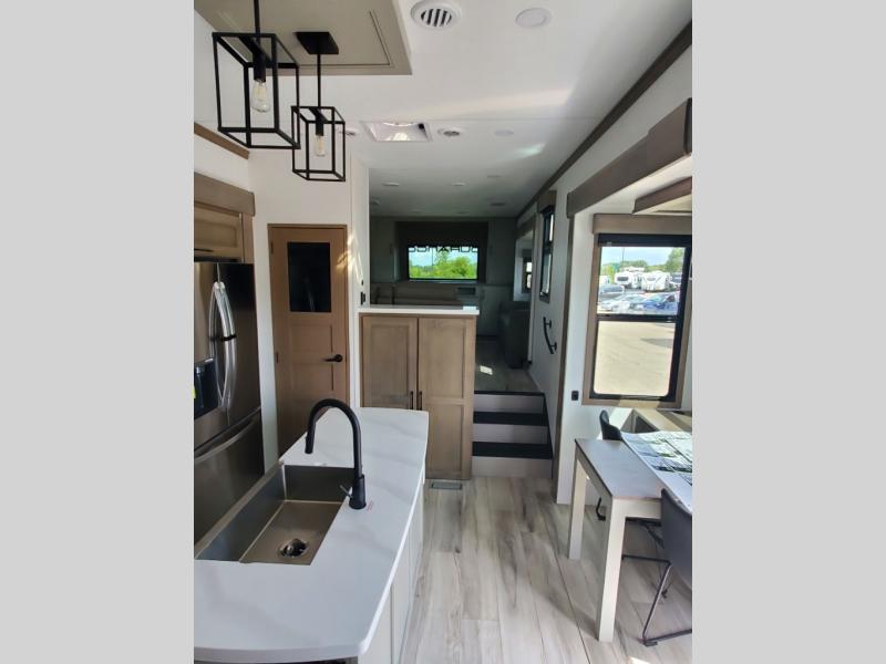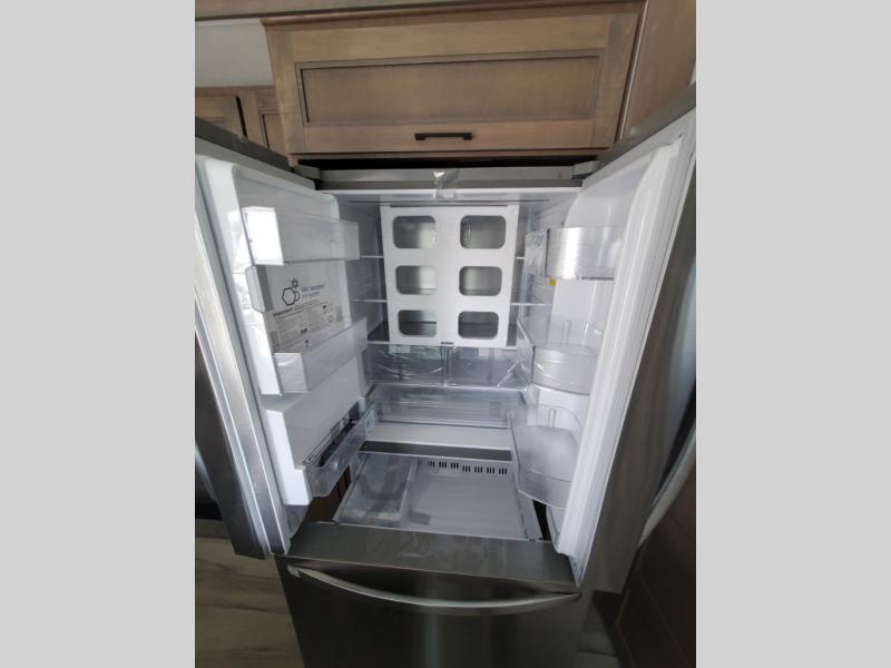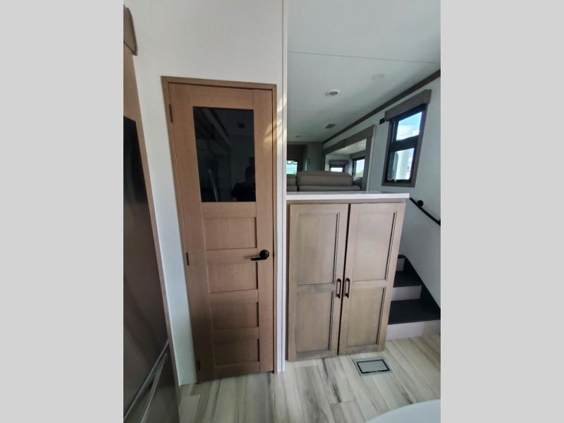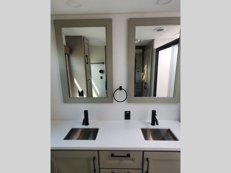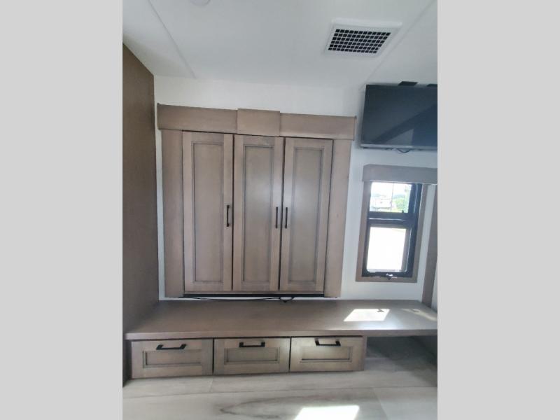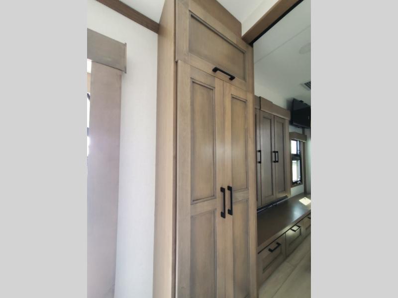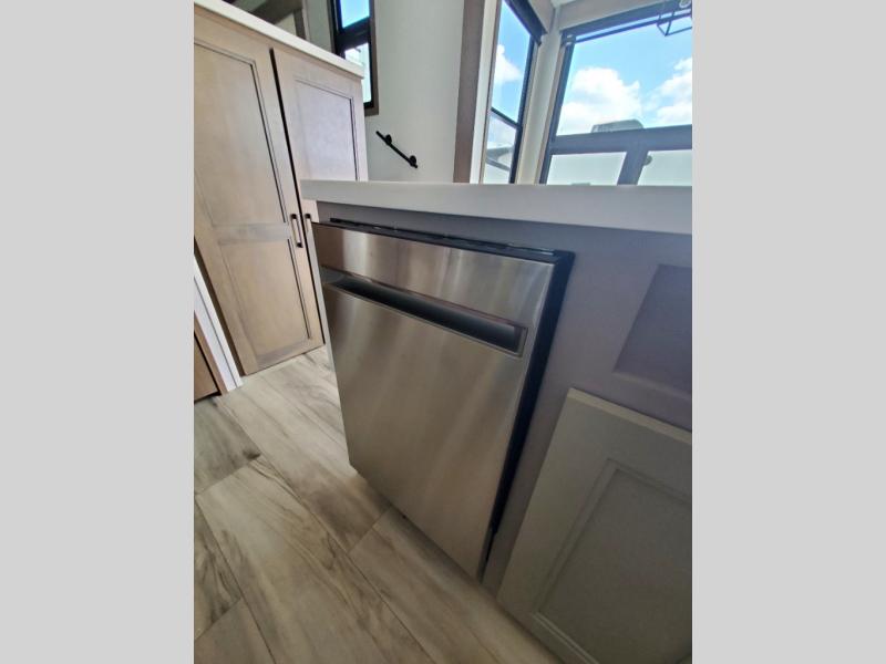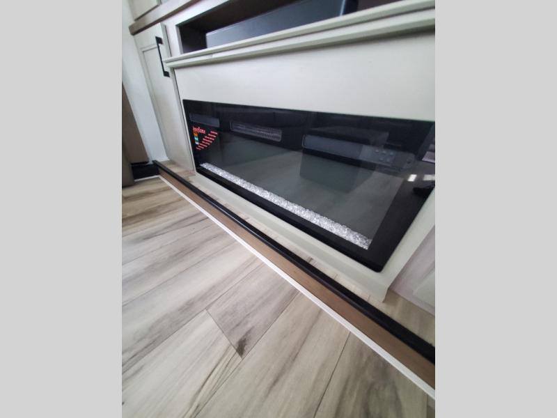 Fall in love with this unit's kitchen with residential appliances, a farmhouse stainless steel sink, a dishwasher, pantry, 26 cu refrigerator, and a sliding table/desk with chairs. Spend cozy entertainment nights watching the 65" LED TV with a fireplace below, a theater seating with USB ports, and two hide-a-bed sofa slides that widen this area so everyone can stretch out and relax. At night, retire to your private bedroom with a king electric tilt bed with drawers underneath, a 32" Smart LED TV, and, a closet, perfect for easy organization. Also, the full rear bathroom provides a residential shower with a seat plus linen storage, washer and dryer prep, and two sinks for more convenience. This model is also fitted with an exterior pass-through storage ideal for storing your things.