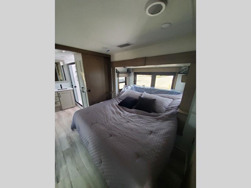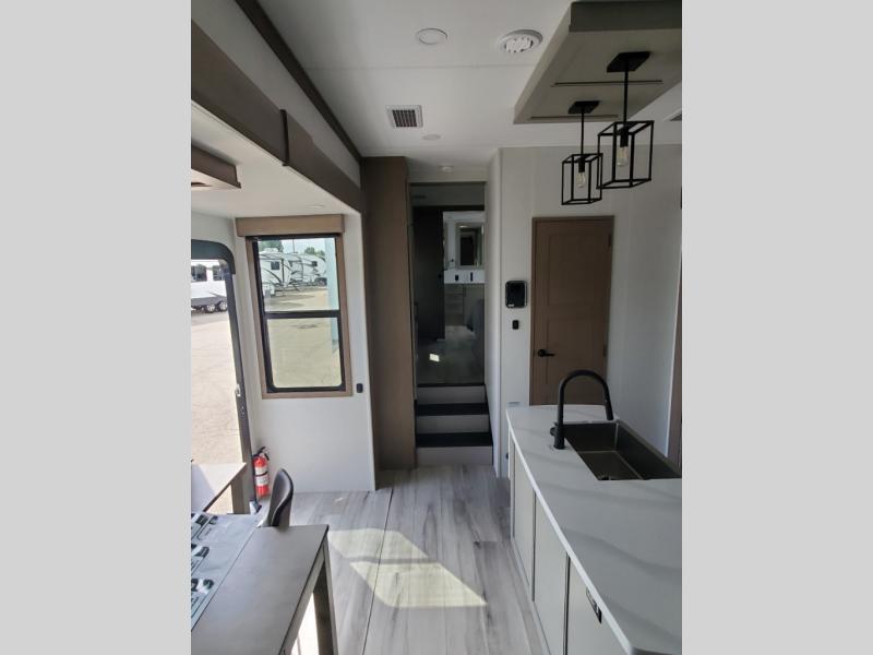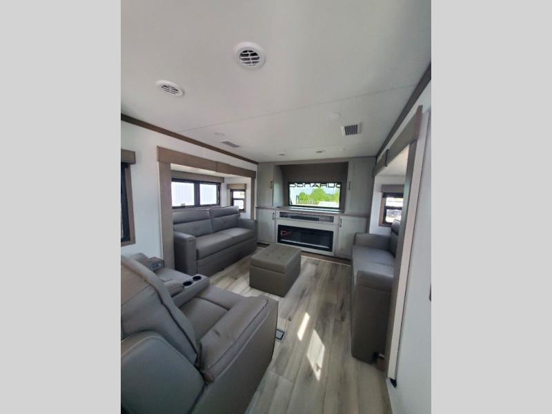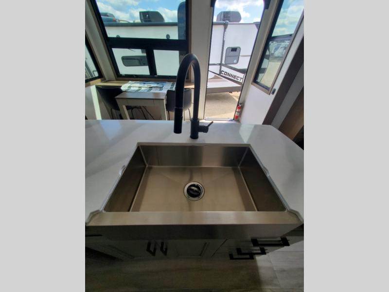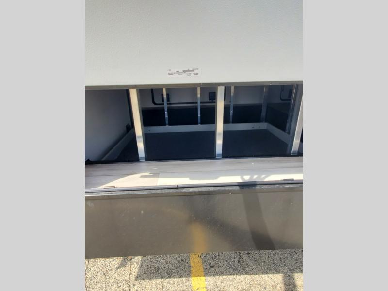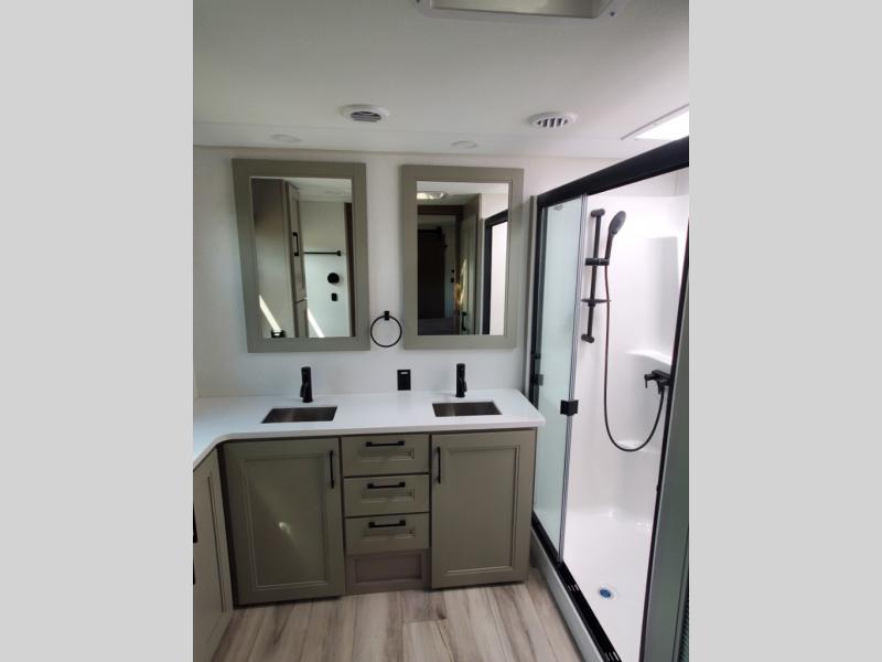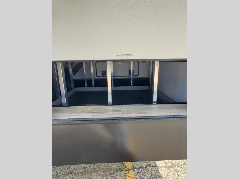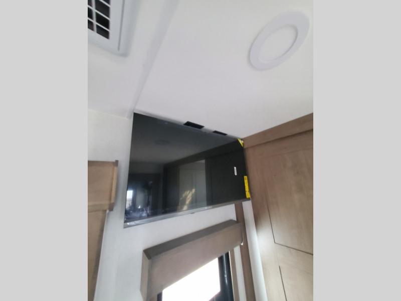 Fall in love with this unit's kitchen with residential appliances, a farmhouse stainless steel sink, a dishwasher, pantry, 26 cu refrigerator, and a sliding table/desk with chairs. Spend cozy entertainment nights watching the 65" LED TV with a fireplace below, a theater seating with USB ports, and two hide-a-bed sofa slides that widen this area so everyone can stretch out and relax. At night, retire to your private bedroom with a king electric tilt bed with drawers underneath, a 32" Smart LED TV, and, a closet, perfect for easy organization. Also, the full rear bathroom provides a residential shower with a seat plus linen storage, washer and dryer prep, and two sinks for more convenience. This model is also fitted with an exterior pass-through storage ideal for storing your things.