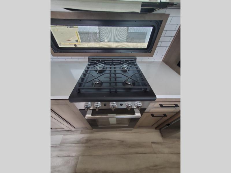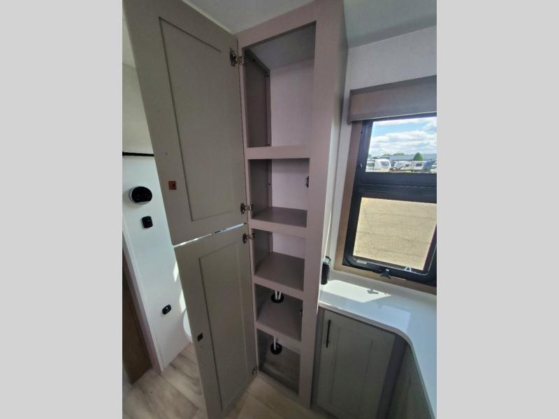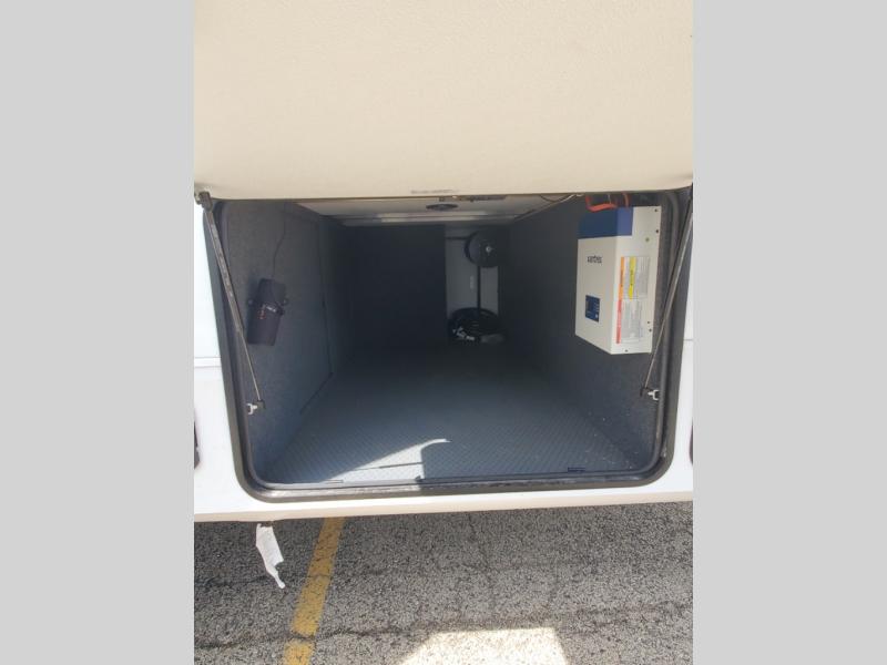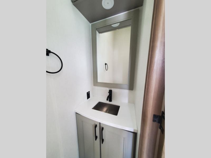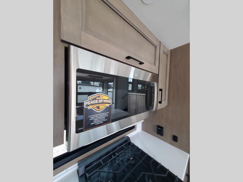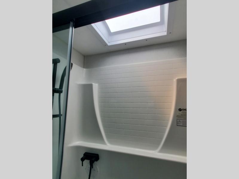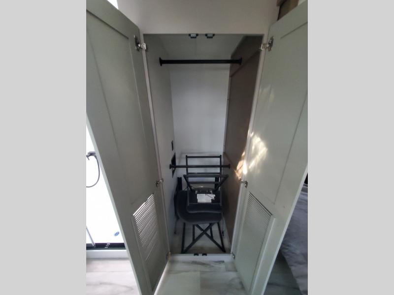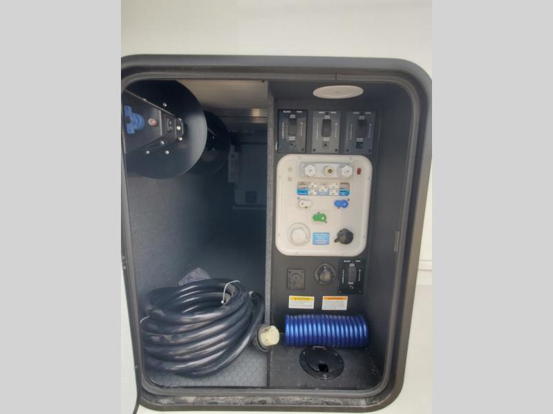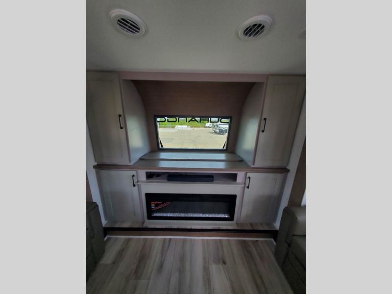 Fall in love with this unit's kitchen with residential appliances, a farmhouse stainless steel sink, a dishwasher, pantry, 26 cu refrigerator, and a sliding table/desk with chairs. Spend cozy entertainment nights watching the 65" LED TV with a fireplace below, a theater seating with USB ports, and two hide-a-bed sofa slides that widen this area so everyone can stretch out and relax. At night, retire to your private bedroom with a king electric tilt bed with drawers underneath, a 32" Smart LED TV, and, a closet, perfect for easy organization. Also, the full rear bathroom provides a residential shower with a seat plus linen storage, washer and dryer prep, and two sinks for more convenience. This model is also fitted with an exterior pass-through storage ideal for storing your things.