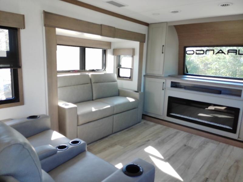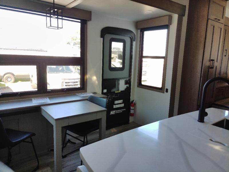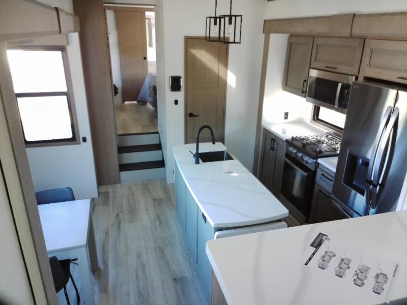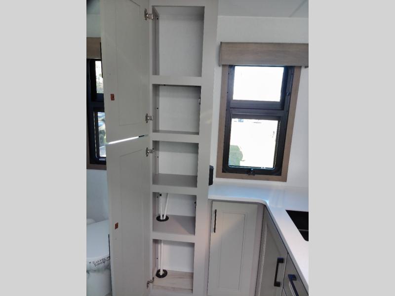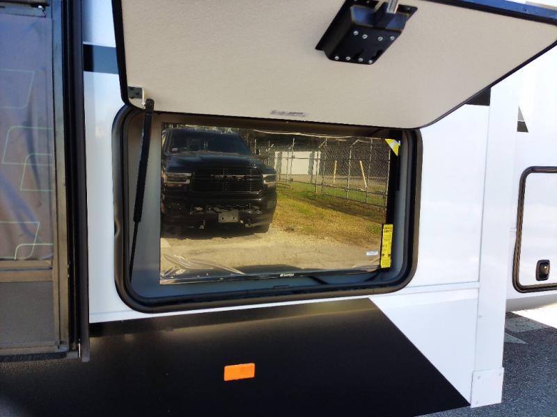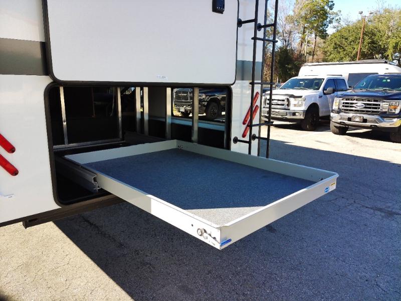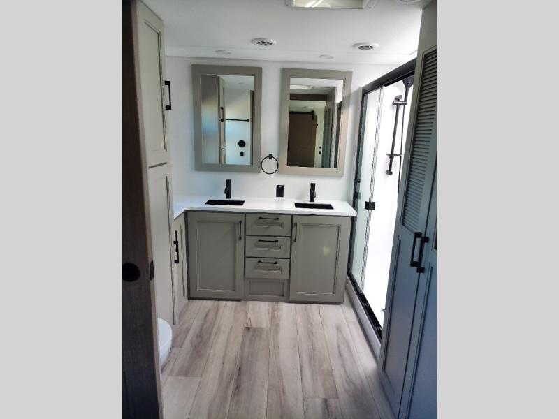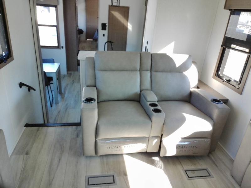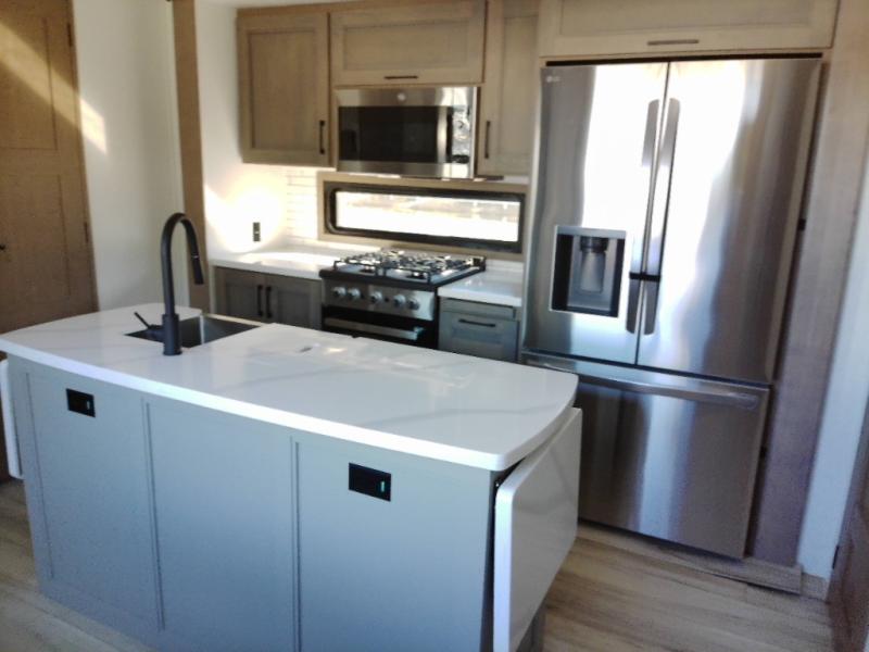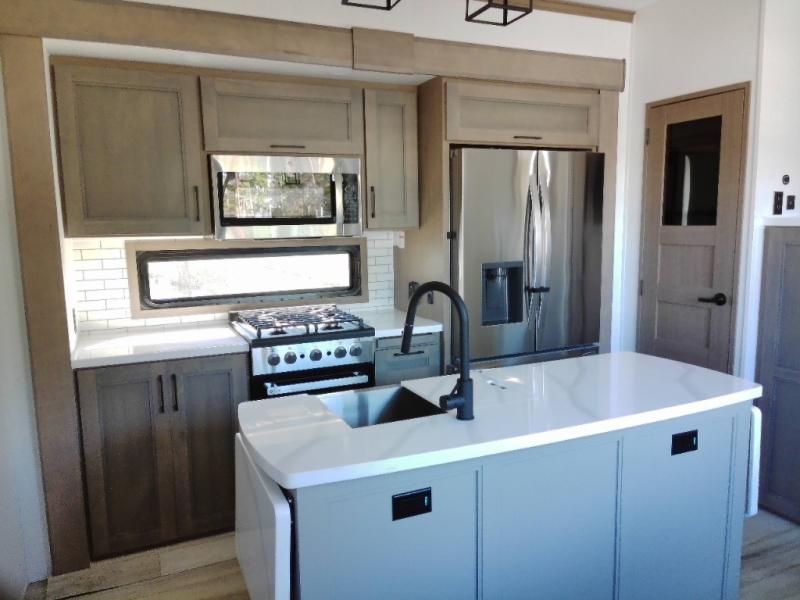 Fall in love with this unit's kitchen with residential appliances, a farmhouse stainless steel sink, a dishwasher, pantry, 26 cu ft refrigerator, and a sliding table/desk with chairs. Spend cozy entertainment nights watching the LED TV with a fireplace below, a theater seating with USB ports, and two hide-a-bed sofa slides that widen this area so everyone can stretch out and relax. At night, retire to your private bedroom with a king electric tilt bed with drawers' underneath, a 32" Smart LED TV, and, a closet, perfect for easy organization. Also, the full rear bathroom provides a residential shower with a seat plus linen storage, washer and dryer prep, and two sinks for more convenience. This model is also fitted with an exterior pass-through storage ideal for storing your things.