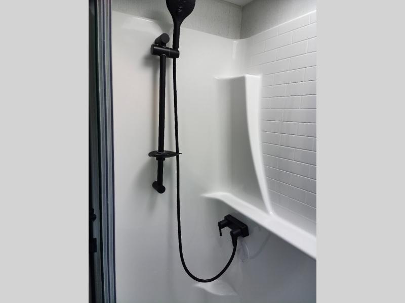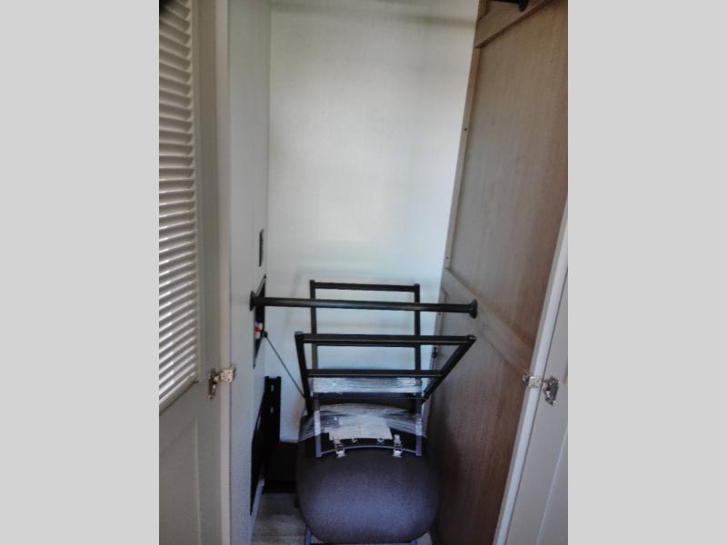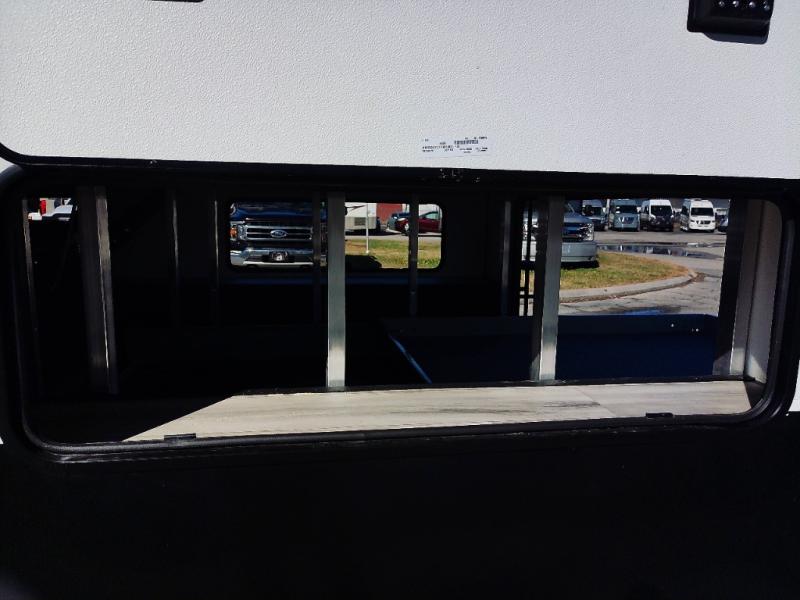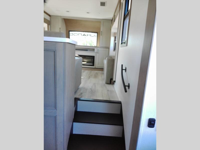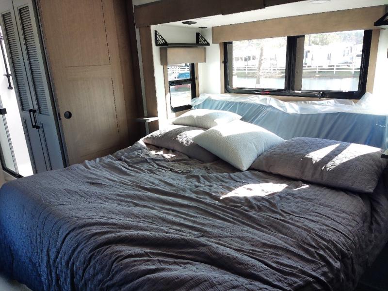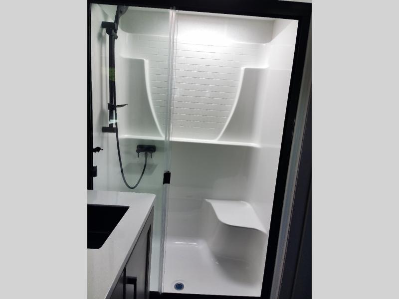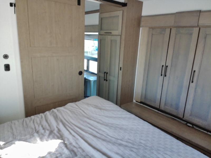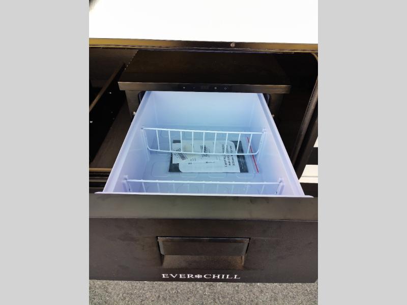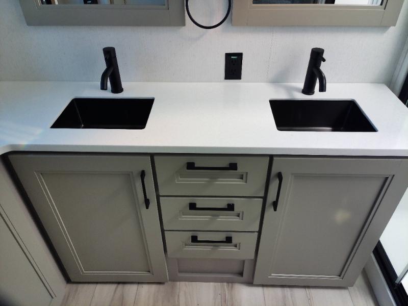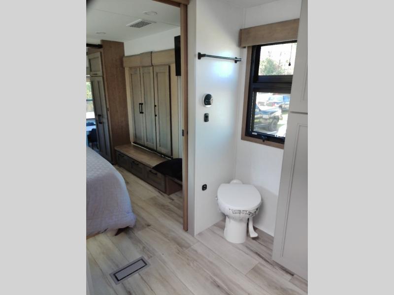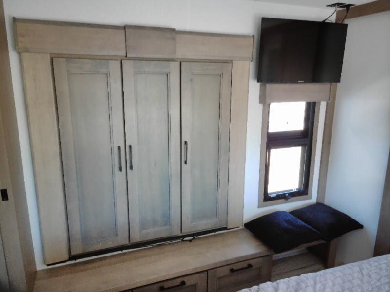 Fall in love with this unit's kitchen with residential appliances, a farmhouse stainless steel sink, a dishwasher, pantry, 26 cu ft refrigerator, and a sliding table/desk with chairs. Spend cozy entertainment nights watching the LED TV with a fireplace below, a theater seating with USB ports, and two hide-a-bed sofa slides that widen this area so everyone can stretch out and relax. At night, retire to your private bedroom with a king electric tilt bed with drawers' underneath, a 32" Smart LED TV, and, a closet, perfect for easy organization. Also, the full rear bathroom provides a residential shower with a seat plus linen storage, washer and dryer prep, and two sinks for more convenience. This model is also fitted with an exterior pass-through storage ideal for storing your things.