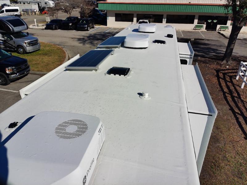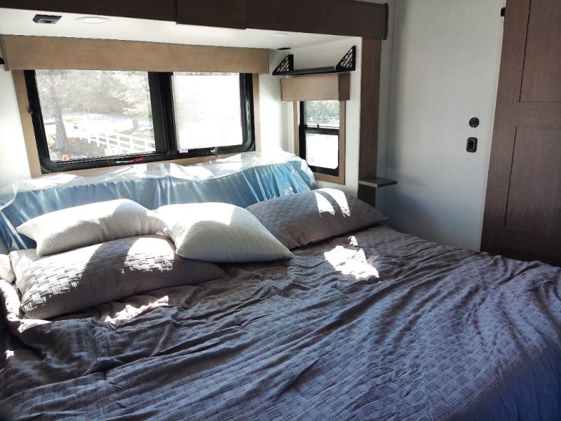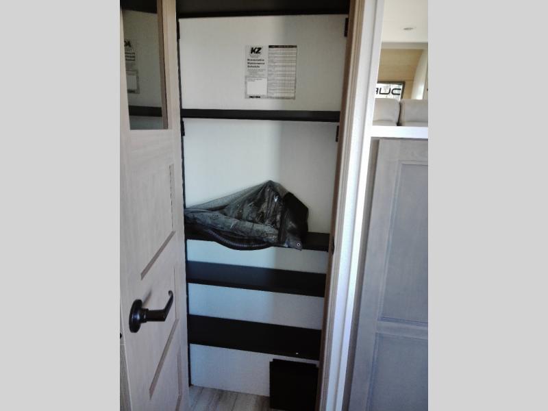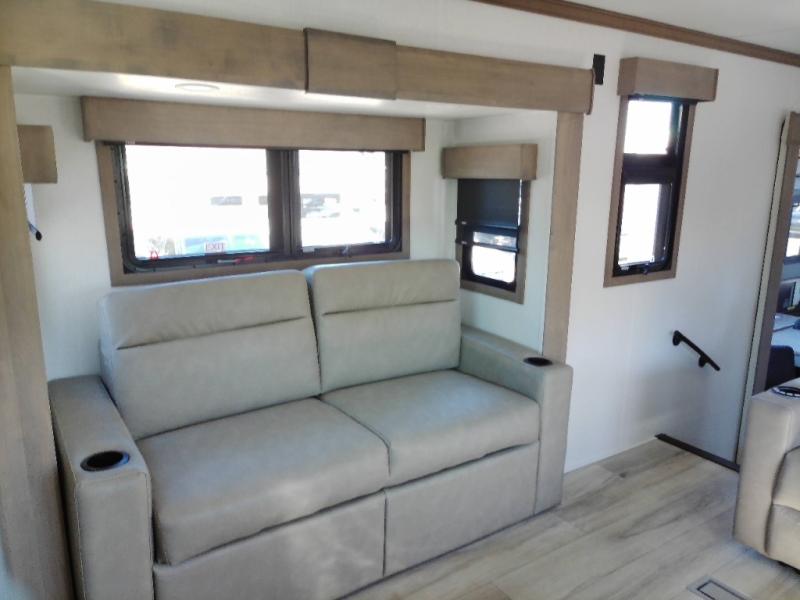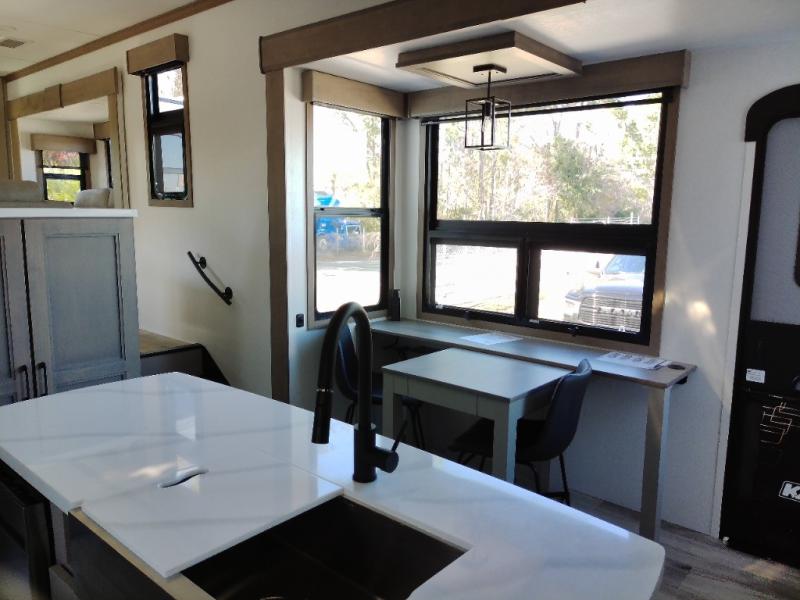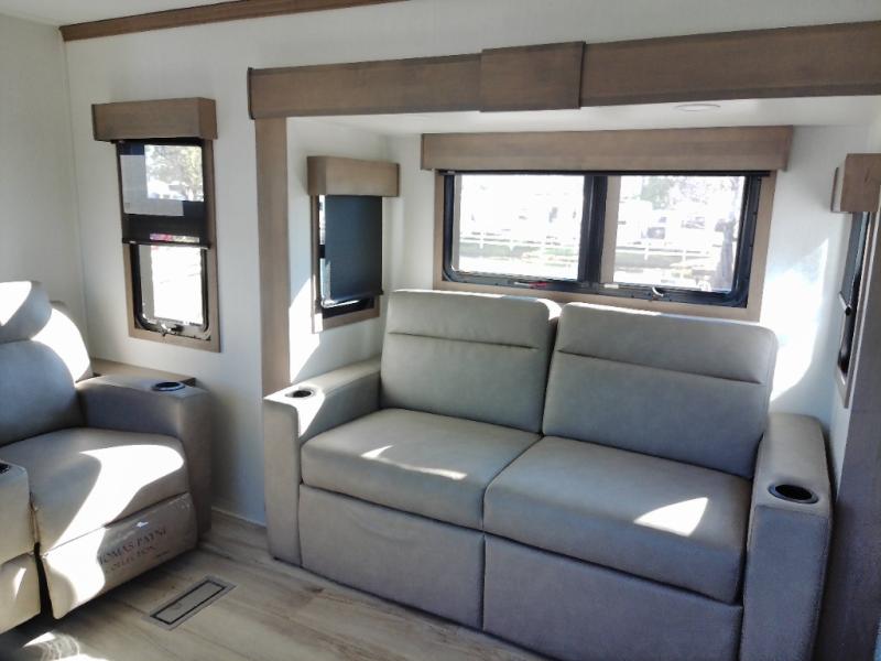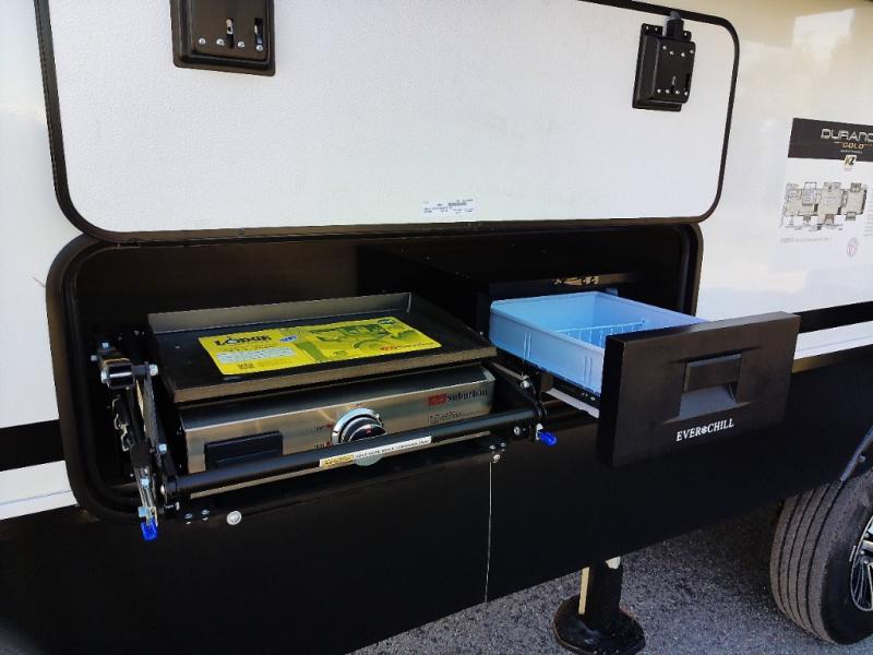 With any KZ Durango Gold full-time luxury fifth wheel, you will enjoy the new Blancher Maple and Morel Fog cabinetry, stainless steel appliances such as a 30" convection microwave and 24" oven with a four-burner range, plus a stainless dishwasher. Other top features include an electric tilt bed with Serta Comfort foam king mattress, three 15K A/C units, plus theater seating with powered recline, heat and massage features. You will also appreciate a handy central vacuum system with attachments that stores out of sight. Each Durango Gold is constructed with six-sided aluminum framing, and has a heated, insulated and an enclosed underbelly. It is also constructed with Tufflex roofing material, which is flexible, puncture resistant, and reflective. The now mandatory "Off The Grid" solar package includes two 200W solar panels, a 30A MPPT solar charge controller, and a 2,000W True Sine Wave inverter for off-grid capabilities.