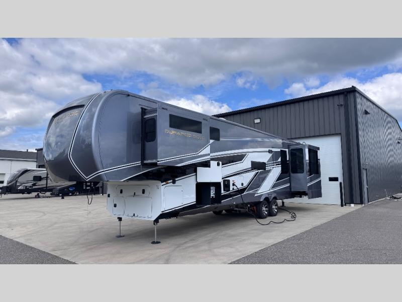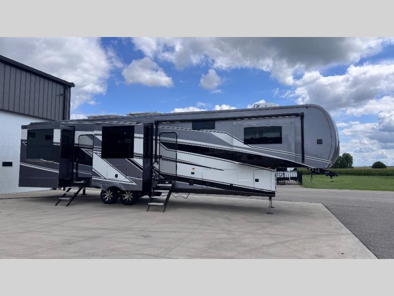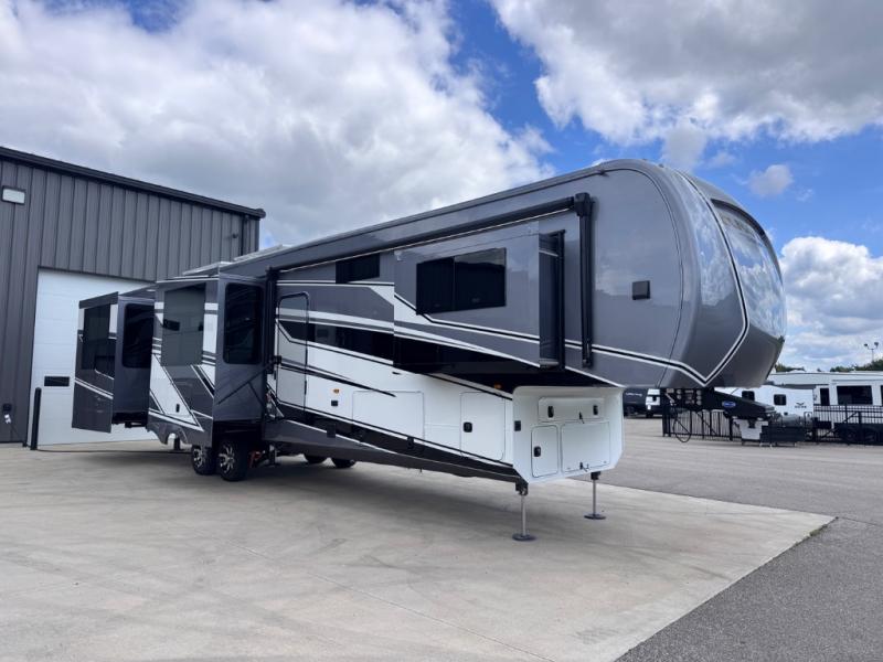Experience the pinnacle of luxury fifth-wheel living! Retreat to the serene bedroom, featuring an electric tilt king bed with drawers under the bed, a spacious wardrobe, and washer/dryer prep. Enjoy entertainment on the 39” Smart LED TV and ample storage in the dresser. The gourmet kitchen is equipped with a pantry, 26 cu. refrigerator, convection microwave, and sliding table/desk for effortless dining and work-from-home convenience. The living room is a haven of relaxation, boasting a stunning 65” Smart LED TV, warm fireplace, theater seating, and double hide-a-bed sofas ideal for hosting guests with ease. Unwind in style in the full bathroom, featuring a dual sink vanity and ample storage. Also, enjoy the convenience of two entry/two exit doors. This fifth wheel is a masterpiece of comfort, style, and functionality, perfect for full-time living.
