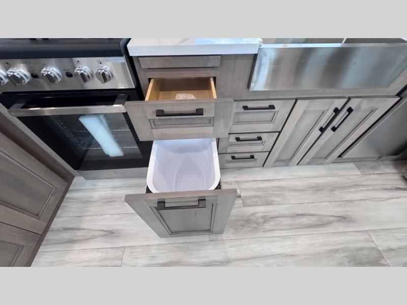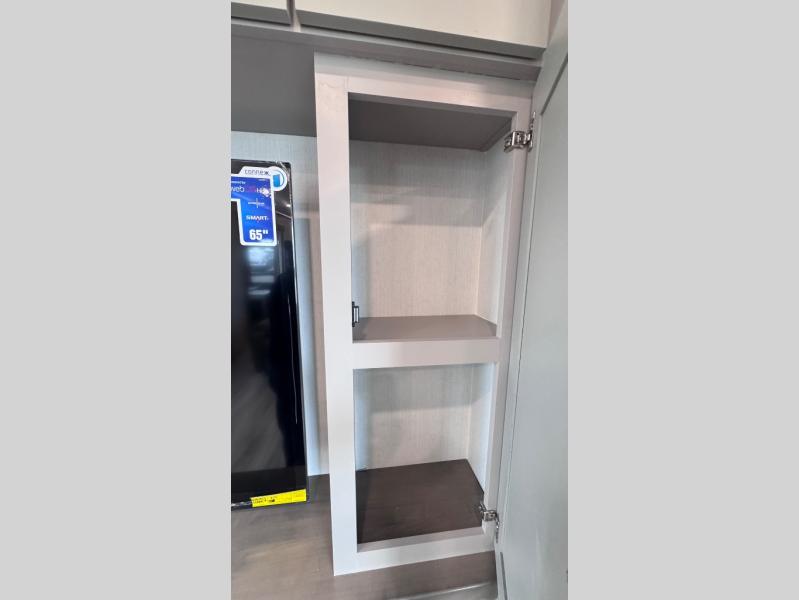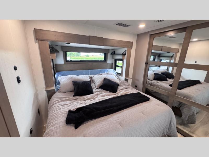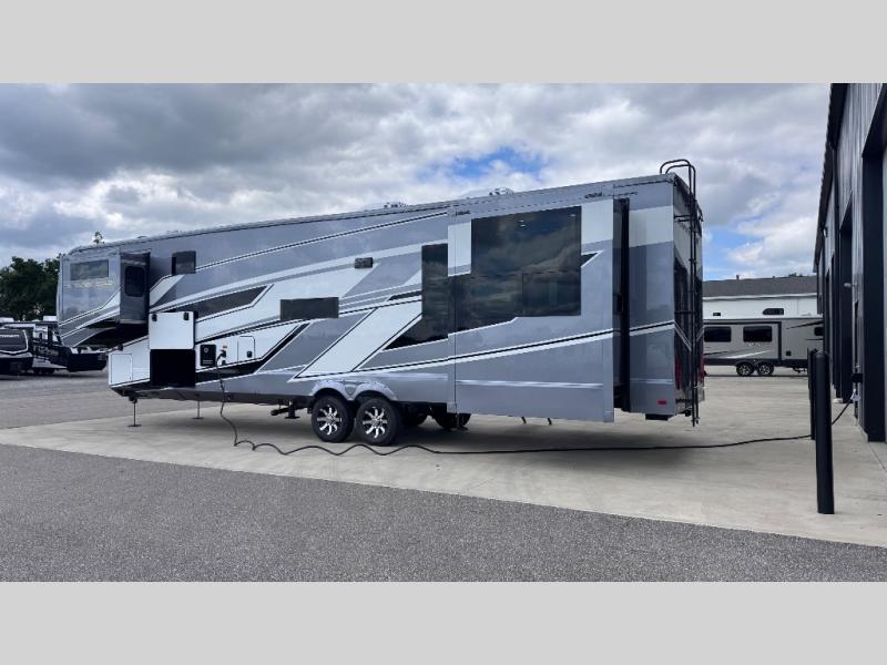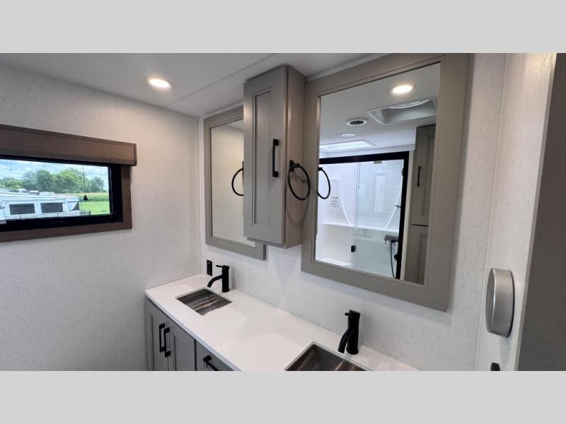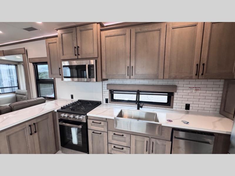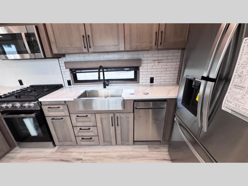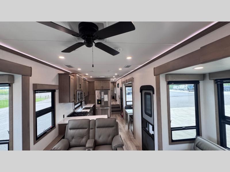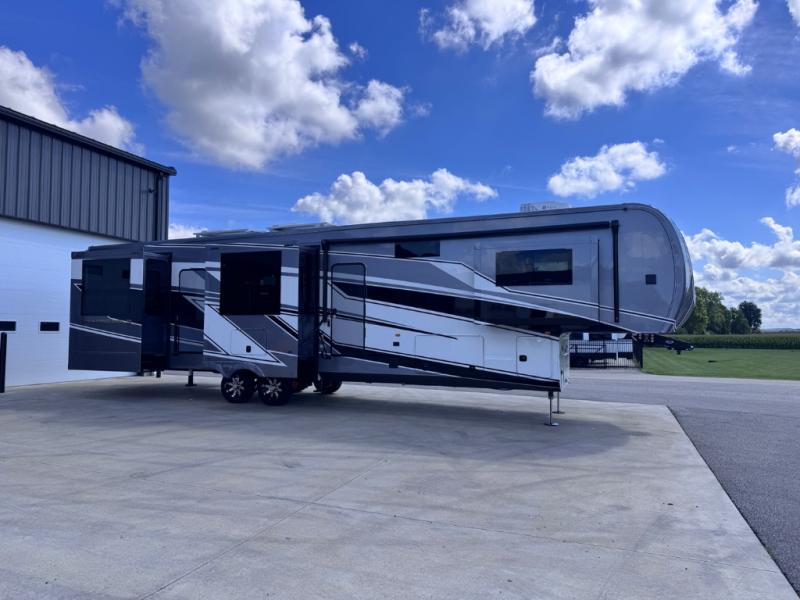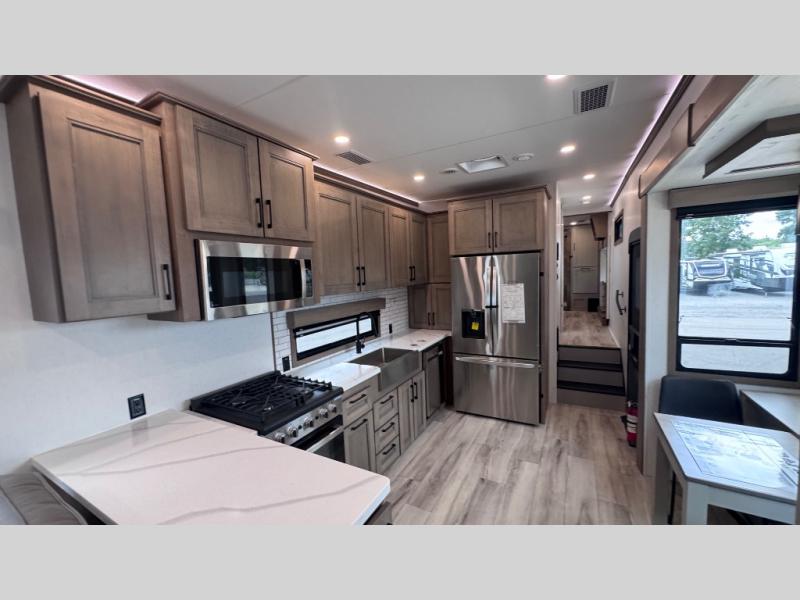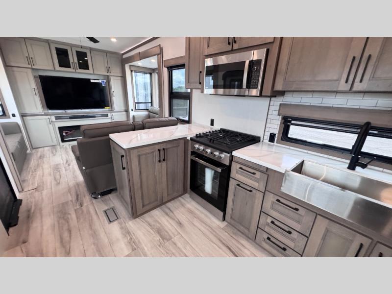 Experience the pinnacle of luxury fifth-wheel living! Retreat to the serene bedroom, featuring an electric tilt king bed with drawers under the bed, a spacious wardrobe, and washer/dryer prep. Enjoy entertainment on the 39” Smart LED TV and ample storage in the dresser. The gourmet kitchen is equipped with a pantry, 26 cu. refrigerator, convection microwave, and sliding table/desk for effortless dining and work-from-home convenience. The living room is a haven of relaxation, boasting a stunning 65” Smart LED TV, warm fireplace, theater seating, and double hide-a-bed sofas ideal for hosting guests with ease. Unwind in style in the full bathroom, featuring a dual sink vanity and ample storage. Also, enjoy the convenience of two entry/two exit doors. This fifth wheel is a masterpiece of comfort, style, and functionality, perfect for full-time living.