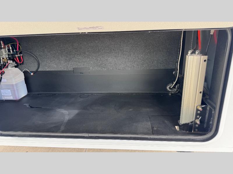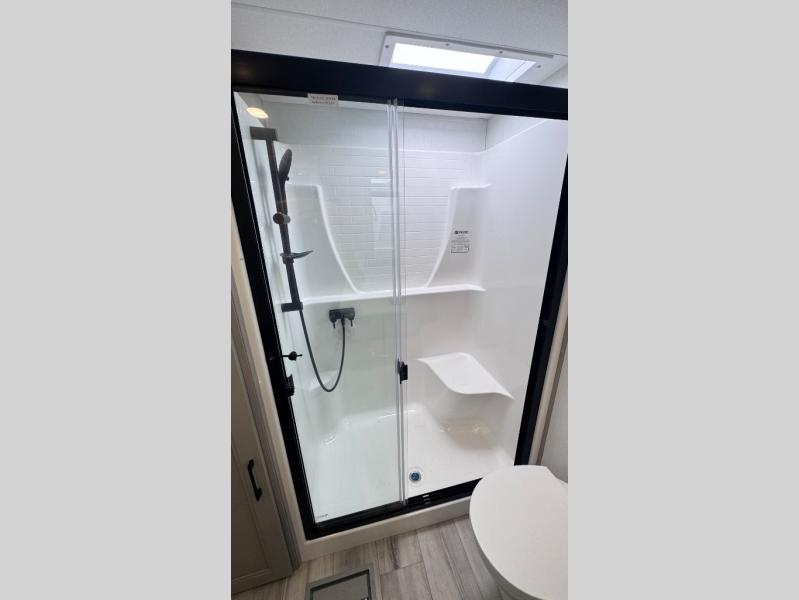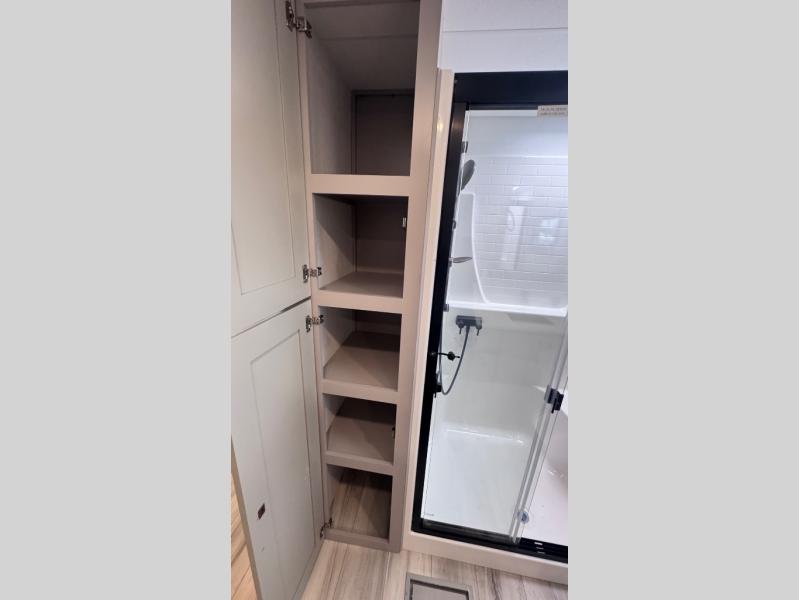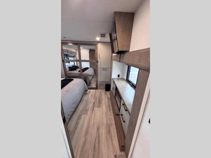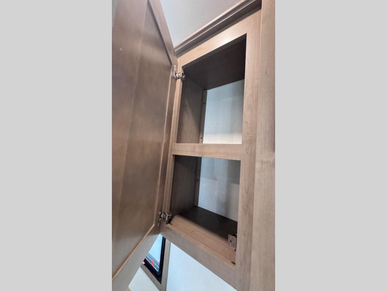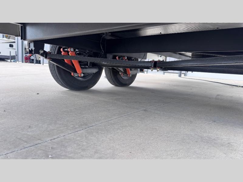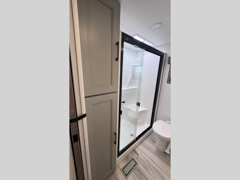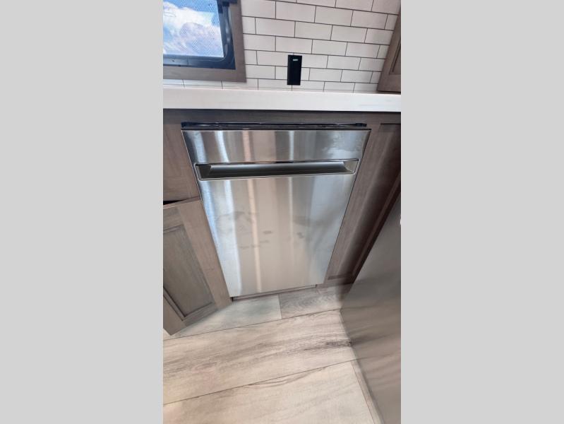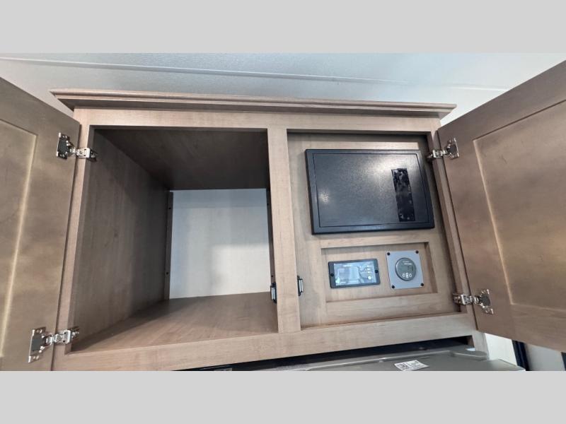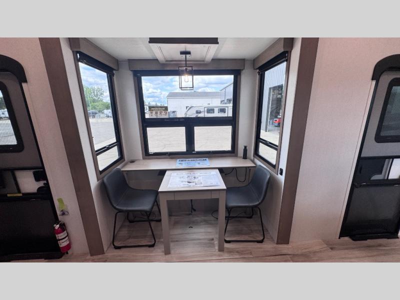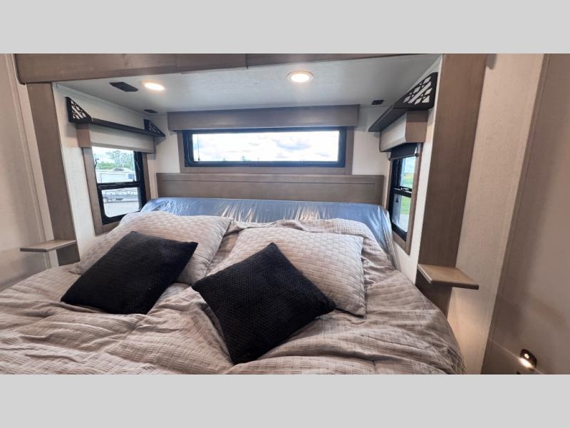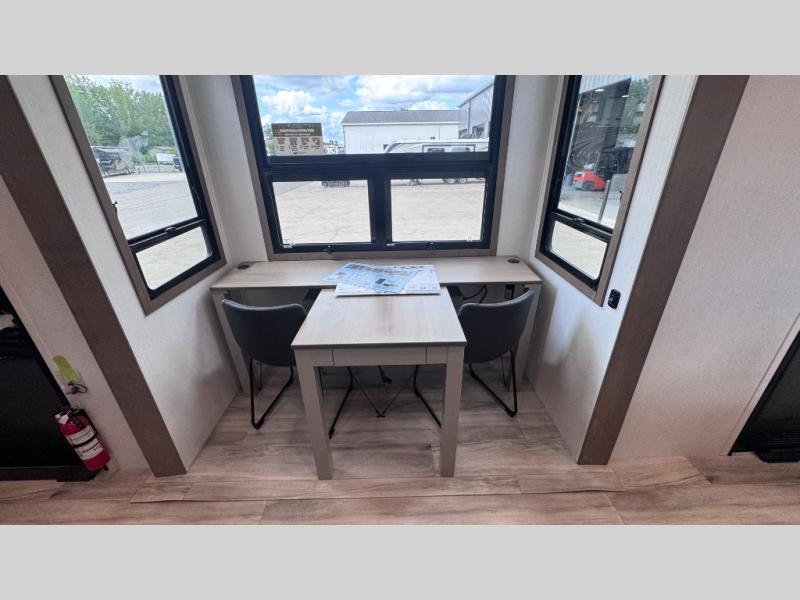 Experience the pinnacle of luxury fifth-wheel living! Retreat to the serene bedroom, featuring an electric tilt king bed with drawers under the bed, a spacious wardrobe, and washer/dryer prep. Enjoy entertainment on the 39” Smart LED TV and ample storage in the dresser. The gourmet kitchen is equipped with a pantry, 26 cu. refrigerator, convection microwave, and sliding table/desk for effortless dining and work-from-home convenience. The living room is a haven of relaxation, boasting a stunning 65” Smart LED TV, warm fireplace, theater seating, and double hide-a-bed sofas ideal for hosting guests with ease. Unwind in style in the full bathroom, featuring a dual sink vanity and ample storage. Also, enjoy the convenience of two entry/two exit doors. This fifth wheel is a masterpiece of comfort, style, and functionality, perfect for full-time living.
