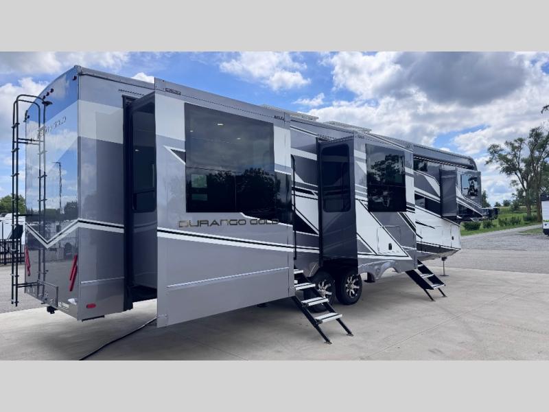With any KZ Durango Gold full-time luxury fifth wheel, you will enjoy the new Blancher Maple and Morel Fog cabinetry, stainless steel appliances such as a 30" convection microwave and 24" oven with a four burner range, plus a stainless dishwasher. Other top features include an electric tilt bed with Serta Comfort foam king mattress, three 15K A/C units, plus theater seating with powered recline, heat and massage features. You will also appreciate a handy central vacuum system with attachments that stores out of sight. Each Durango Gold is constructed with six-sided aluminum framing, and has a heated, insulated and an enclosed underbelly. It is also constructed with Tufflex roofing material which is flexible, puncture resistant, and reflective. The now standard "Off The Grid" solar package includes two 200W solar panels, a 30A MPPT solar charge controller, and a 2,000W True Sine Wave inverter for off-grid capabilities. If you're wanting to go completely off-grid, you might want to choose the optional Boondocker Solar System with even more features that won't require you to be close to electric hookups!