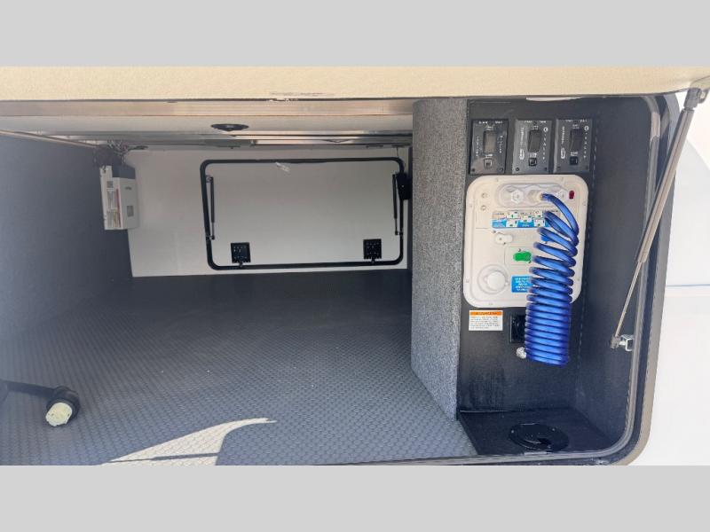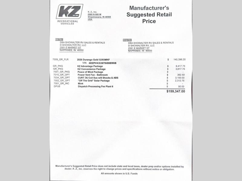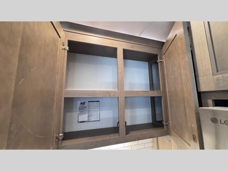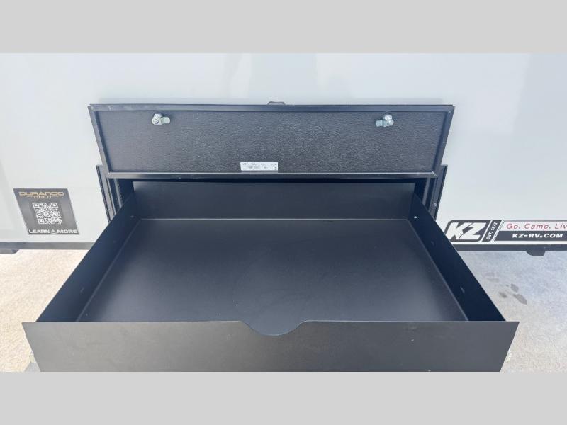 With any KZ Durango Gold full-time luxury fifth wheel, you will enjoy the new Blancher Maple and Morel Fog cabinetry, stainless steel appliances such as a 30" convection microwave and 24" oven with a four burner range, plus a stainless dishwasher. Other top features include an electric tilt bed with Serta Comfort foam king mattress, three 15K A/C units, plus theater seating with powered recline, heat and massage features. You will also appreciate a handy central vacuum system with attachments that stores out of sight. Each Durango Gold is constructed with six-sided aluminum framing, and has a heated, insulated and an enclosed underbelly. It is also constructed with Tufflex roofing material which is flexible, puncture resistant, and reflective. The now standard "Off The Grid" solar package includes two 200W solar panels, a 30A MPPT solar charge controller, and a 2,000W True Sine Wave inverter for off-grid capabilities. If you're wanting to go completely off-grid, you might want to choose the optional Boondocker Solar System with even more features that won't require you to be close to electric hookups!