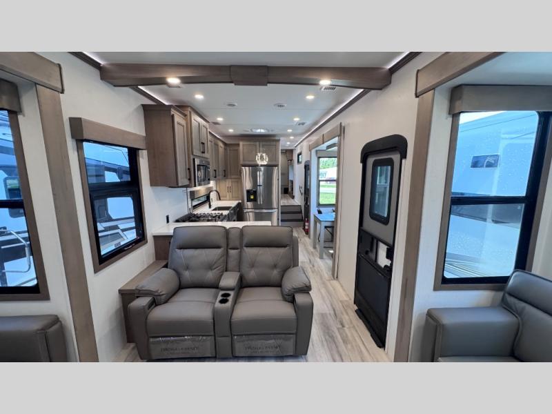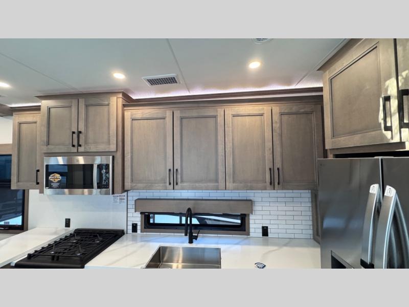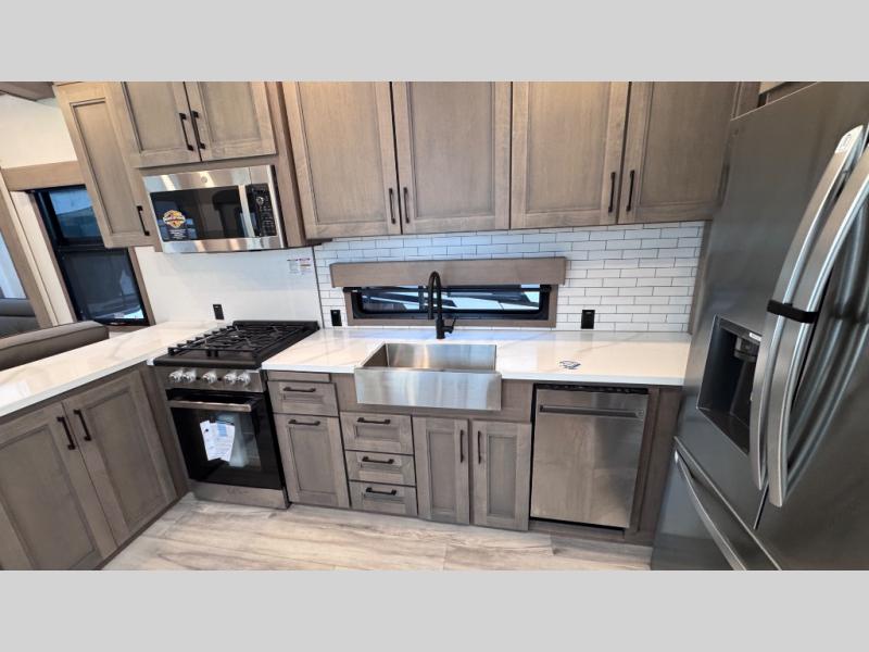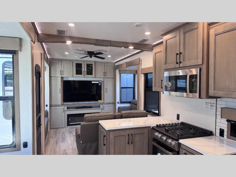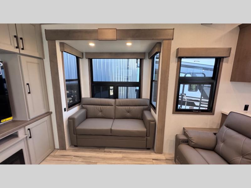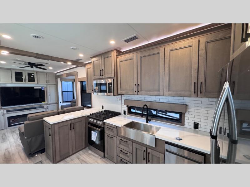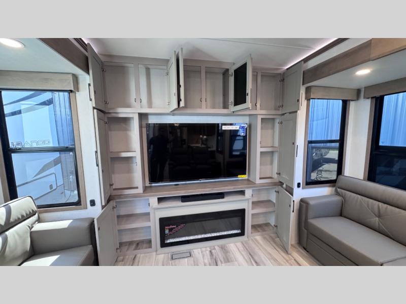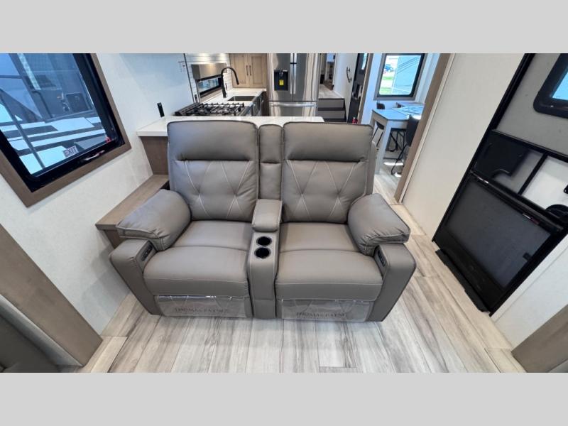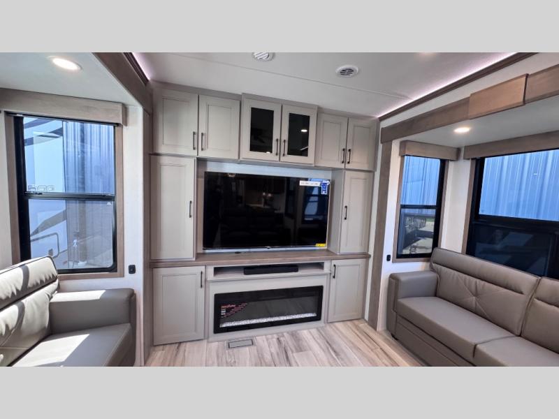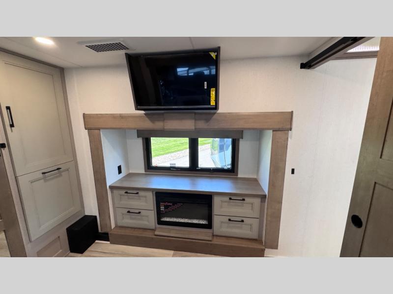 Experience the pinnacle of luxury fifth-wheel living! Retreat to the serene bedroom, featuring an electric tilt king bed with drawers under the bed, a spacious wardrobe, and washer/dryer prep. Enjoy entertainment on the 39” Smart LED TV and ample storage in the dresser. The gourmet kitchen is equipped with a pantry, 26 cu. refrigerator, convection microwave, and sliding table/desk for effortless dining and work-from-home convenience. The living room is a haven of relaxation, boasting a stunning 65” Smart LED TV, warm fireplace, theater seating, and double hide-a-bed sofas ideal for hosting guests with ease. Unwind in style in the full bathroom, featuring a dual sink vanity and ample storage. Also, enjoy the convenience of two entry/two exit doors. This fifth wheel is a masterpiece of comfort, style, and functionality, perfect for full-time living.