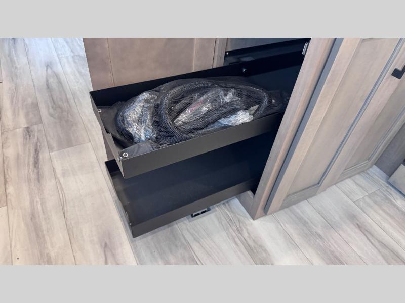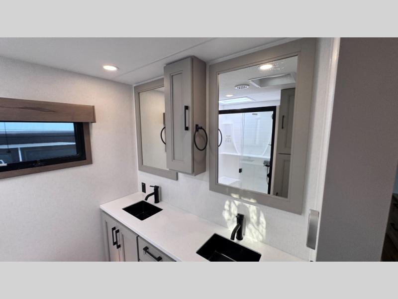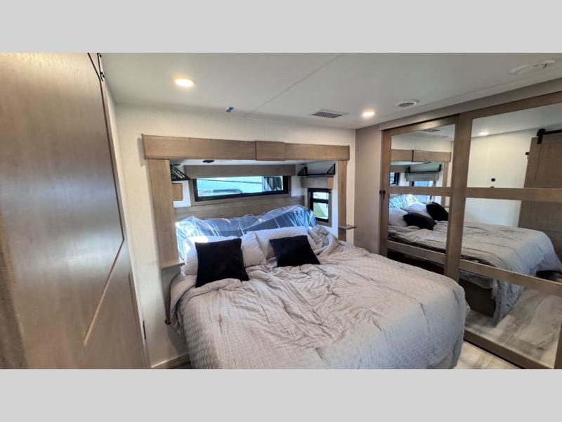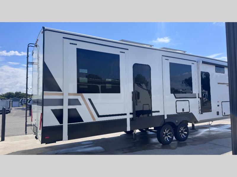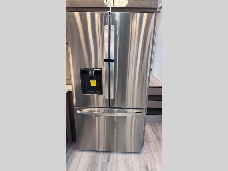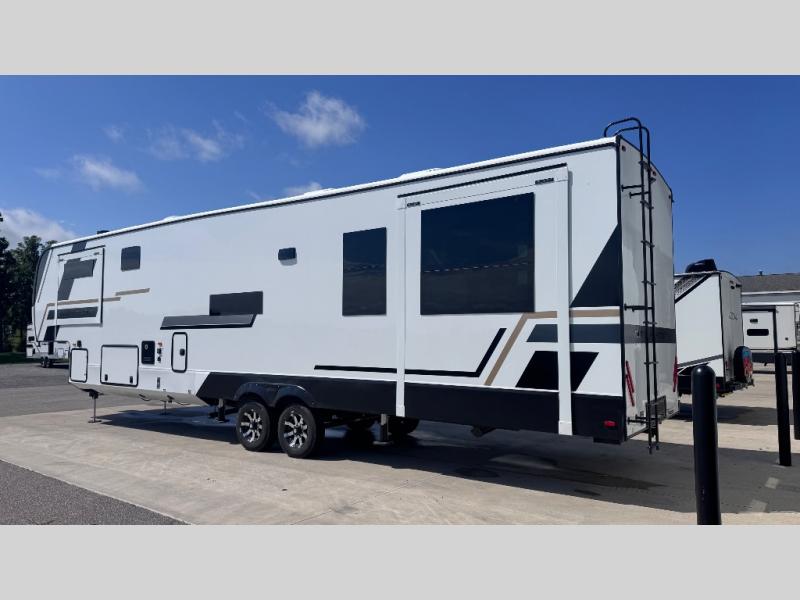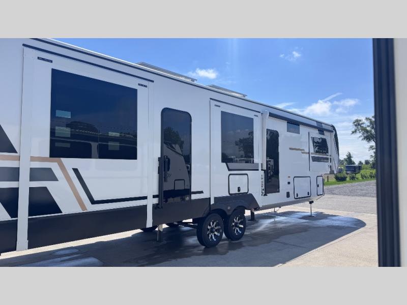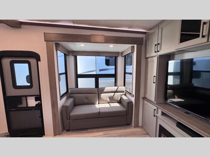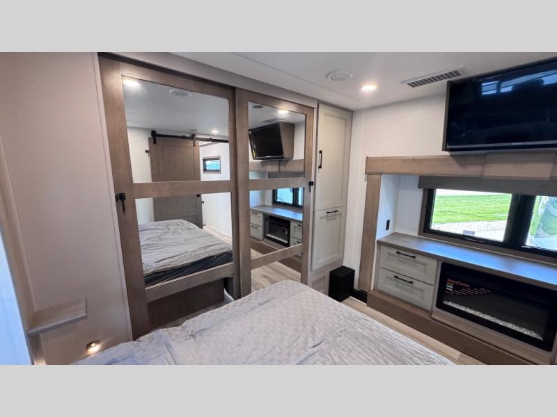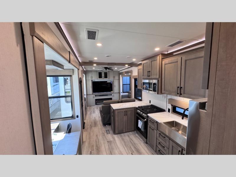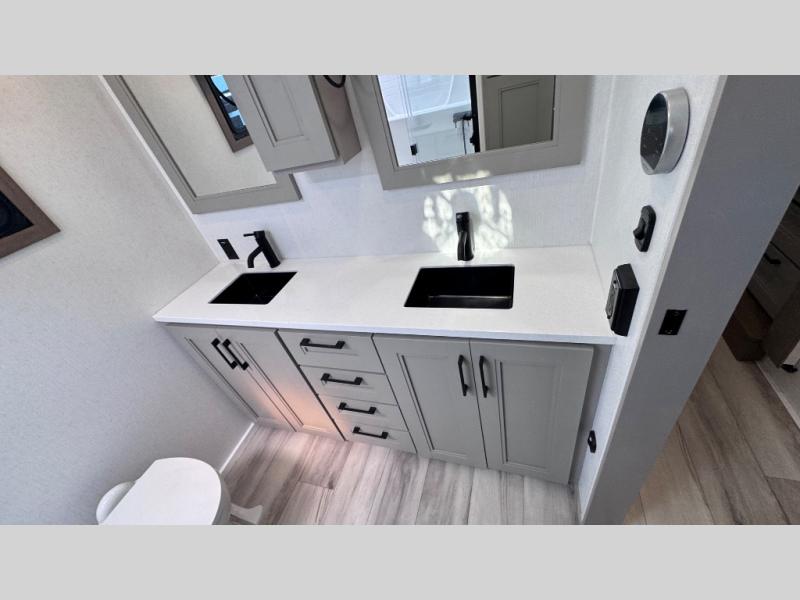 Experience the pinnacle of luxury fifth-wheel living! Retreat to the serene bedroom, featuring an electric tilt king bed with drawers under the bed, a spacious wardrobe, and washer/dryer prep. Enjoy entertainment on the 39” Smart LED TV and ample storage in the dresser. The gourmet kitchen is equipped with a pantry, 26 cu. refrigerator, convection microwave, and sliding table/desk for effortless dining and work-from-home convenience. The living room is a haven of relaxation, boasting a stunning 65” Smart LED TV, warm fireplace, theater seating, and double hide-a-bed sofas ideal for hosting guests with ease. Unwind in style in the full bathroom, featuring a dual sink vanity and ample storage. Also, enjoy the convenience of two entry/two exit doors. This fifth wheel is a masterpiece of comfort, style, and functionality, perfect for full-time living.