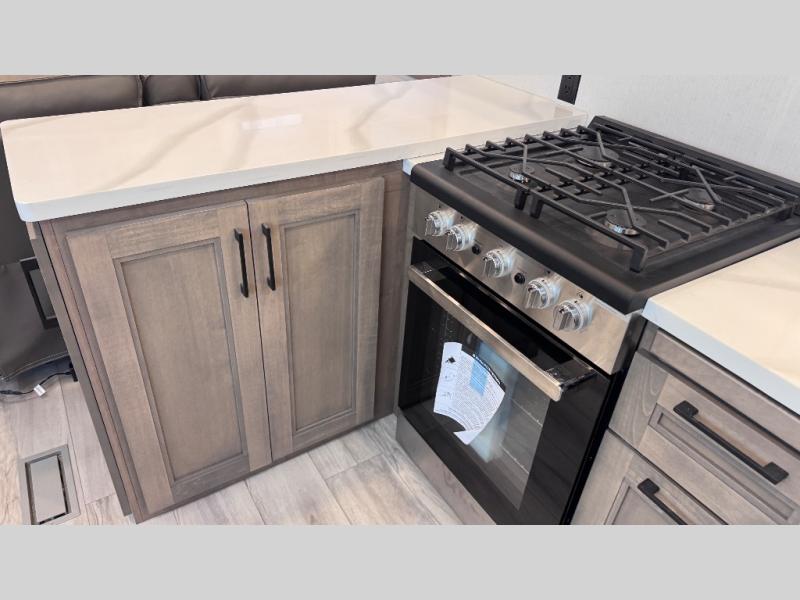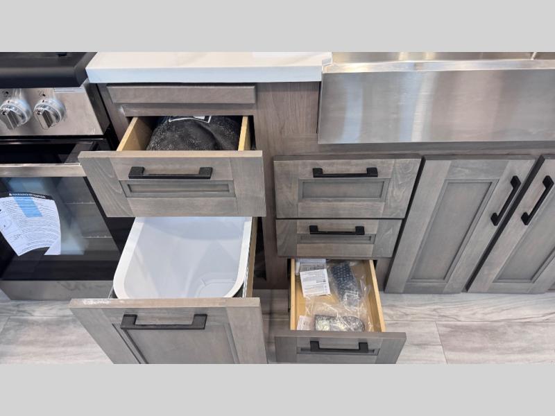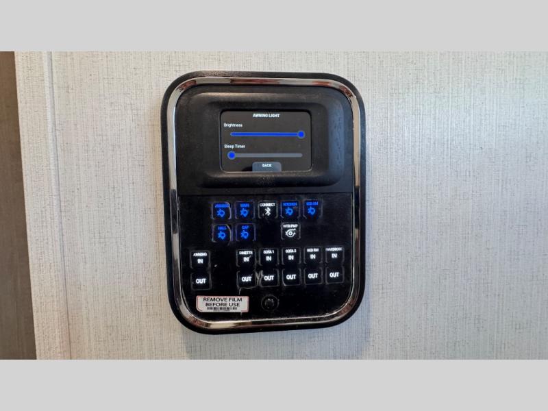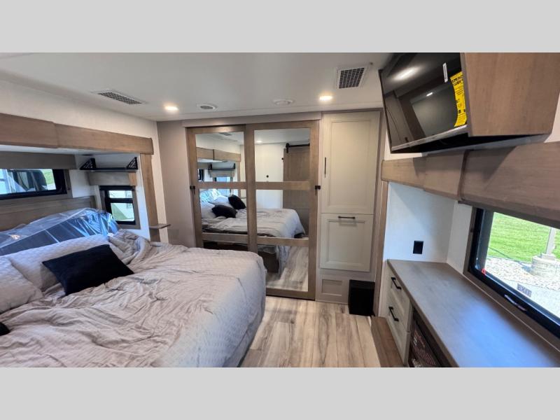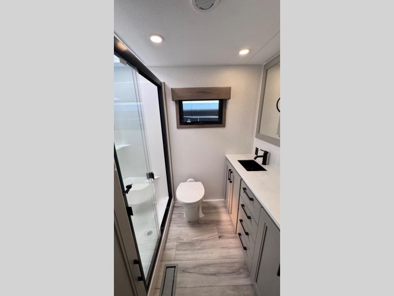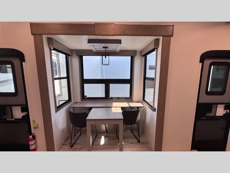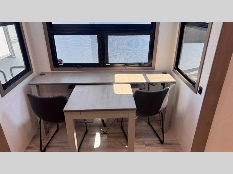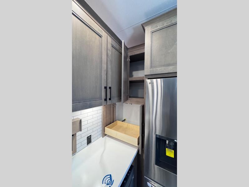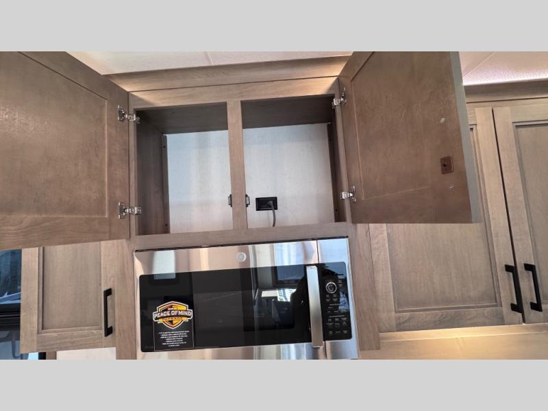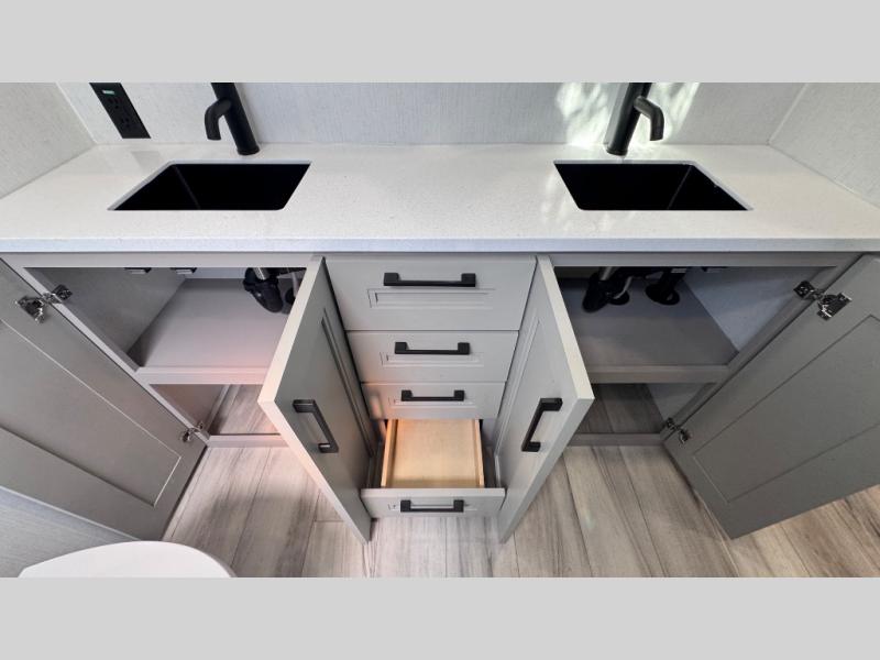 Experience the pinnacle of luxury fifth-wheel living! Retreat to the serene bedroom, featuring an electric tilt king bed with drawers under the bed, a spacious wardrobe, and washer/dryer prep. Enjoy entertainment on the 39” Smart LED TV and ample storage in the dresser. The gourmet kitchen is equipped with a pantry, 26 cu. refrigerator, convection microwave, and sliding table/desk for effortless dining and work-from-home convenience. The living room is a haven of relaxation, boasting a stunning 65” Smart LED TV, warm fireplace, theater seating, and double hide-a-bed sofas ideal for hosting guests with ease. Unwind in style in the full bathroom, featuring a dual sink vanity and ample storage. Also, enjoy the convenience of two entry/two exit doors. This fifth wheel is a masterpiece of comfort, style, and functionality, perfect for full-time living.