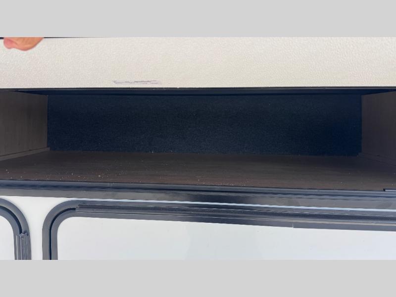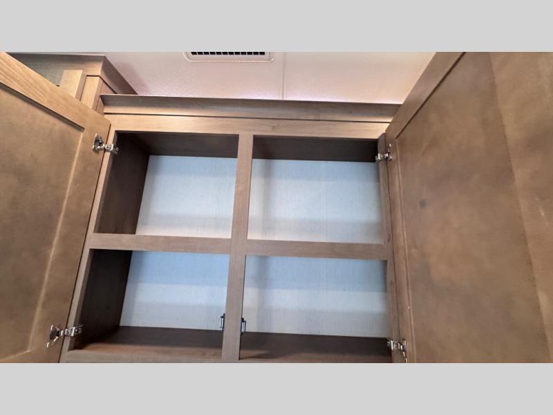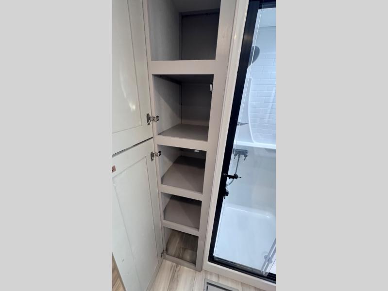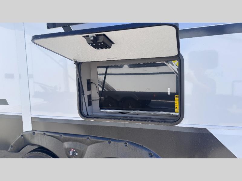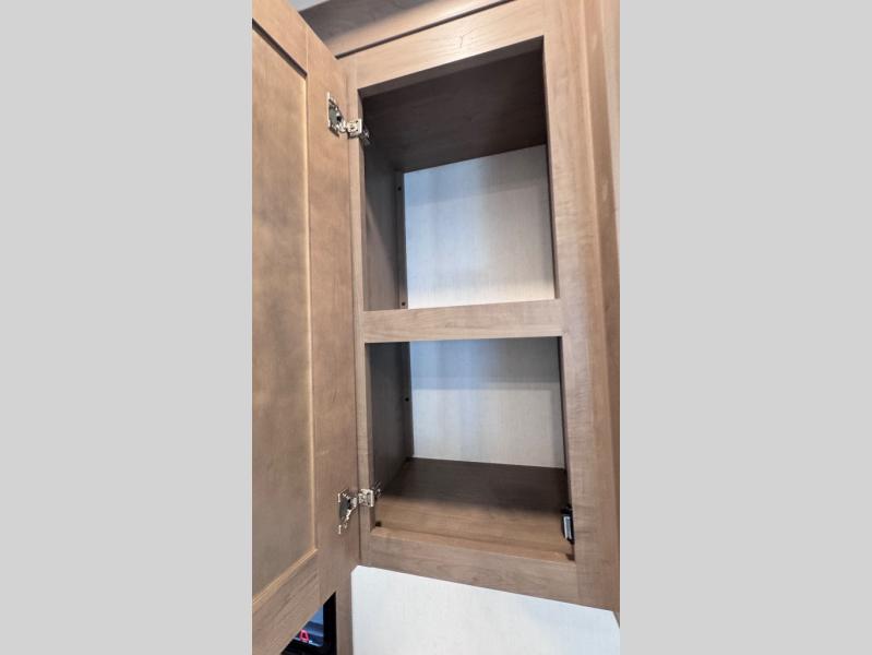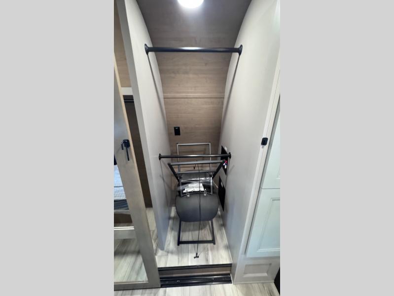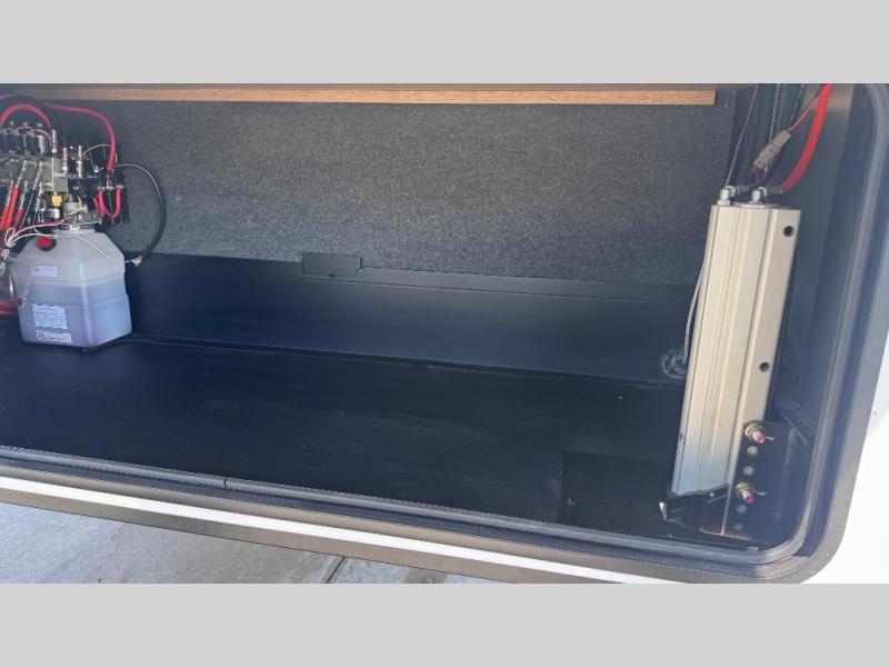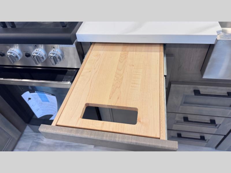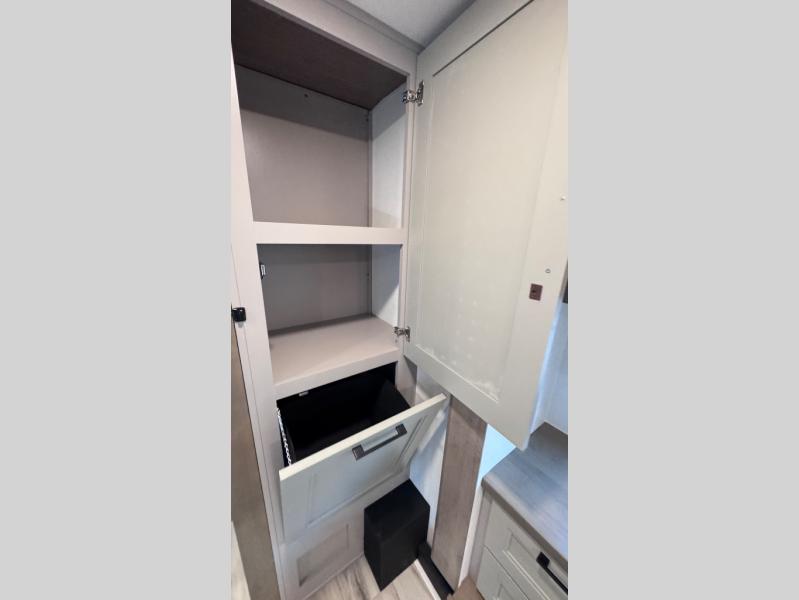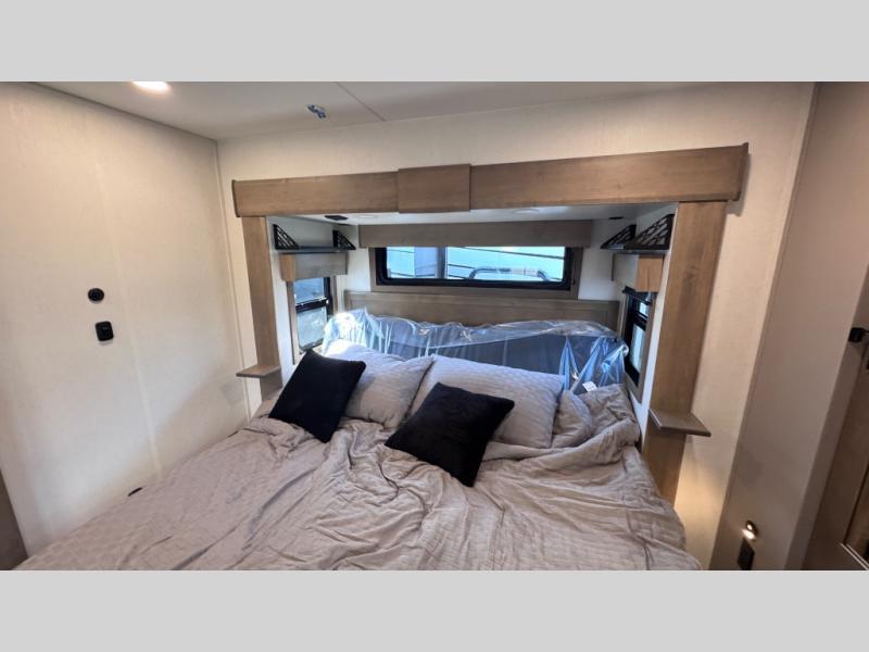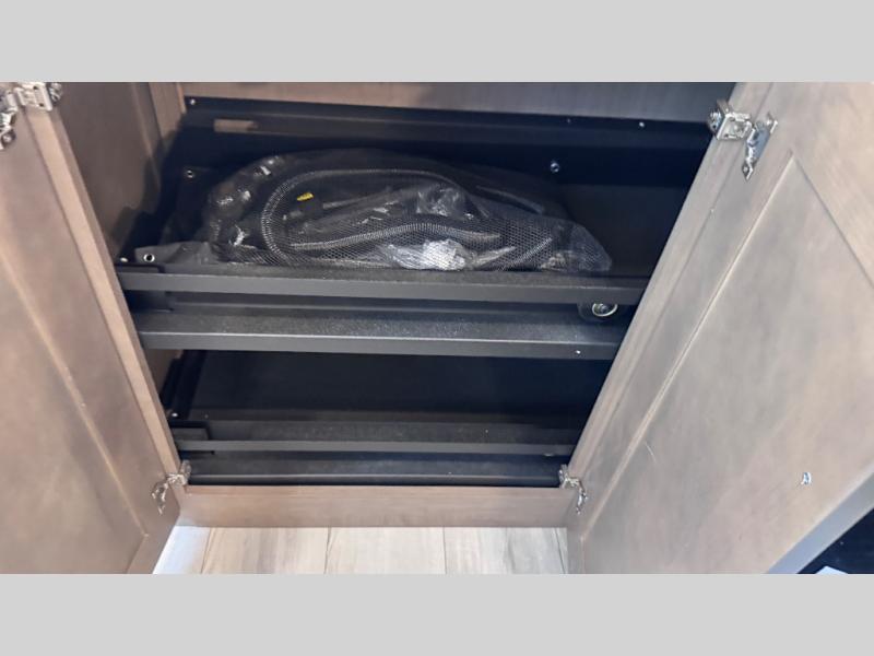 Experience the pinnacle of luxury fifth-wheel living! Retreat to the serene bedroom, featuring an electric tilt king bed with drawers under the bed, a spacious wardrobe, and washer/dryer prep. Enjoy entertainment on the 39” Smart LED TV and ample storage in the dresser. The gourmet kitchen is equipped with a pantry, 26 cu. refrigerator, convection microwave, and sliding table/desk for effortless dining and work-from-home convenience. The living room is a haven of relaxation, boasting a stunning 65” Smart LED TV, warm fireplace, theater seating, and double hide-a-bed sofas ideal for hosting guests with ease. Unwind in style in the full bathroom, featuring a dual sink vanity and ample storage. Also, enjoy the convenience of two entry/two exit doors. This fifth wheel is a masterpiece of comfort, style, and functionality, perfect for full-time living.